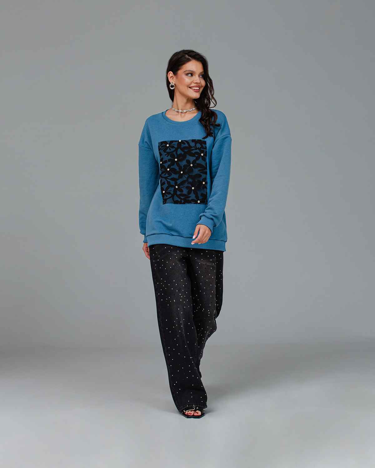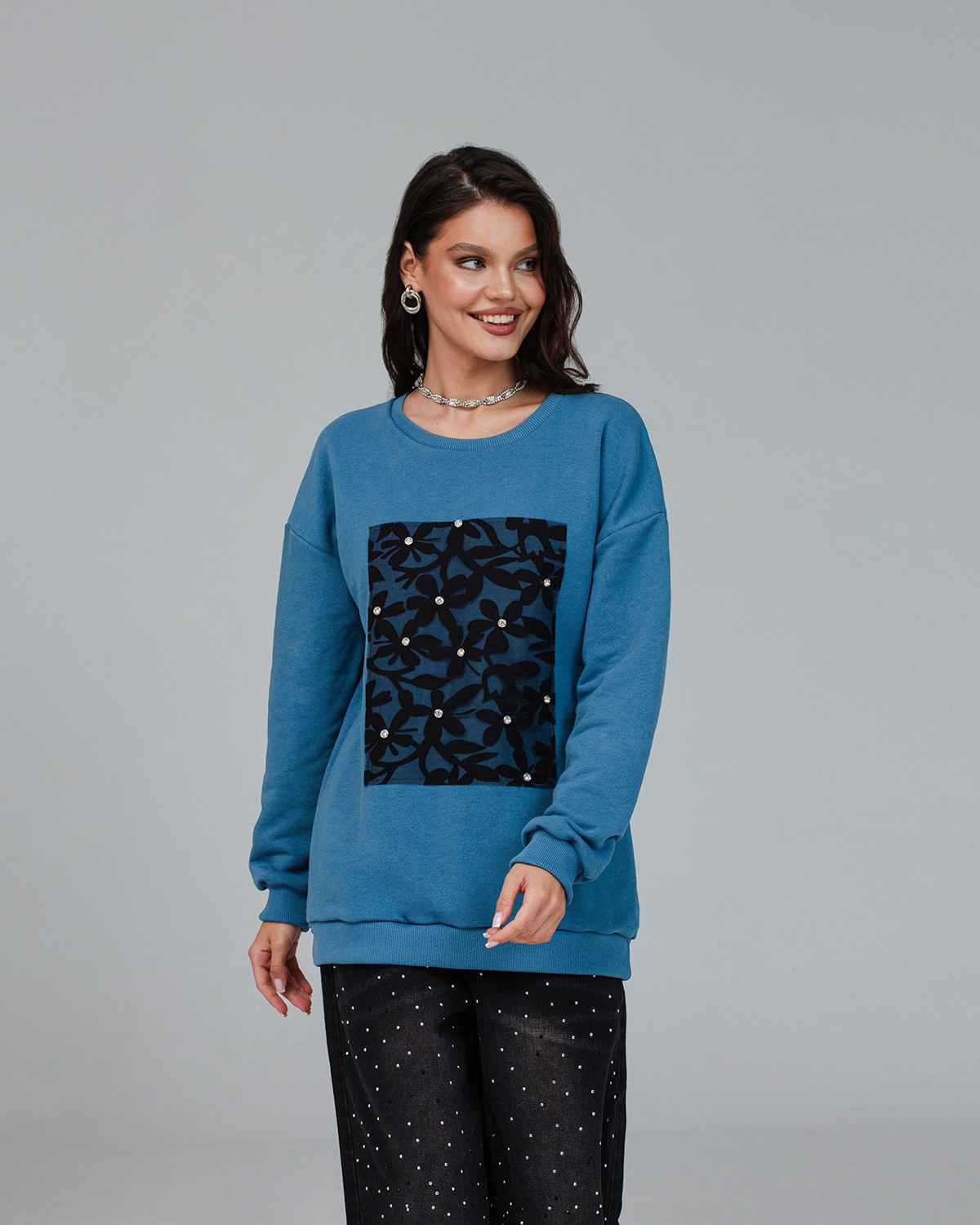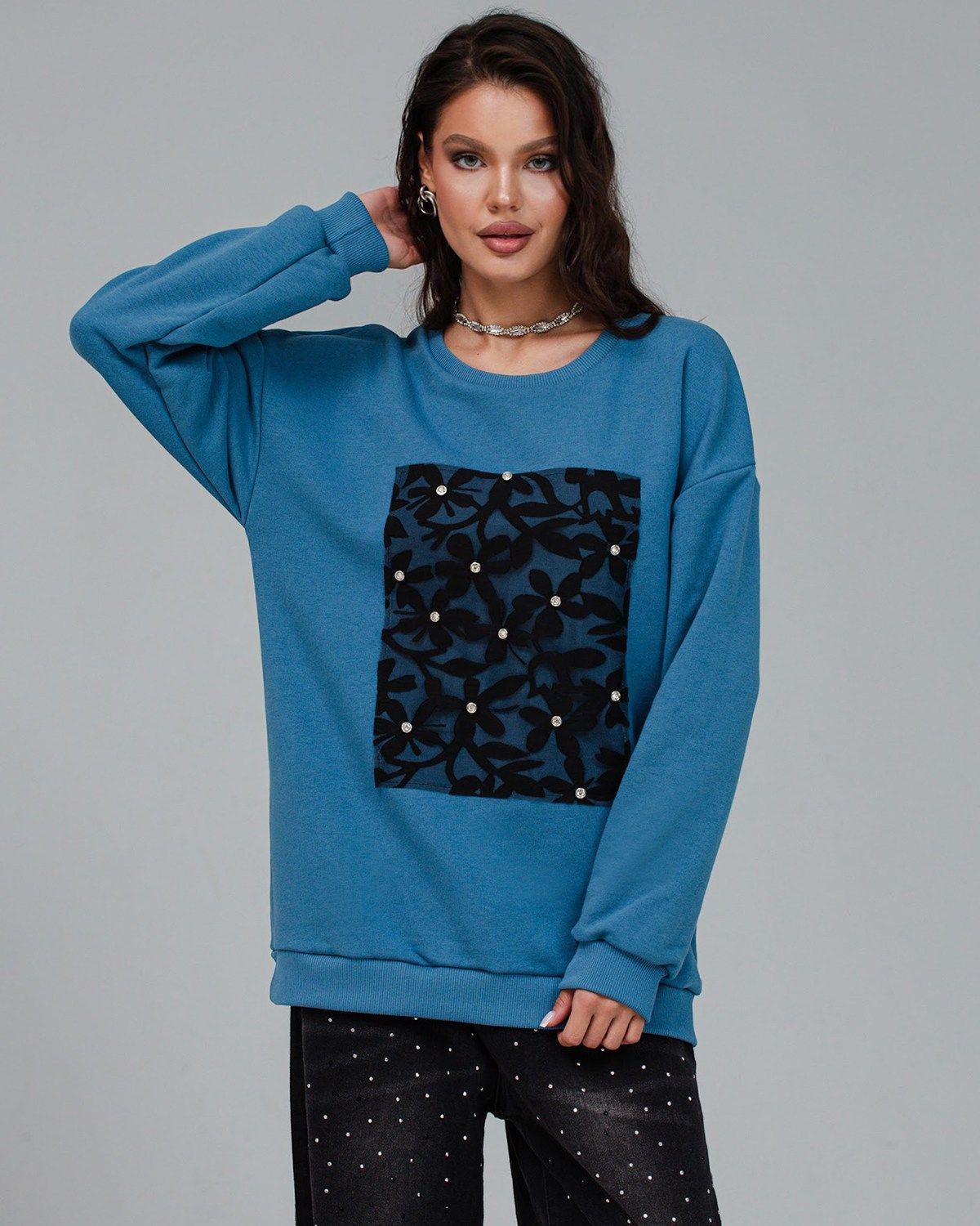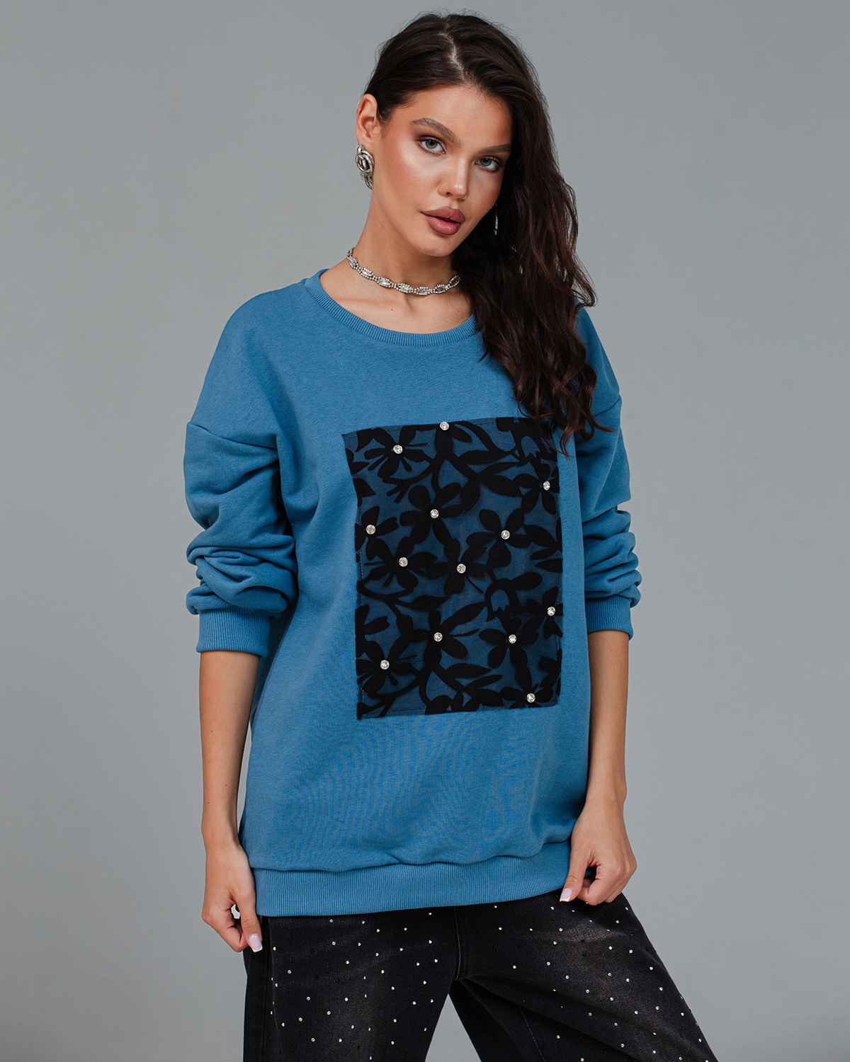 Cвитшот является одним из универсальных предметов гардероба и не имеет привязки к трендам. Это идеальный выбор для тех, кто хочет выглядеть стильно и красиво каждый день. Свитшот из хлопка в оттенке “синий капри” с ажурной вставкой, украшенной кристаллами, подойдет как для работы, так и нарядного образа. Свитшот выглядит очень женственно и эффектно, станет вашим идеальным дополнением к любому образу, а также подарит комфорт и удобство. Удлиненный фасон и оверсайз крой подойдут для любого типа фигуры.