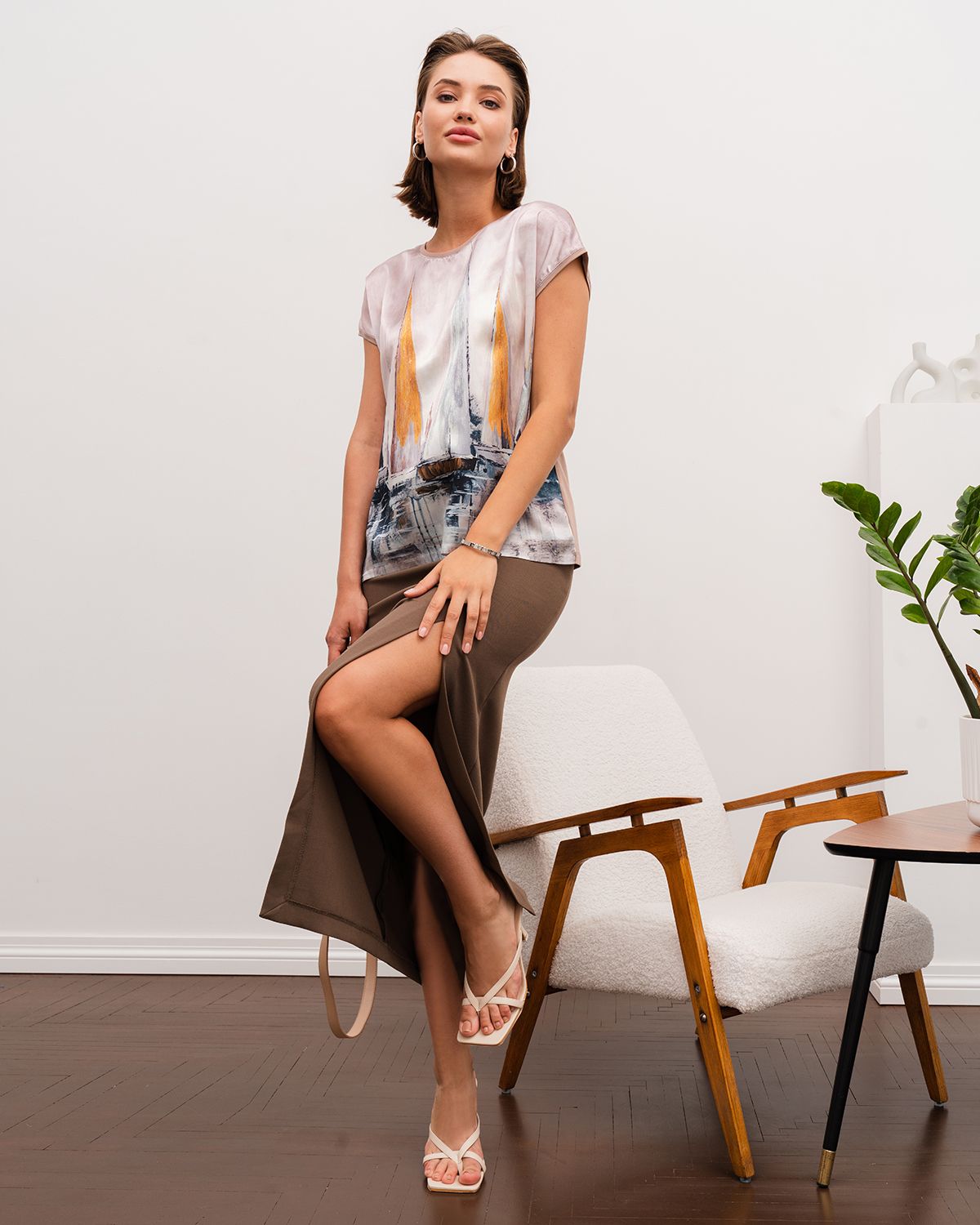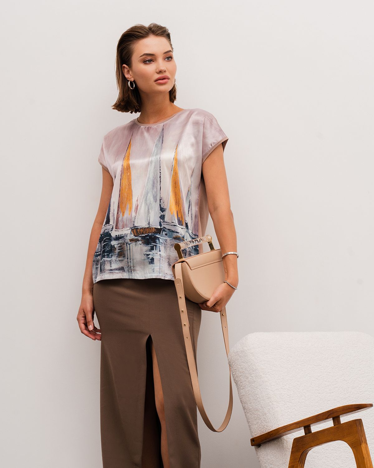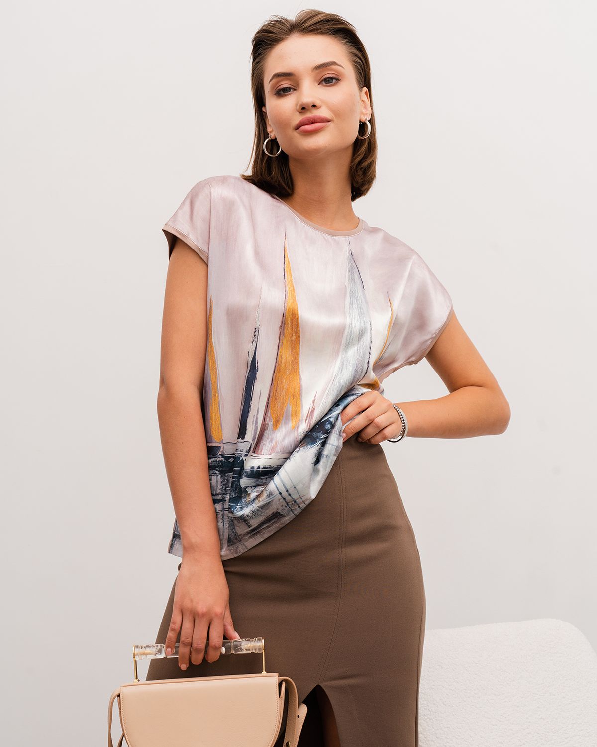 Спереди туника с принтом сделана из атласного шелка, который имеет благородный блеск. Спинка изделия - из эластичного трикотажа, который компенсирует то, что шёлк не тянущийся материал, и обеспечивает хорошую посадку.
