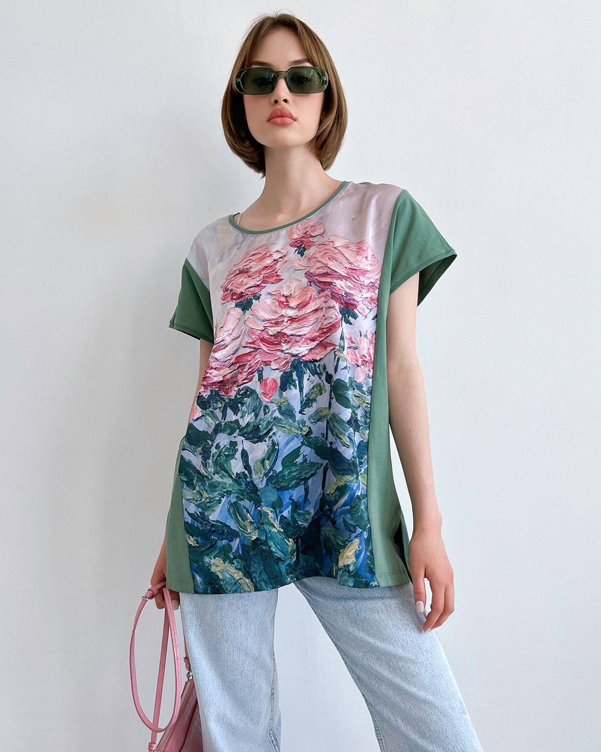 Туника женская сделана из премиальной хлопковой кулирки, а основой под принт стала шелковая вставка. Эти ткани можно спокойно стирать в стиральной машинке, они сохраняют свой вид надолго.