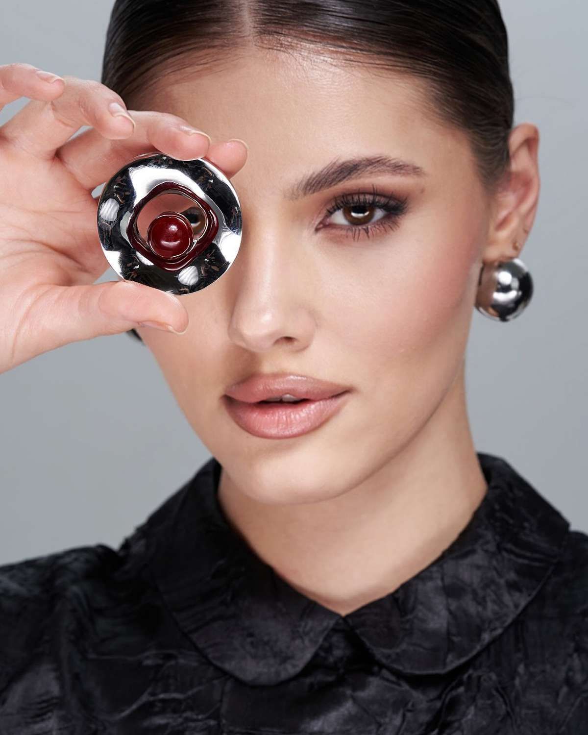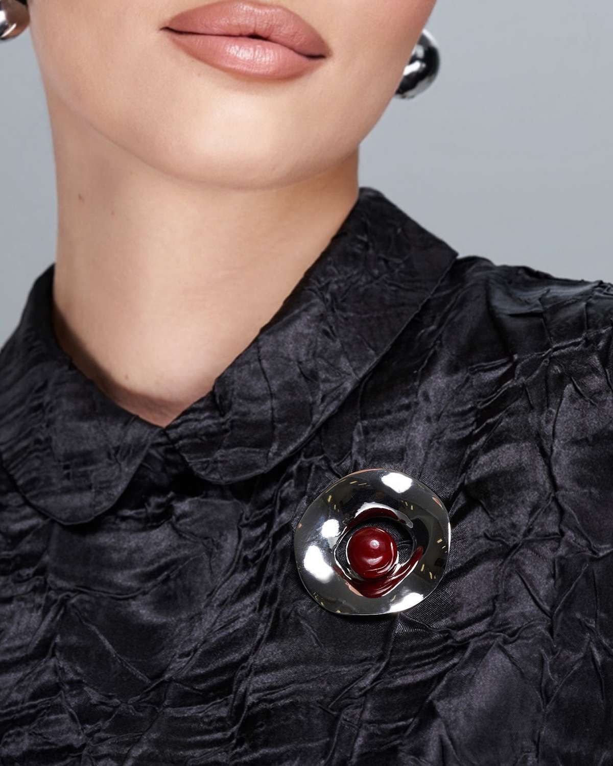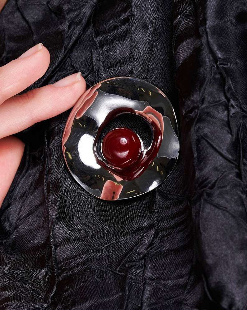 Круглая брошь-булавка, воплощение современной элегантности. В основе дизайна – окружность из полированной нержавеющей стали, сияющей холодным блеском. Акцент круглой броши – изящный шар, словно парящий в центре. Сердцем композиции выступает крупная бусина, притягивающая взгляд своим глубоким бордовым цветом и безупречной формой.