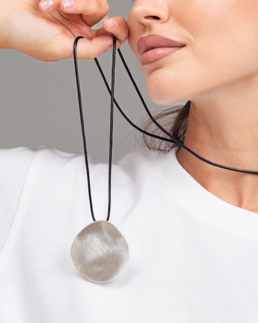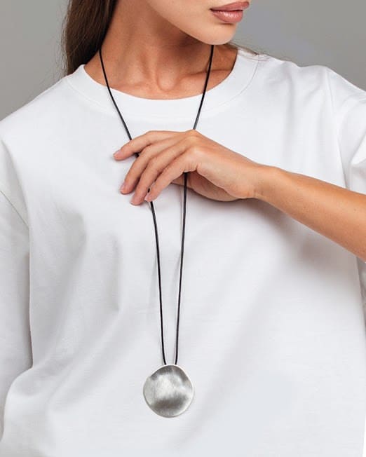 Наше длинное колье с эффектом царапин и текстурой брашированного металла станет идеальным дополнением к вашему стилю.