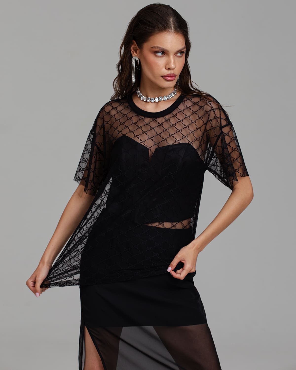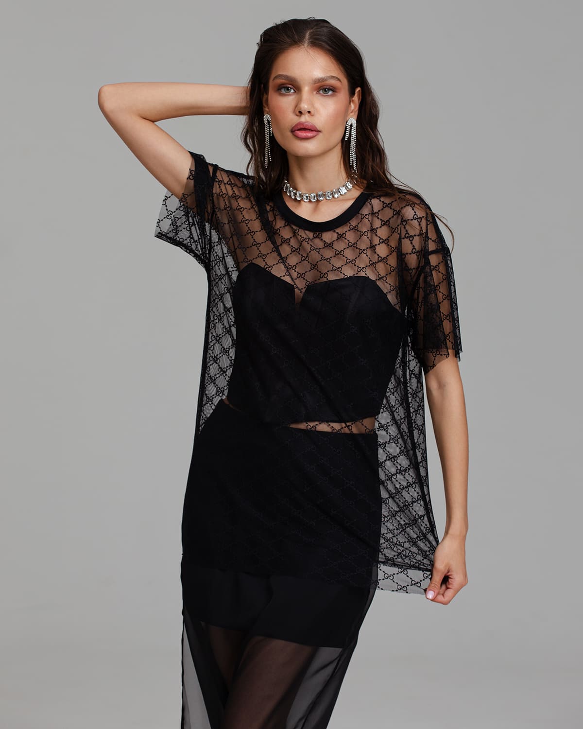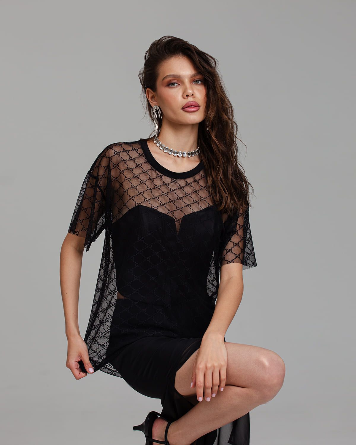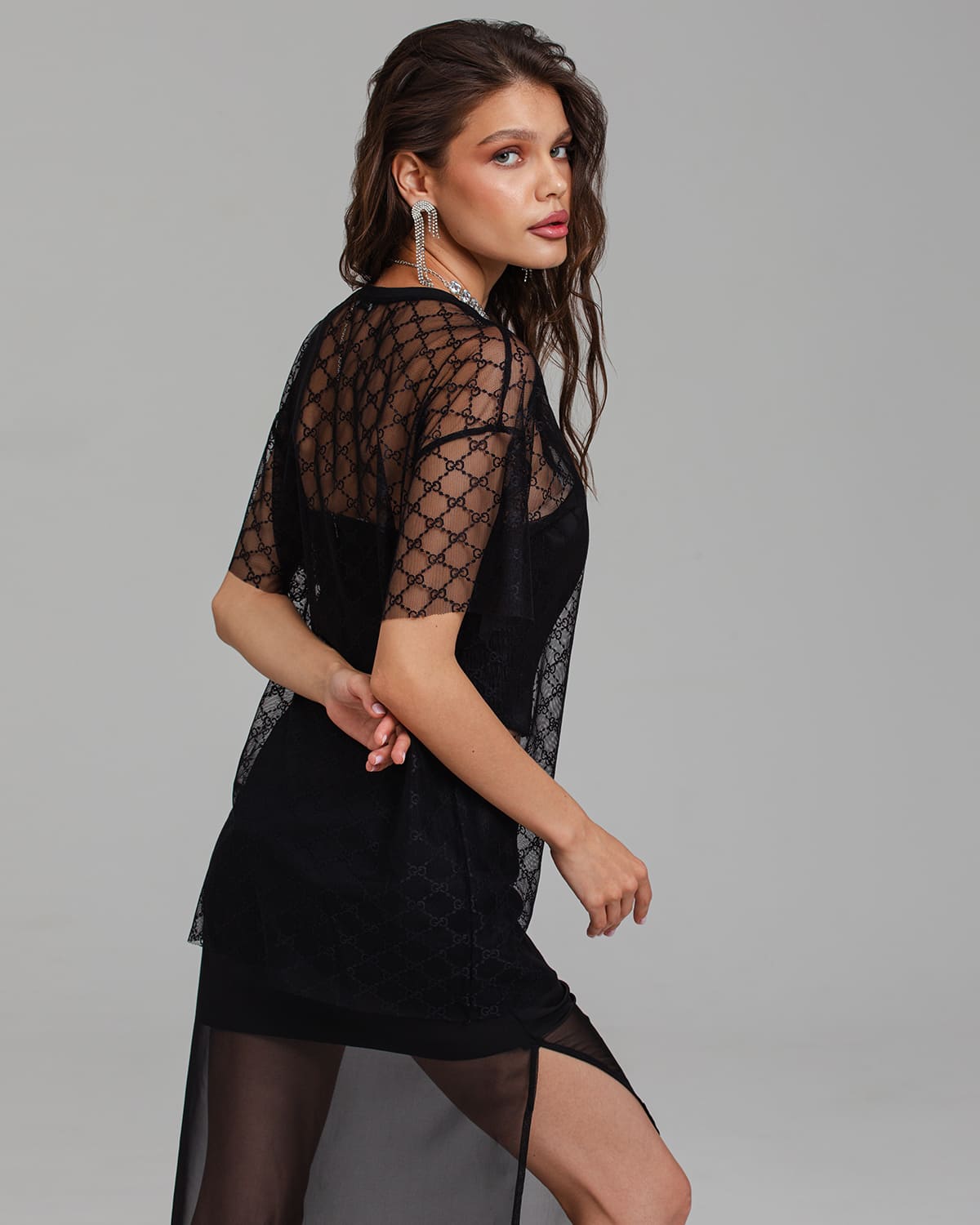 Футболка женская из полупрозрачной эластичной сетки с узором имеет свободный крой с эффектом оверсайз. Смотрится очень стильно и современно.