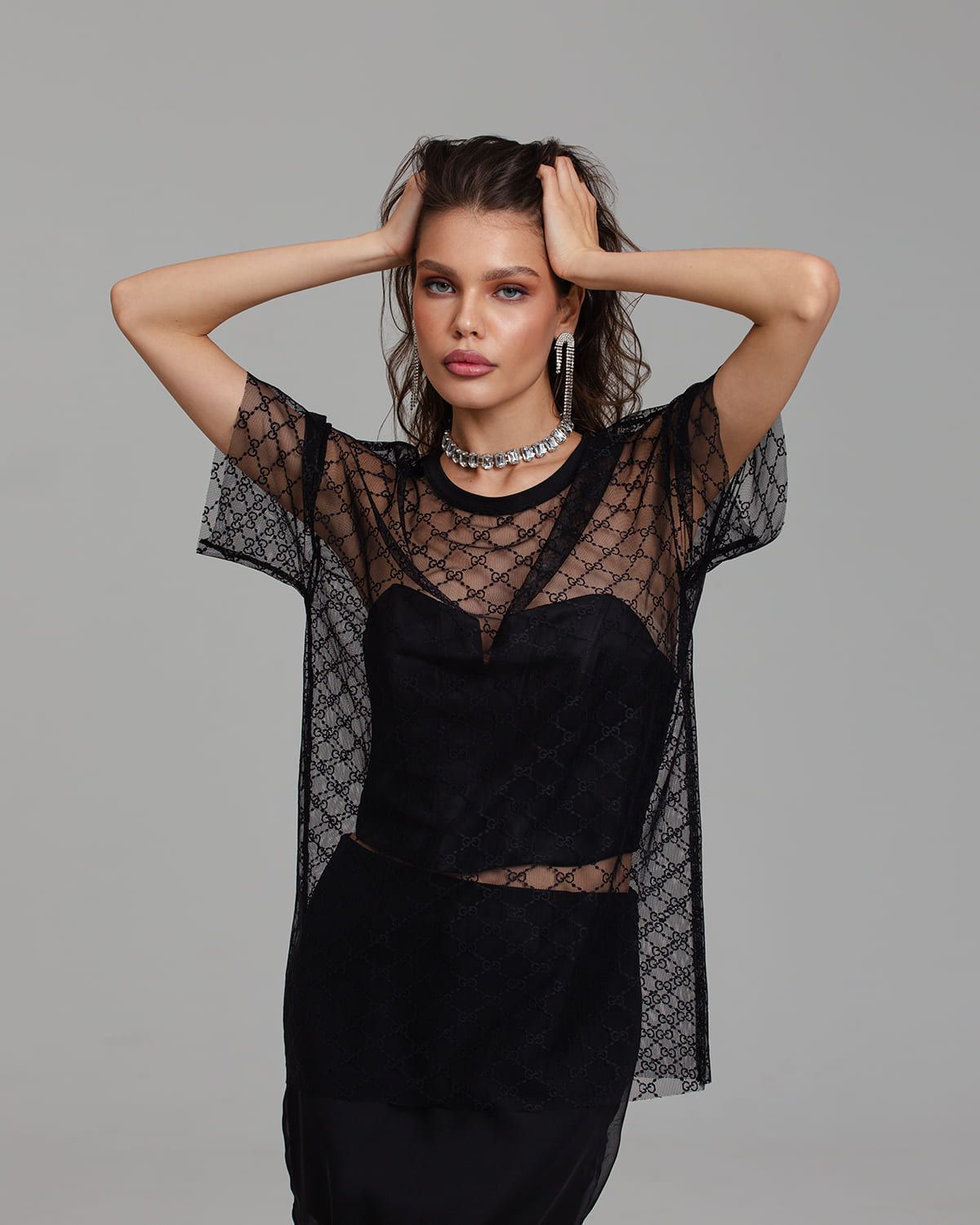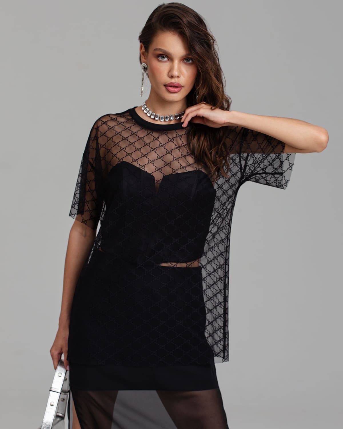 Самый явный тренд с подиумов — прозрачность. Мы, как всегда, обыграли его со своим видением. Получилась футболка из сетки с узором.