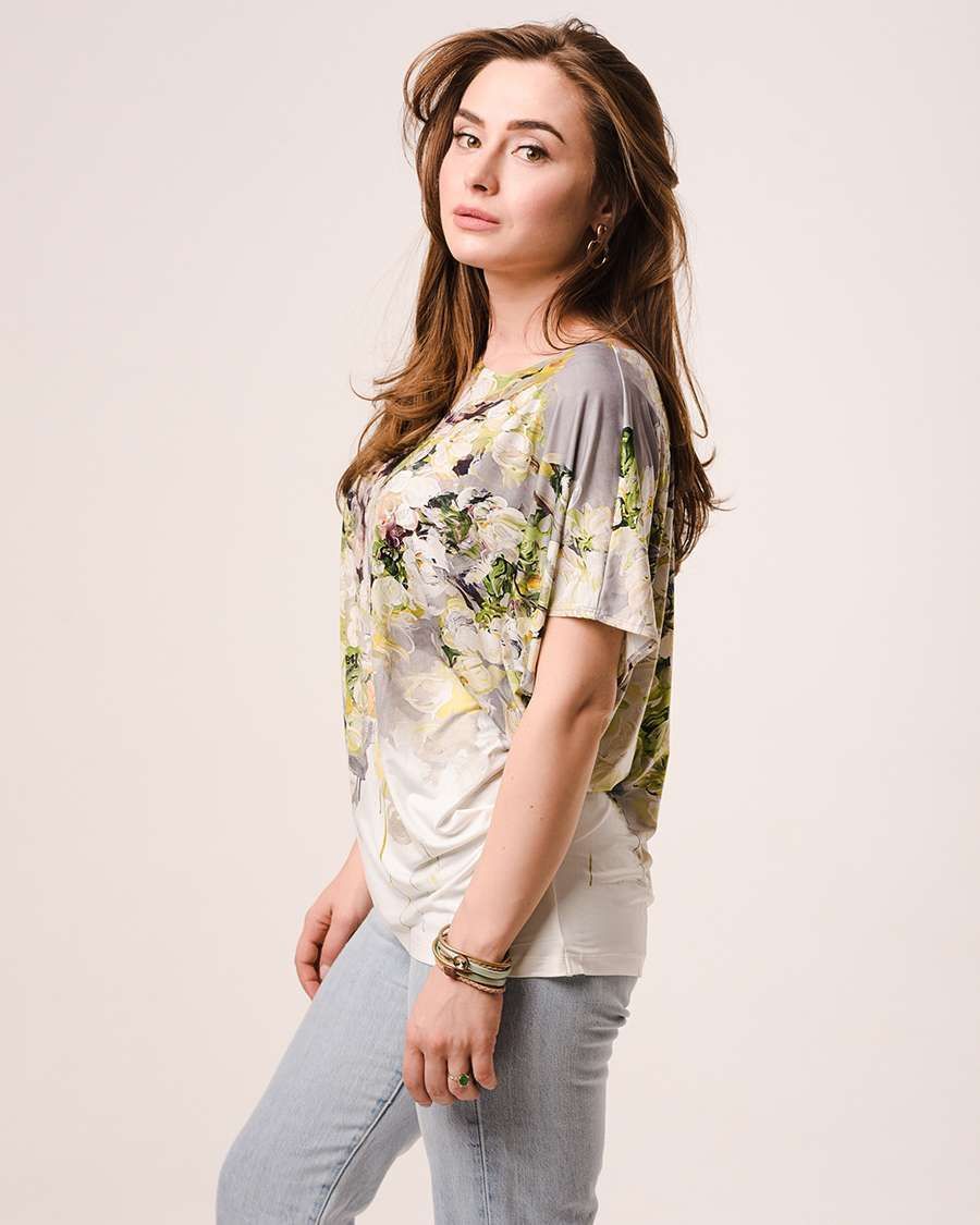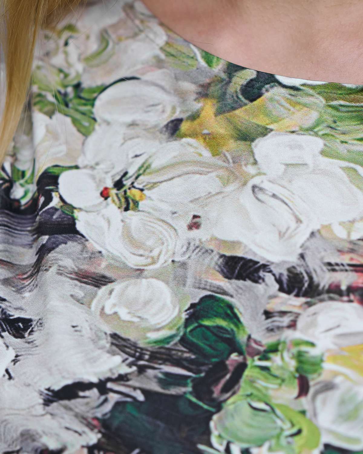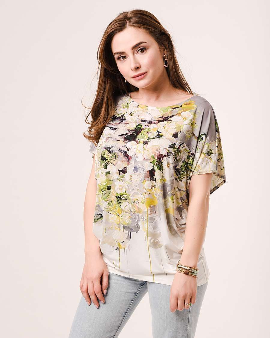 Футболка "Кимоно-баллон" из вискозной ткани "Венеция" с полной запечаткой авторским принтом. Это тонкий плотный трикотаж с матовой поверхностью, мягкий и шелковистый на ощупь, не образует катышков. Защипы чуть ниже талии позволяют скрыть проблемные зоны фигуры. Принт наносится таким образом, что краска введена в саму текстуру ткани и надежно там закреплена. Трикотаж остается эластичным, нет никаких слоев нанесения сверху ткани. Благодаря такой технологии рисунок остается ярким даже после многочисленных стирок.