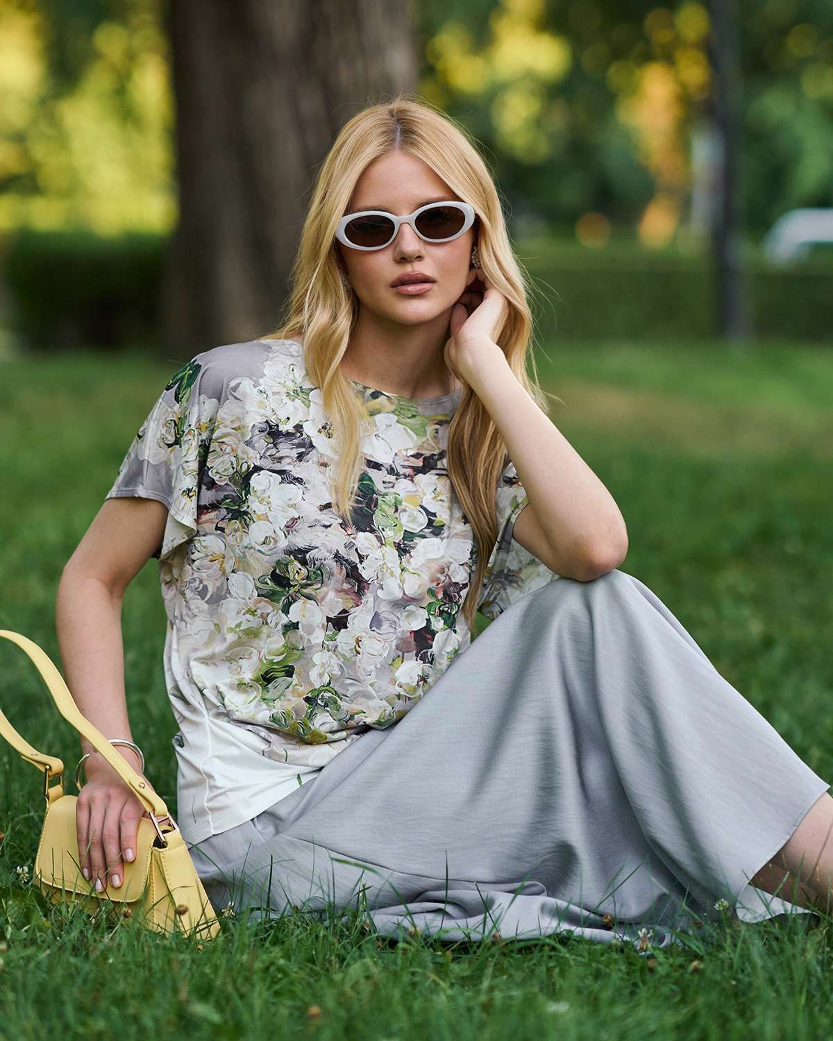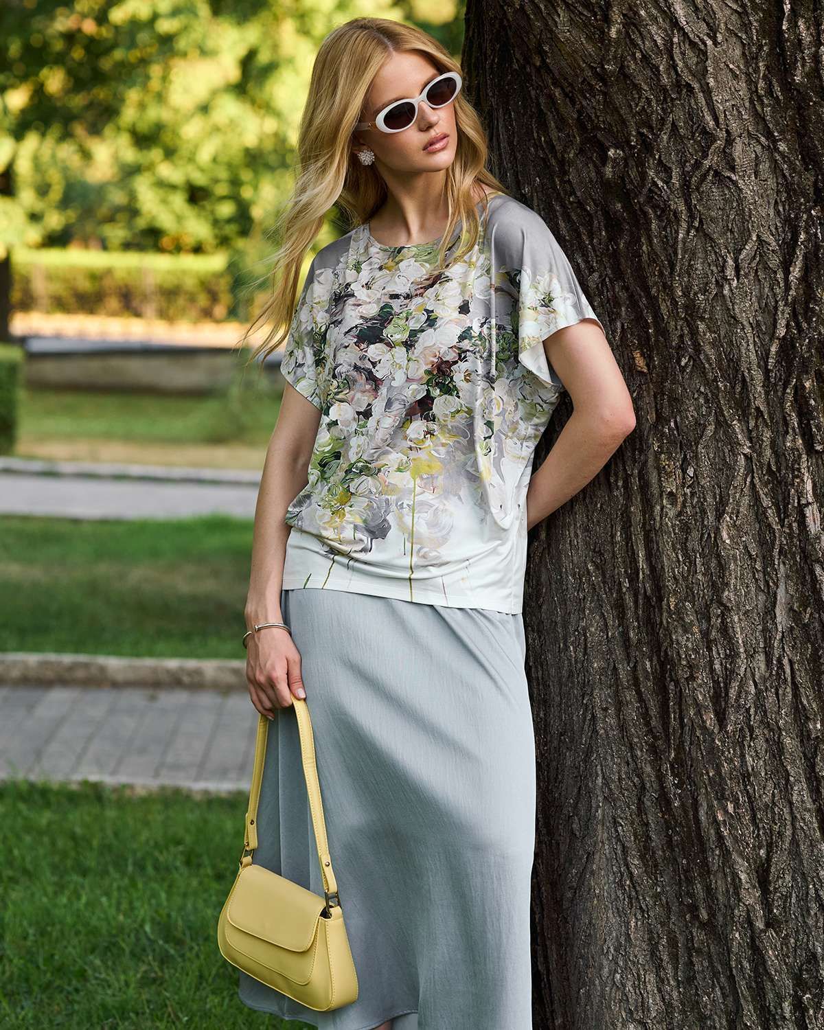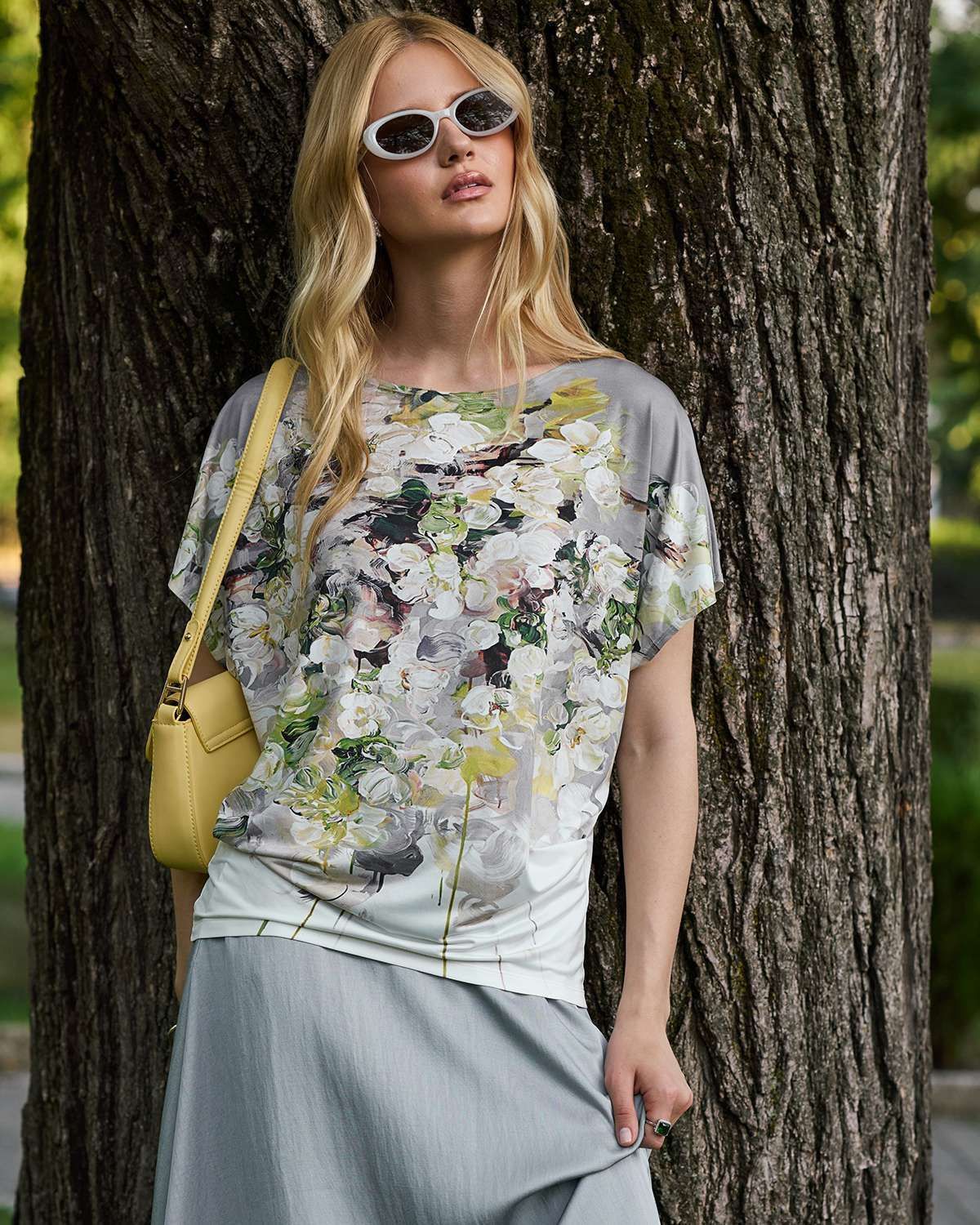 Футболка "Кимоно-баллон" из вискозной ткани "Венеция" с полной запечаткой авторским принтом. Это тонкий плотный трикотаж с матовой поверхностью, мягкий и шелковистый на ощупь, не образует катышков. Защипы чуть ниже талии позволяют скрыть проблемные зоны фигуры. Принт наносится таким образом, что краска введена в саму текстуру ткани и надежно там закреплена. Трикотаж остается эластичным, нет никаких слоев нанесения сверху ткани. Благодаря такой технологии рисунок остается ярким даже после многочисленных стирок.