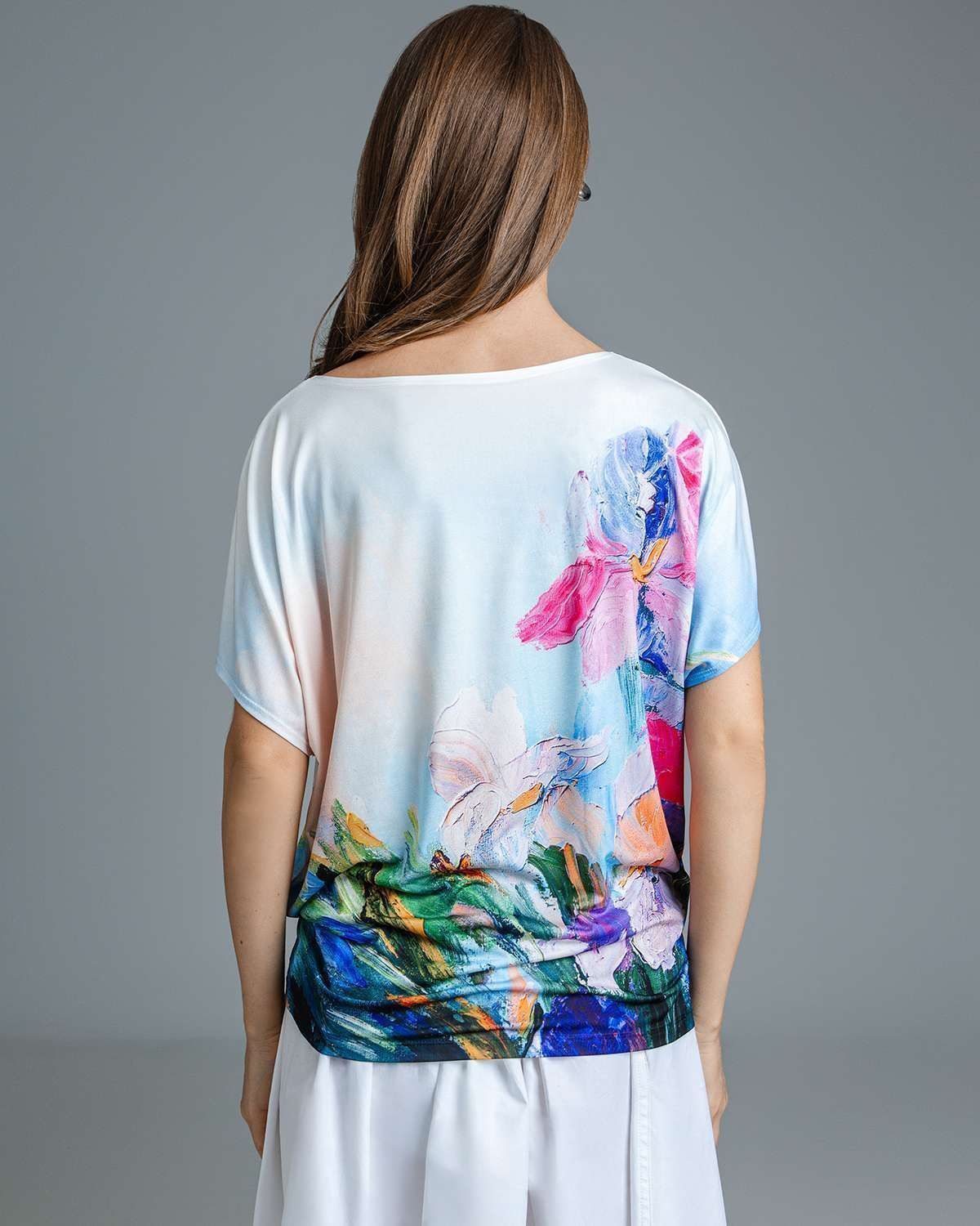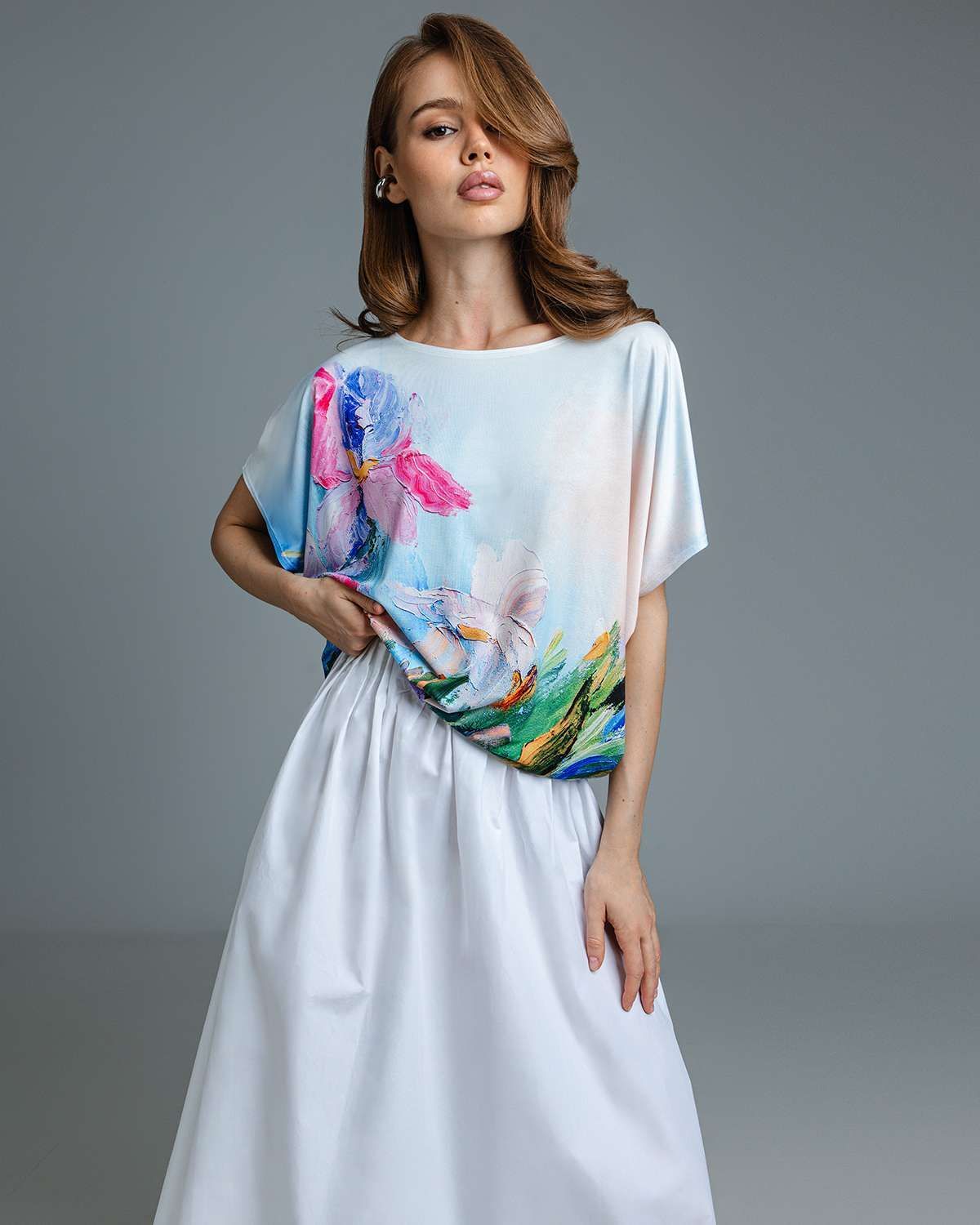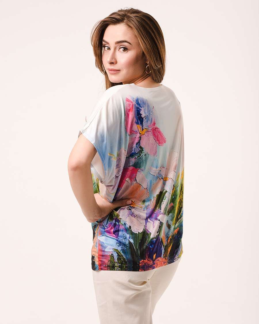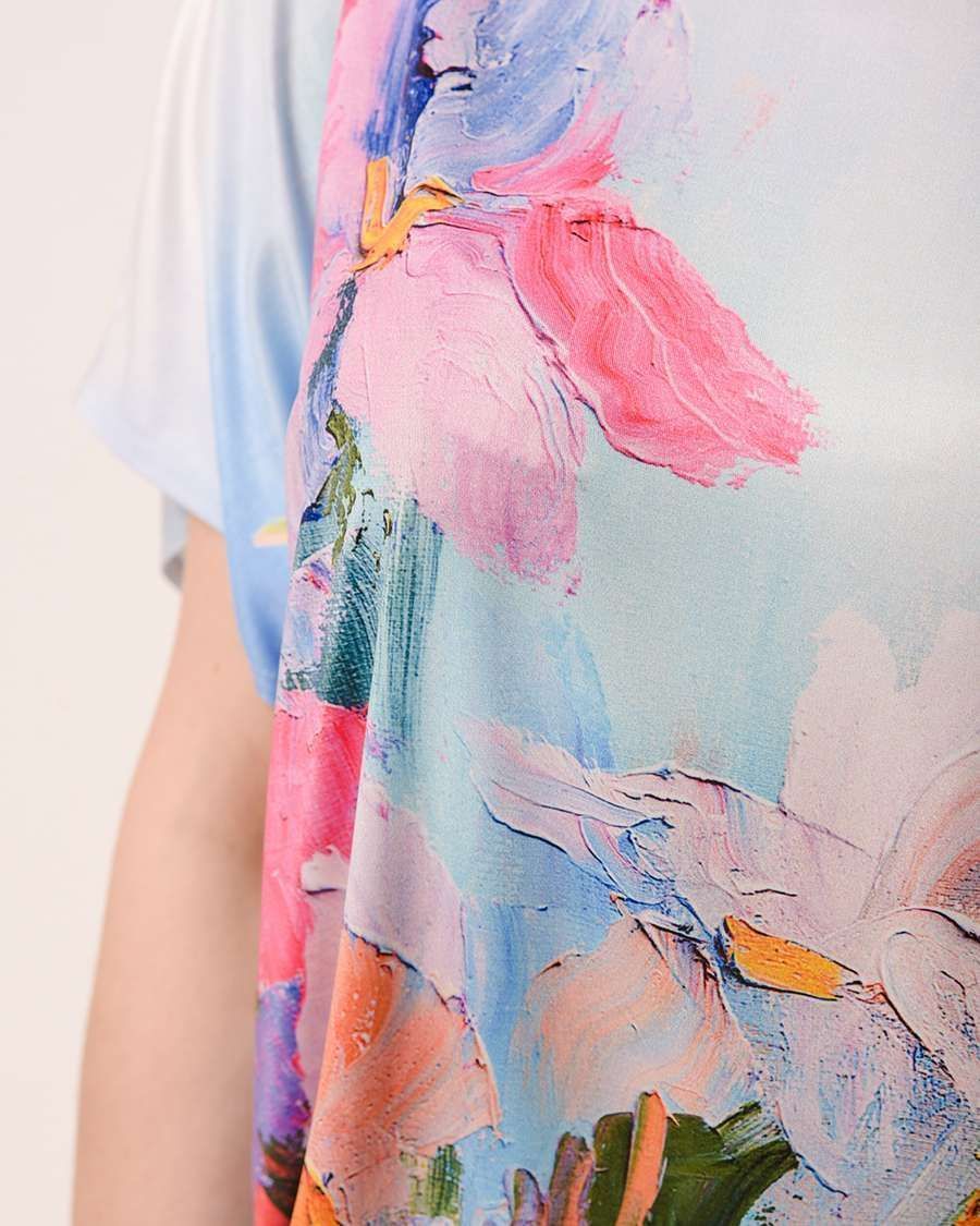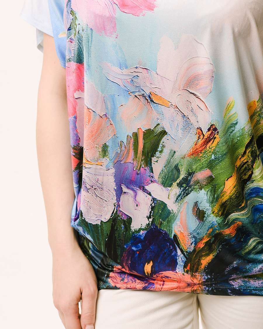 Футболка "Кимоно-баллон" из вискозной ткани "Венеция" с полной запечаткой авторским принтом. Это тонкий плотный трикотаж с матовой поверхностью, мягкий и шелковистый на ощупь, не образует катышков. Защипы чуть ниже талии позволяют скрыть проблемные зоны фигуры. Принт наносится таким образом, что краска введена в саму текстуру ткани и надежно там закреплена. Трикотаж остается эластичным, нет никаких слоев нанесения сверху ткани. Благодаря такой технологии рисунок остается ярким даже после многочисленных стирок.