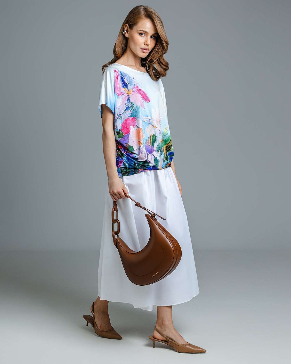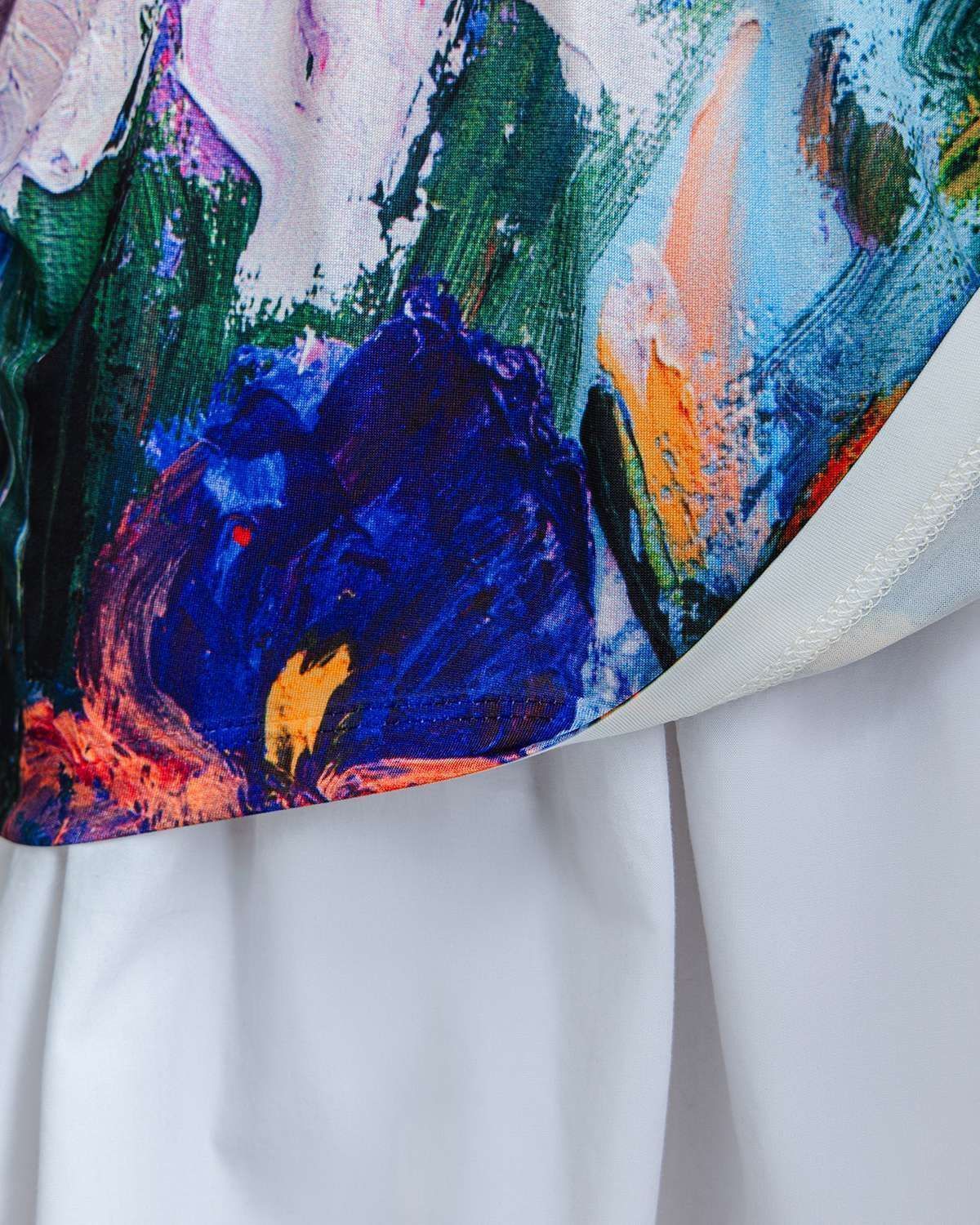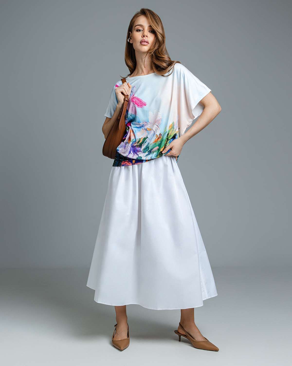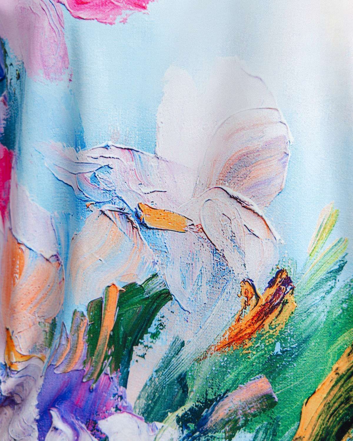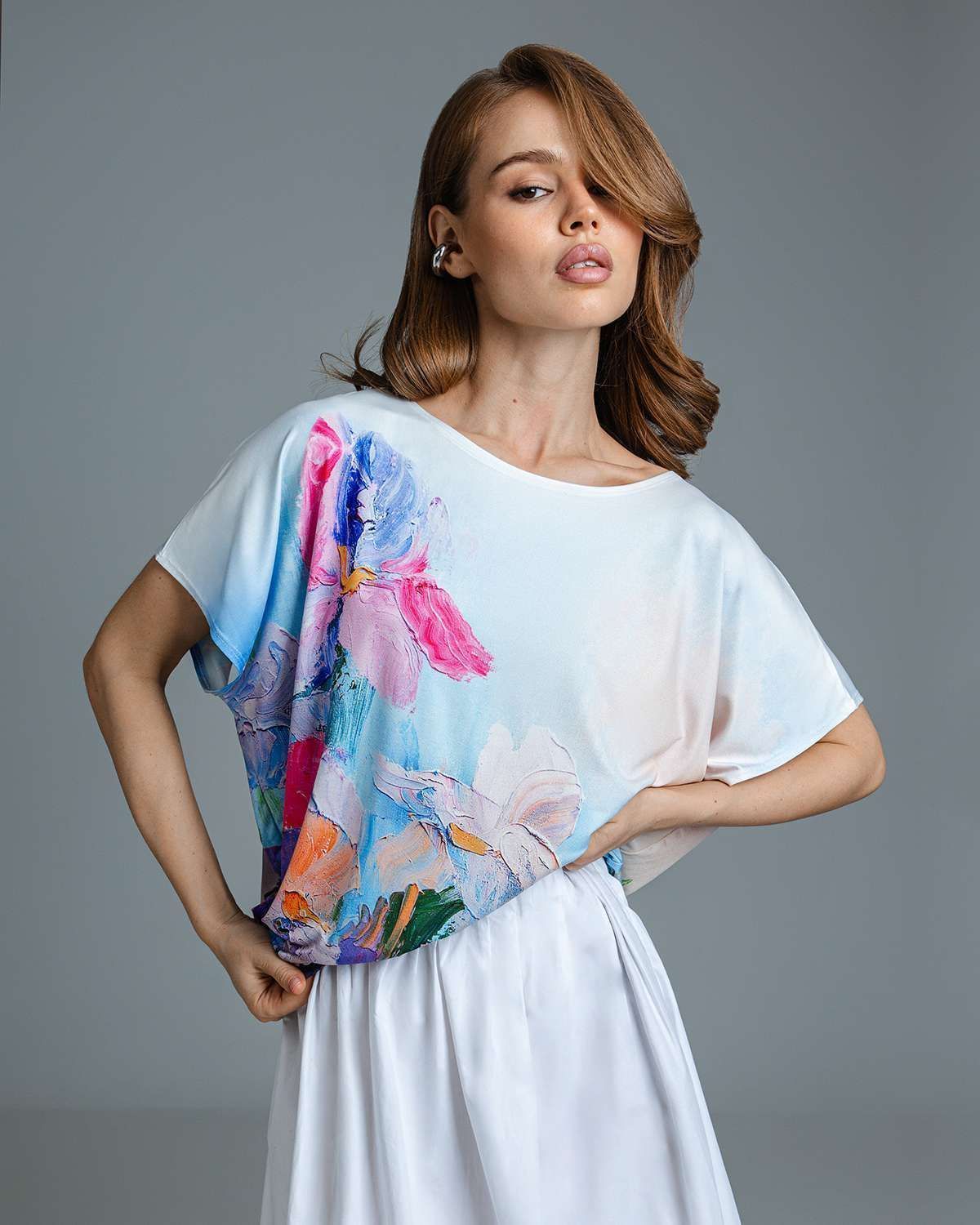 Футболка "Кимоно-баллон" из вискозной ткани "Венеция" с полной запечаткой авторским принтом. Это тонкий плотный трикотаж с матовой поверхностью, мягкий и шелковистый на ощупь, не образует катышков. Защипы чуть ниже талии позволяют скрыть проблемные зоны фигуры. Принт наносится таким образом, что краска введена в саму текстуру ткани и надежно там закреплена. Трикотаж остается эластичным, нет никаких слоев нанесения сверху ткани. Благодаря такой технологии рисунок остается ярким даже после многочисленных стирок.