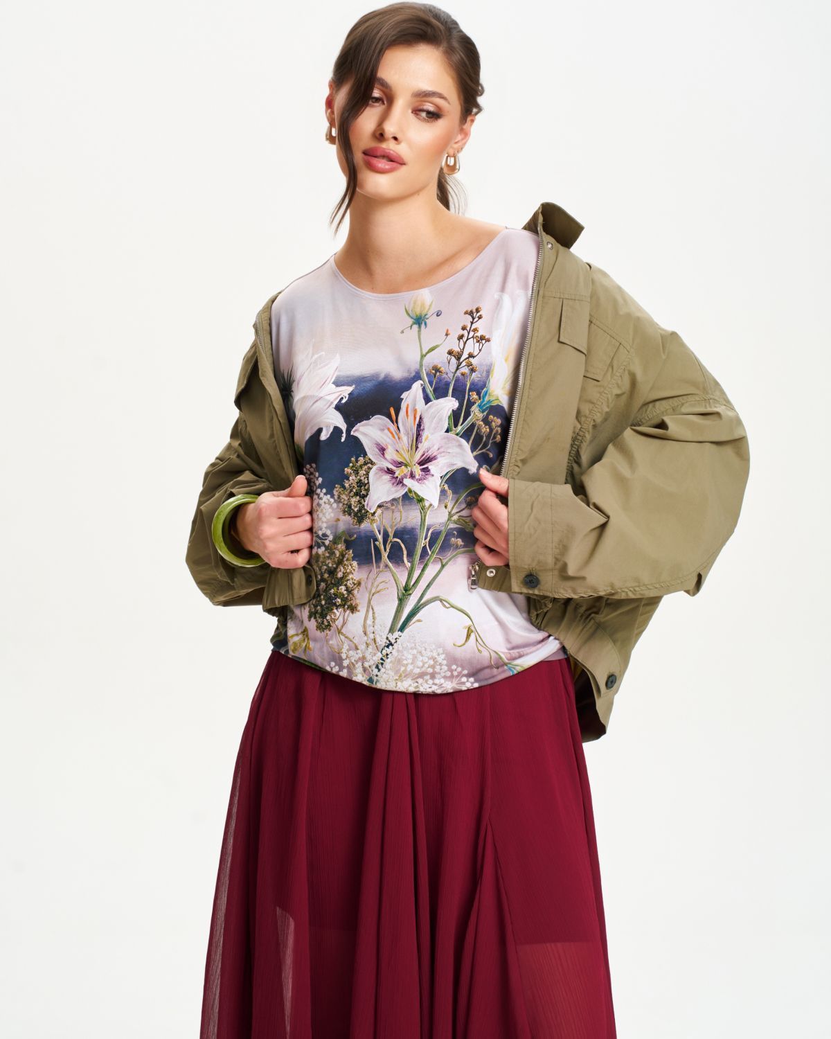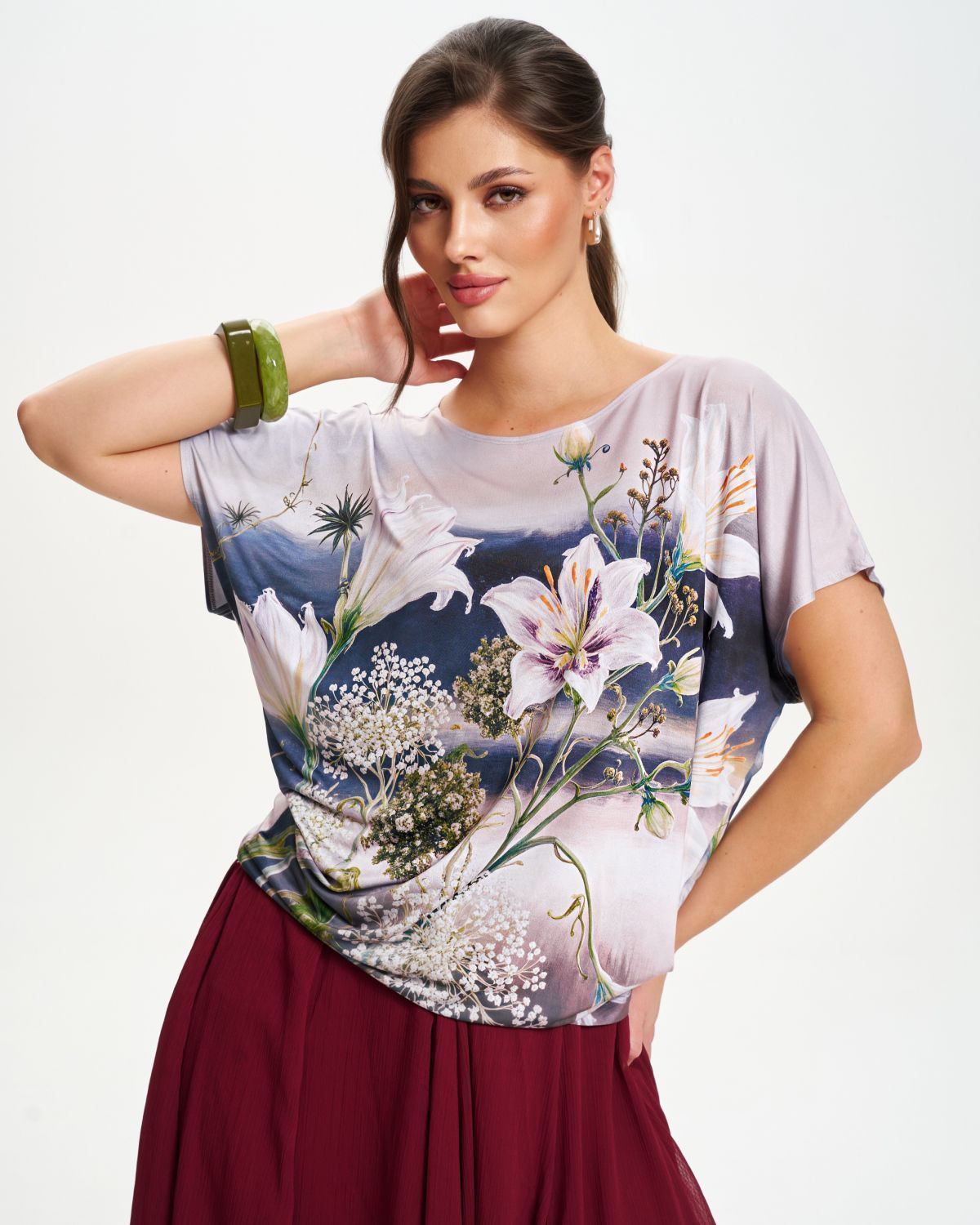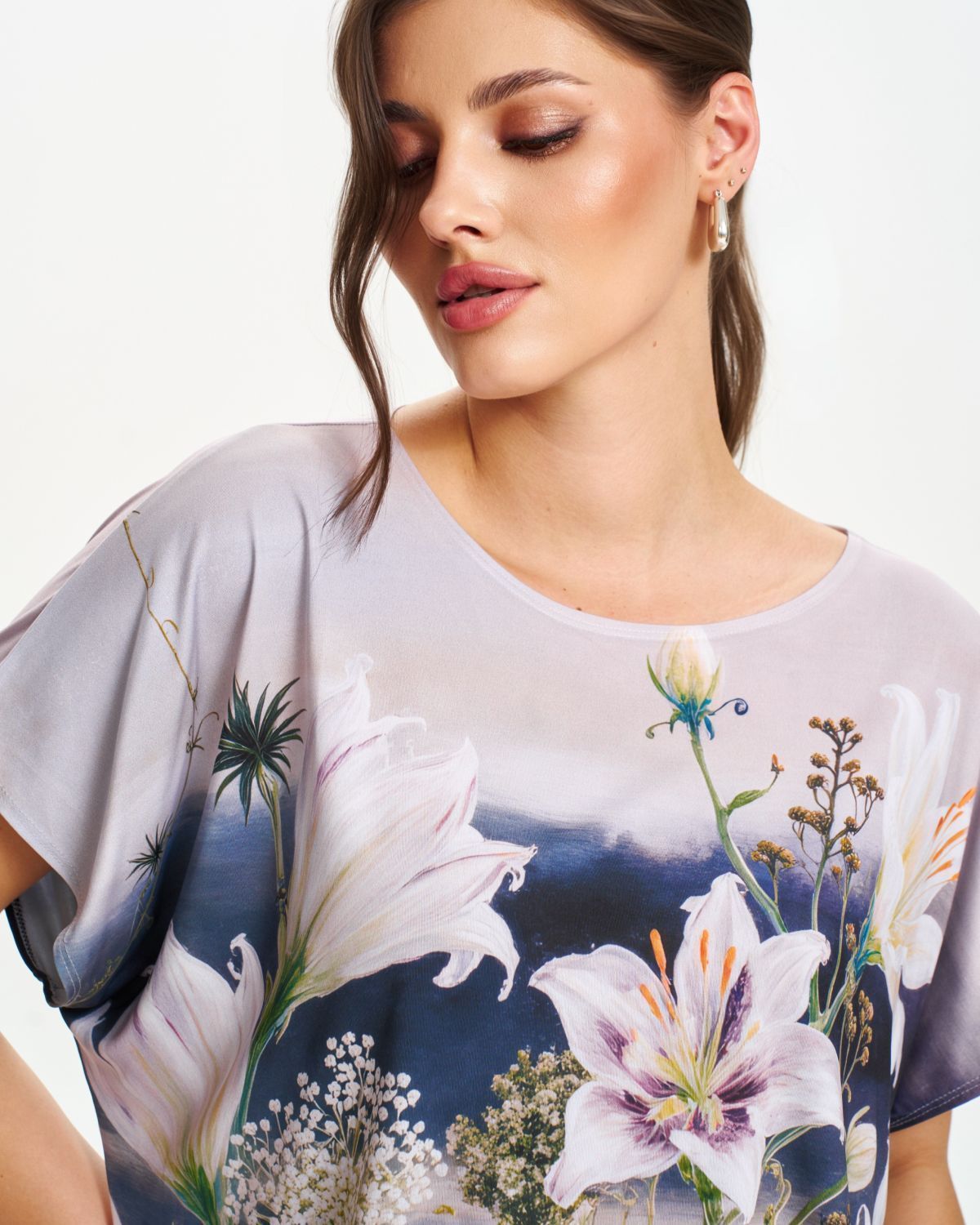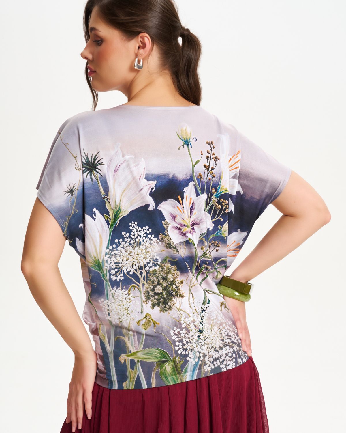 Футболка "Кимоно-баллон" из вискозной ткани "Венеция" с полной запечаткой авторским принтом. Это тонкий плотный трикотаж с матовой поверхностью, мягкий и шелковистый на ощупь, не образует катышков. Защипы чуть ниже талии позволяют скрыть проблемные зоны фигуры. Принт наносится таким образом, что краска введена в саму текстуру ткани и надежно там закреплена. Трикотаж остается эластичным, нет никаких слоев нанесения сверху ткани. Благодаря такой технологии рисунок остается ярким даже после многочисленных стирок.