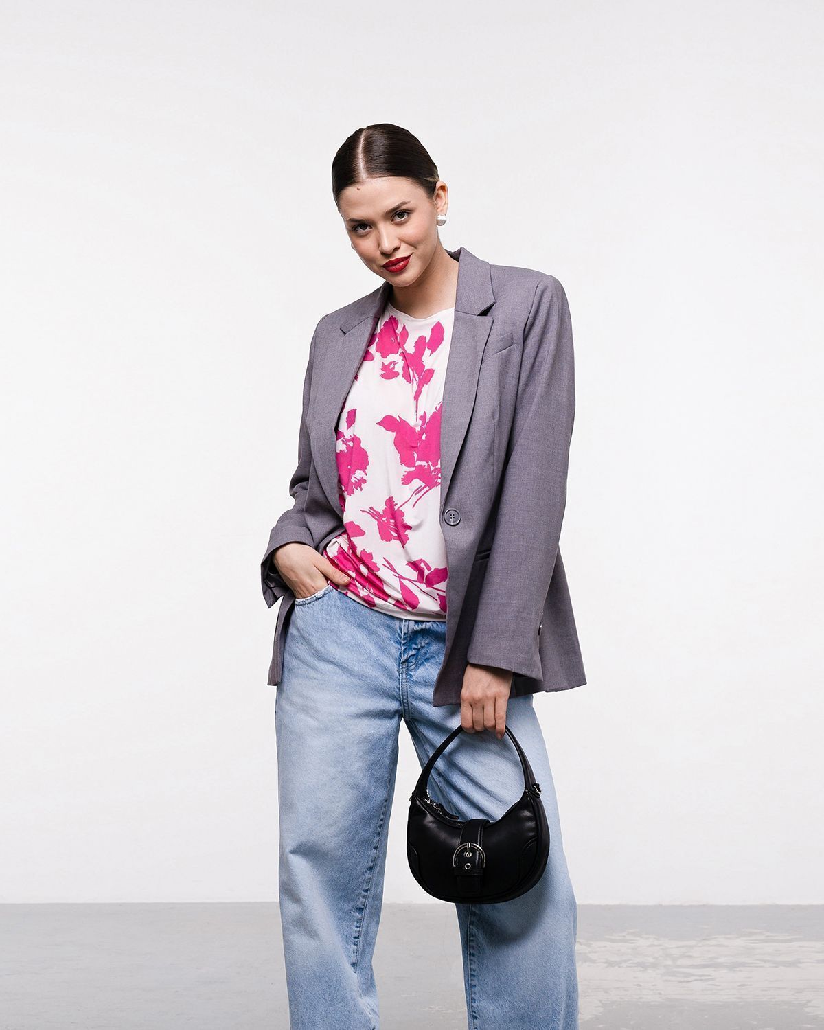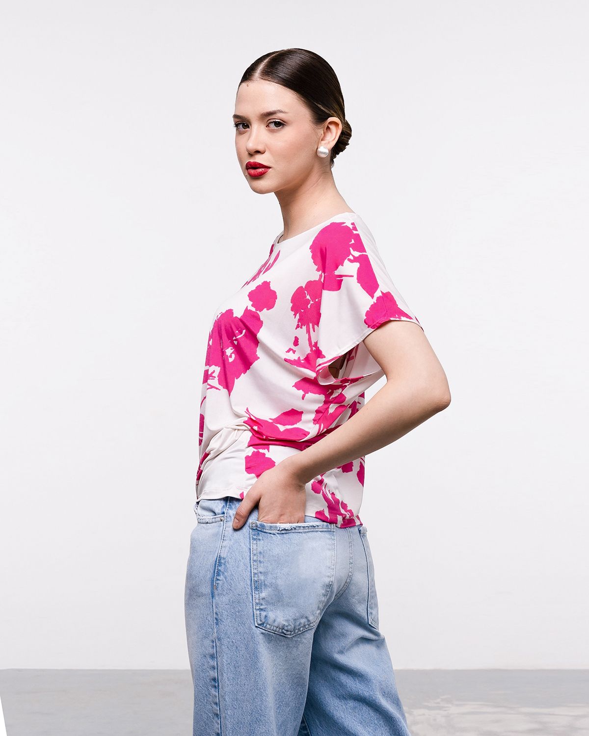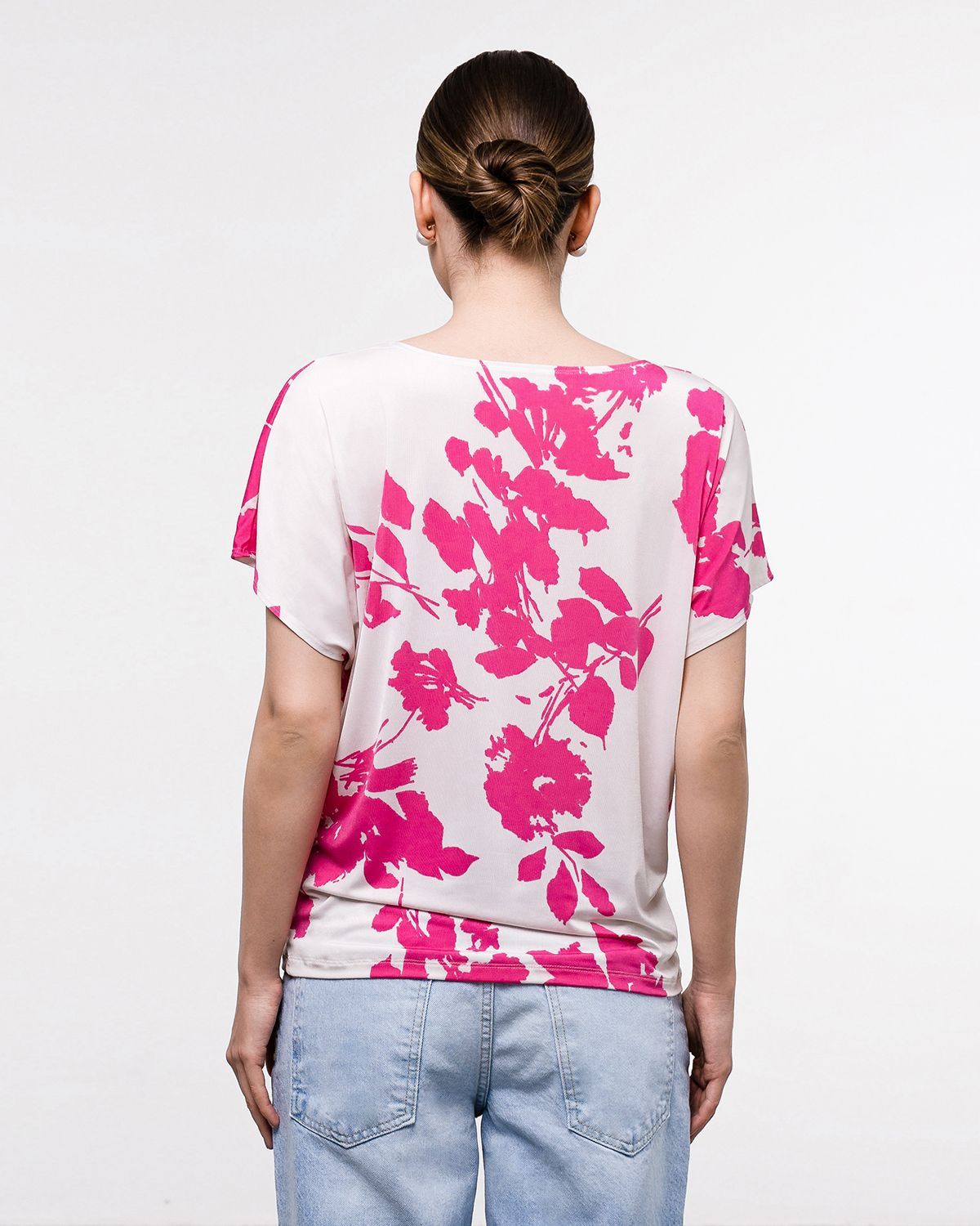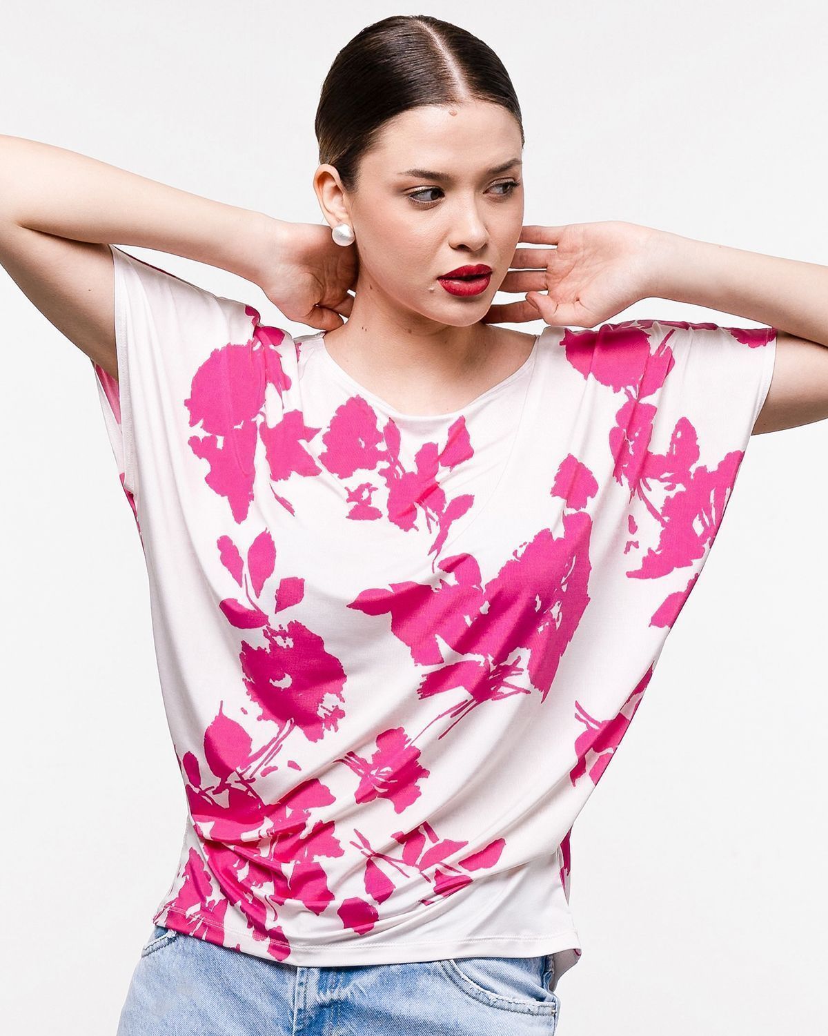 Футболка "Кимоно-баллон" из принтованной вискозной ткани "Венеция". Это тонкий плотный трикотаж с матовой поверхностью, мягкий и шелковистый на ощупь, не образует катышков. Защипы чуть ниже талии позволяют скрыть проблемные зоны фигуры.