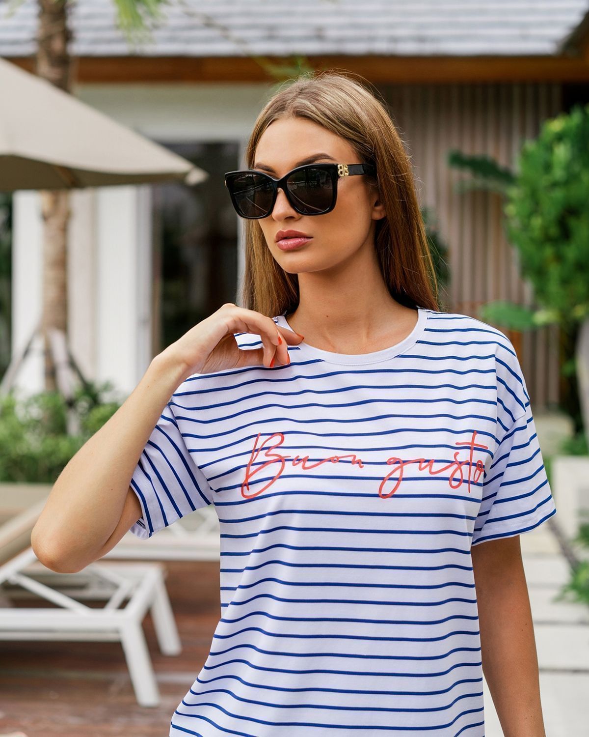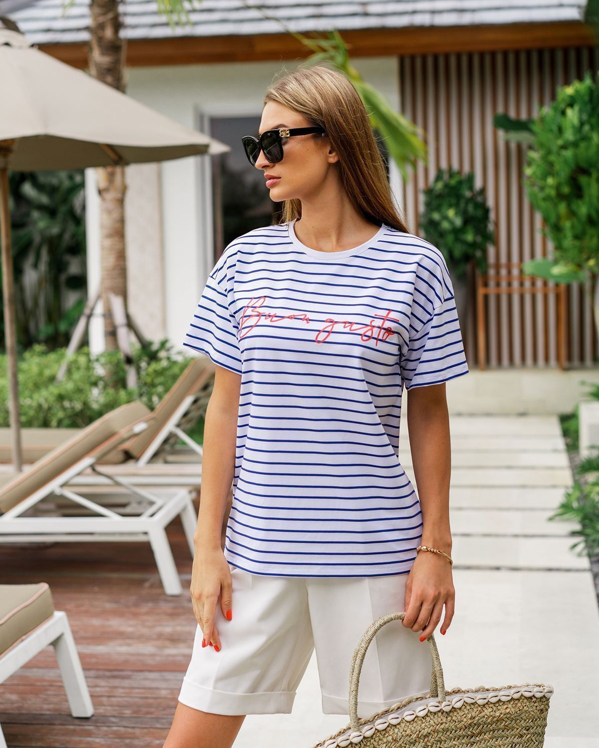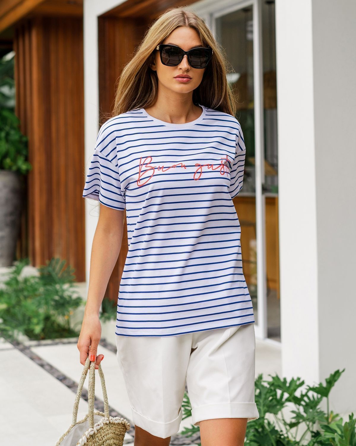 Футболка свободного кроя, которая станет прекрасным дополнением к базовому летнему гардеробу. Полоска актуальна всегда и подходит тем, кому скучно носить простые белые вещи. Футболка оверсайз кроя создает актуальный расслабленный образ. Рукава со спущенной линией плеча прекрасно дополняют его и делают так, что изделие отлично сидит на разных типах фигур. Широкие плечи или узкие — она одинаково хорошо будет смотреться на всех.