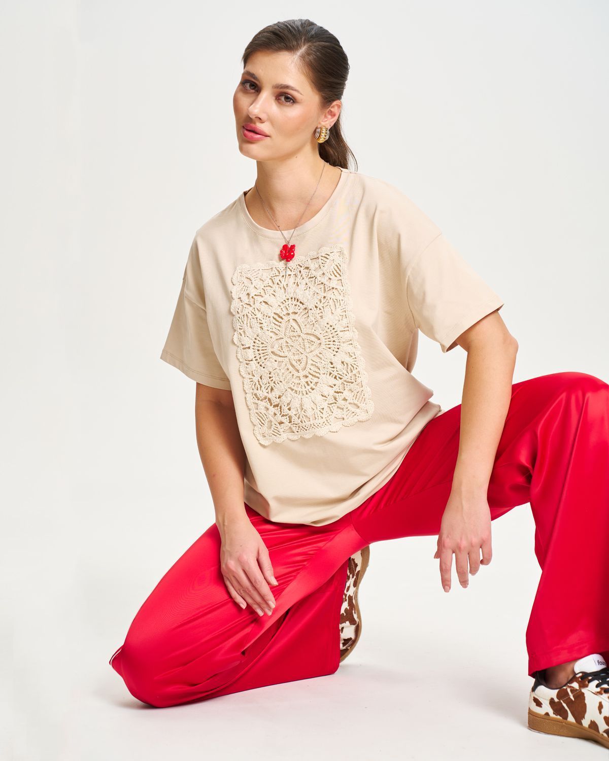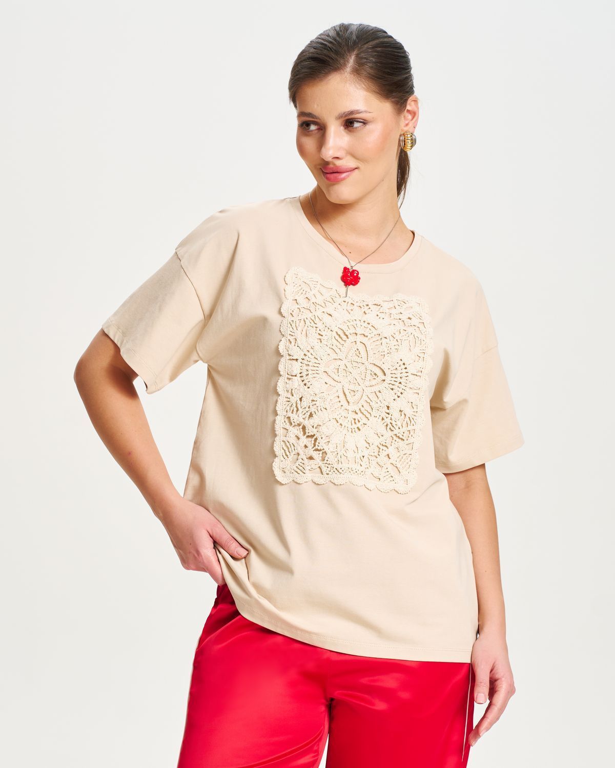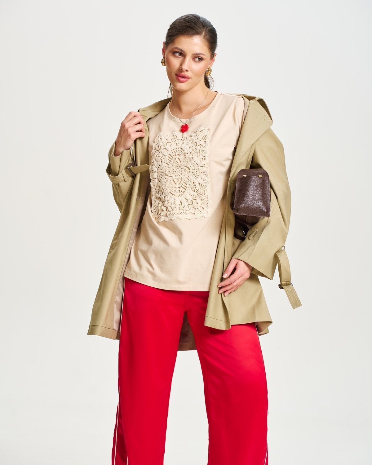 Главной особенностью модели стала нашитая впереди кружевная салфетка бежевого цвета. Она гармонично сочетается с оттенком ткани, создавая эффект деликатного ручного декора и добавляя нотку уюта. Такой элемент придаёт вещи индивидуальность и делает её заметной деталью образа.