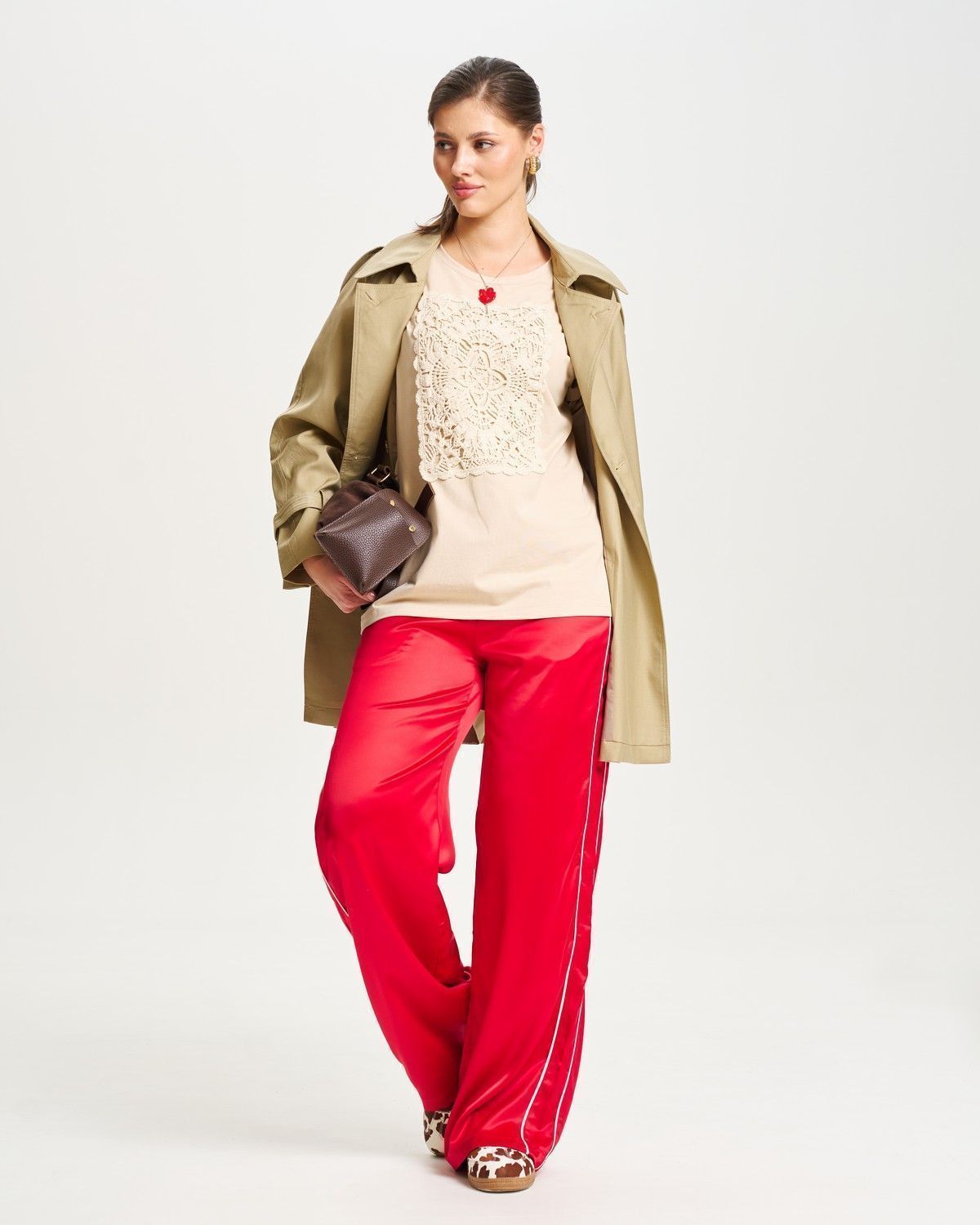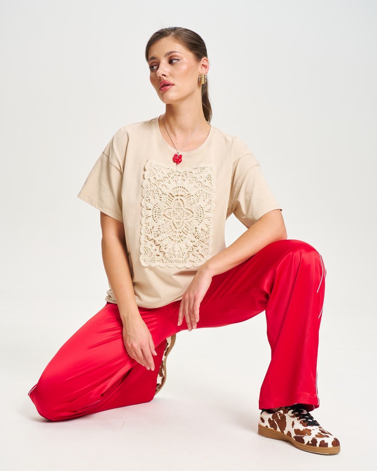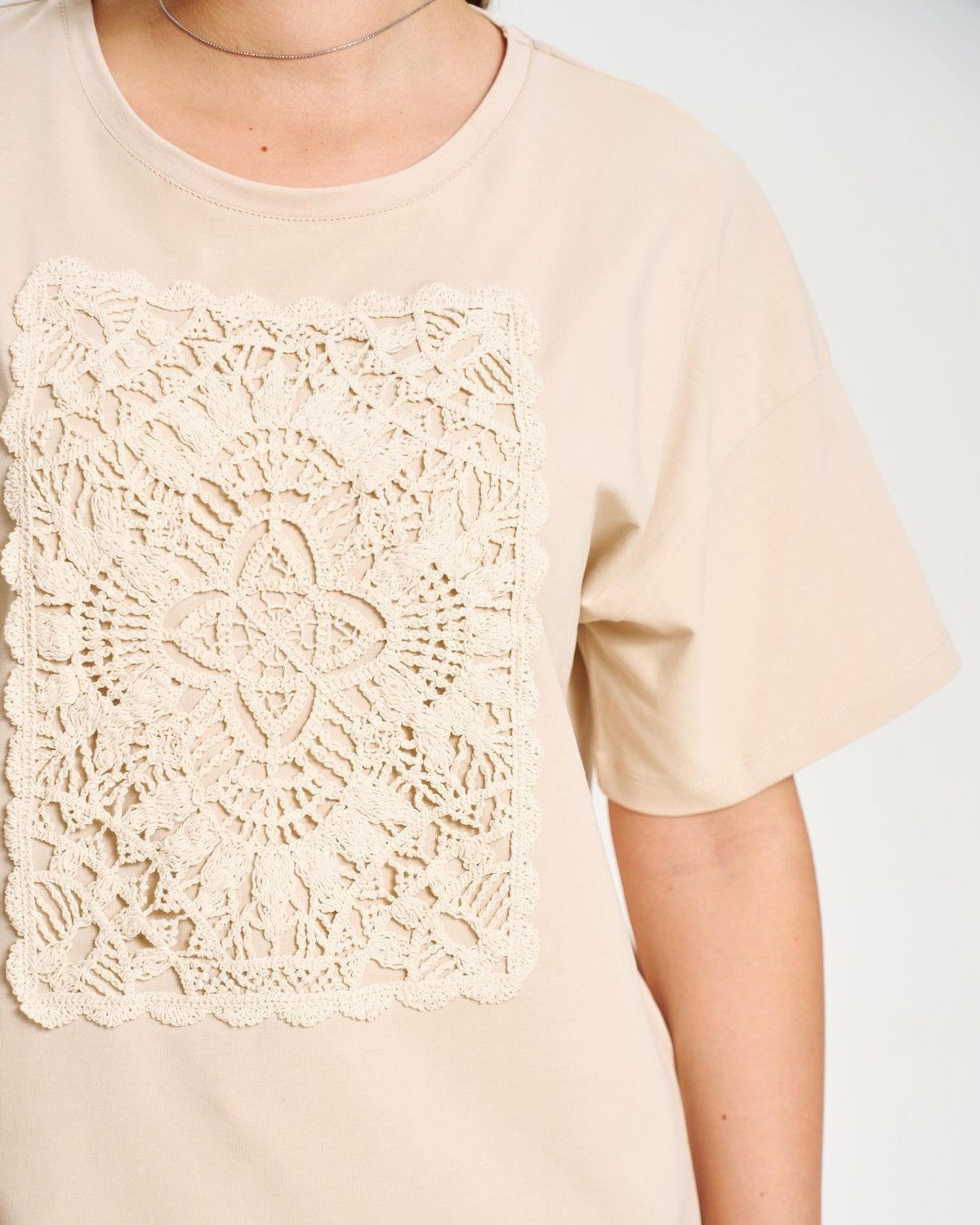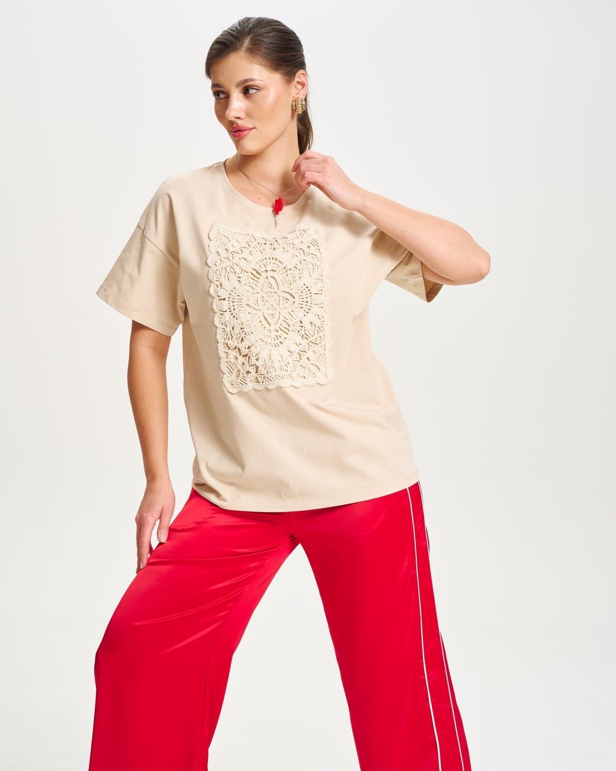 Главной особенностью модели стала нашитая впереди кружевная салфетка бежевого цвета. Она гармонично сочетается с оттенком ткани, создавая эффект деликатного ручного декора и добавляя нотку уюта. Такой элемент придаёт вещи индивидуальность и делает её заметной деталью образа.