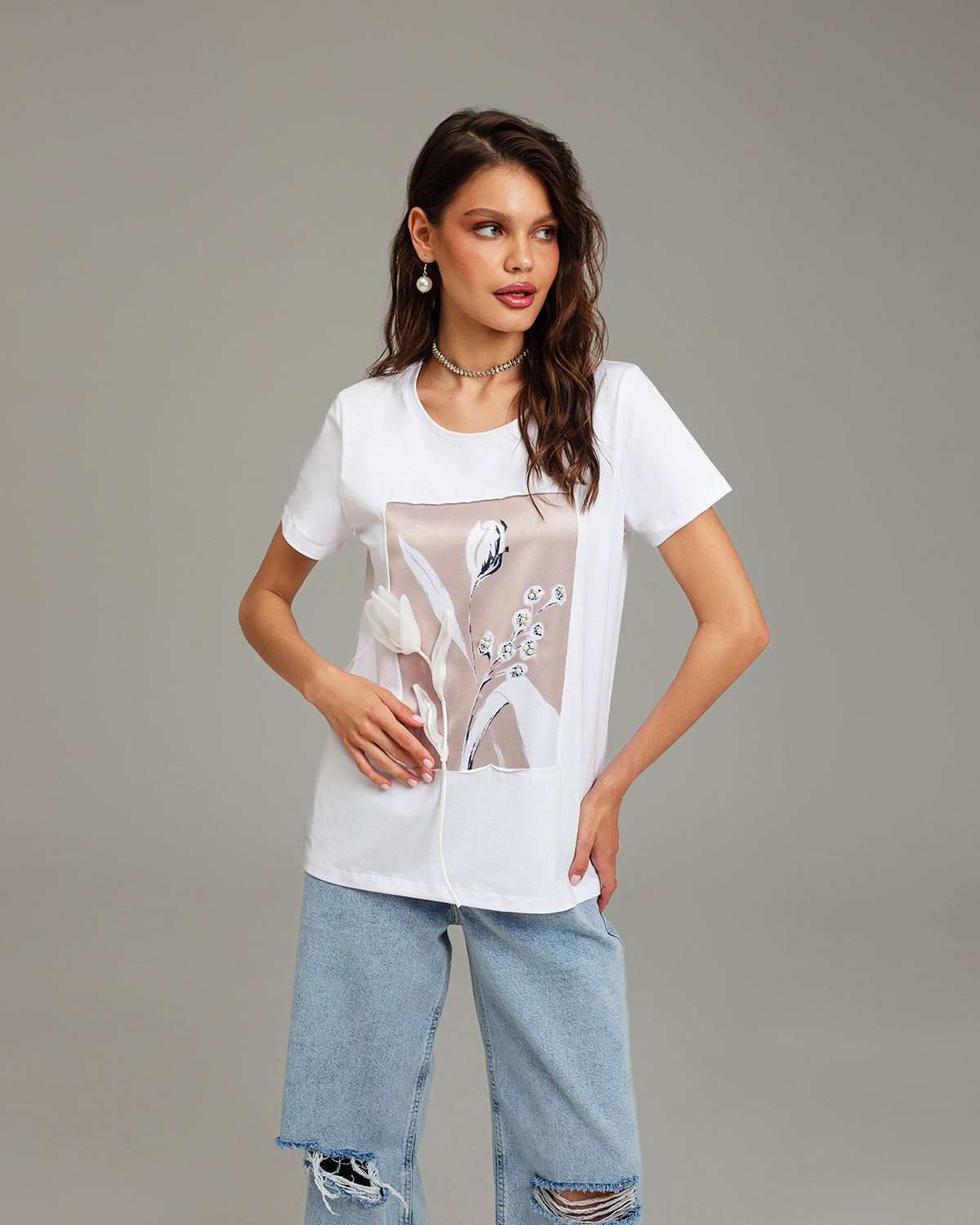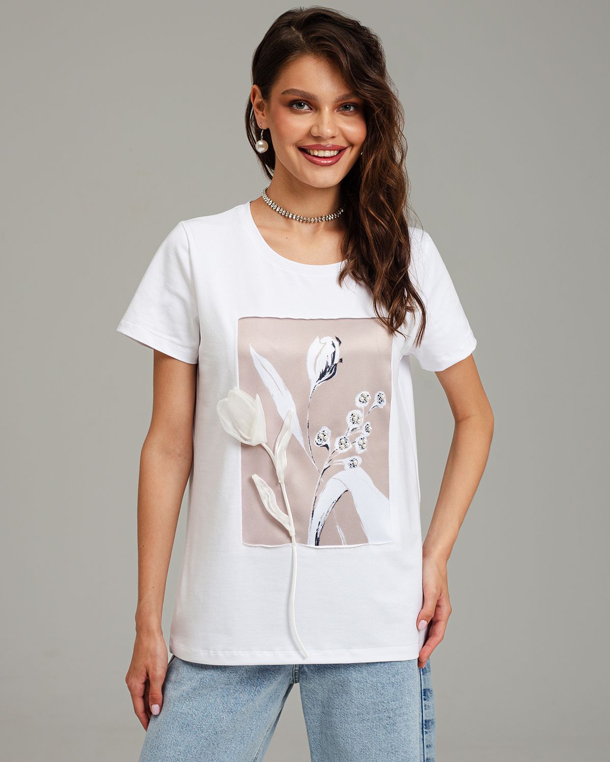 Особенность нашей новинки - нежнейший цветок тюльпана из органзы, изящно дополняющий авторский рисунок от наших художников. Ещё одна изюминка данной модели - жемчужные бусины, лаконично располагающиеся на бутонах отрисованных цветов. Шелк элегантно переливается и прекрасно сочетается с матовым хлопком.