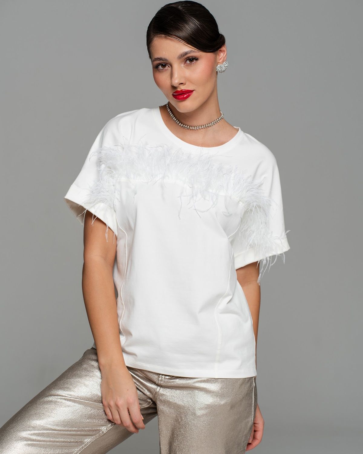 Футболка с перьями — экстравагантная находка для тех, кто следит за fashion индустрией. Роскошный тренд с мировых подиумов и из последних лукбуков таких модных брендов, как Bottega Venetta, The Attico, станет изюминкой вашего гардероба.