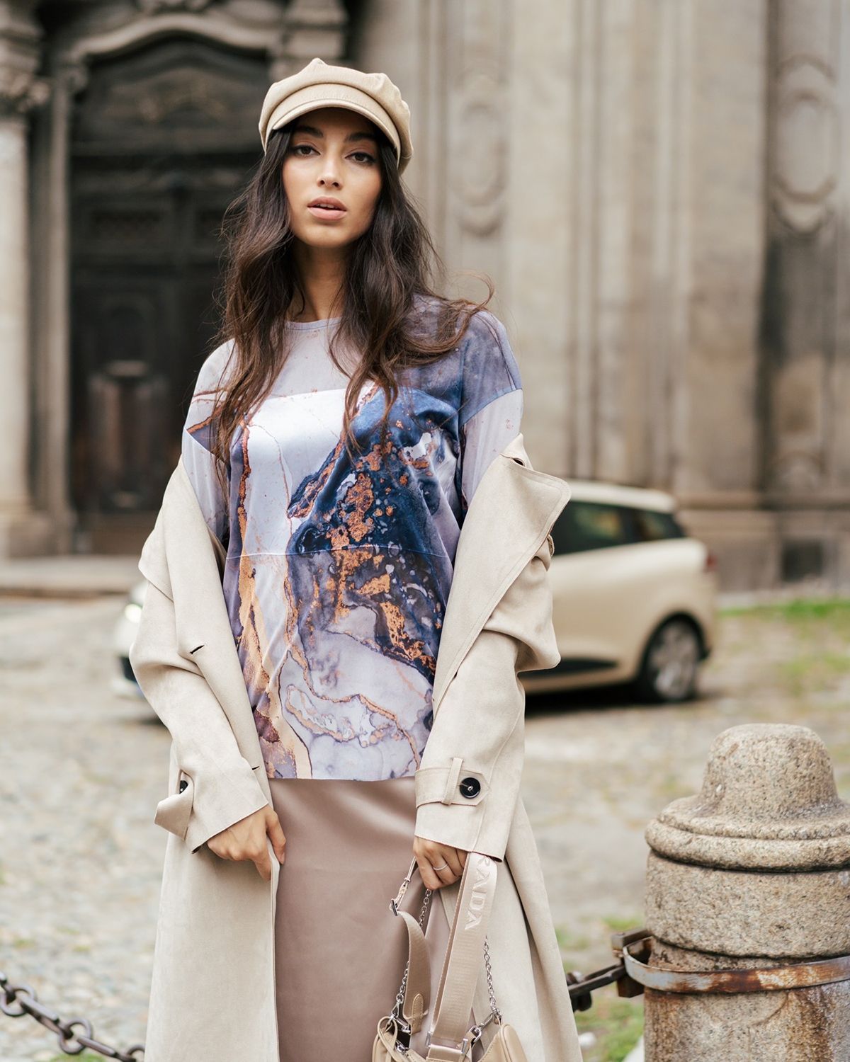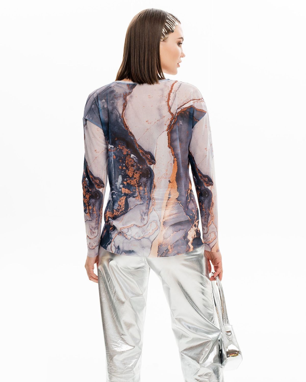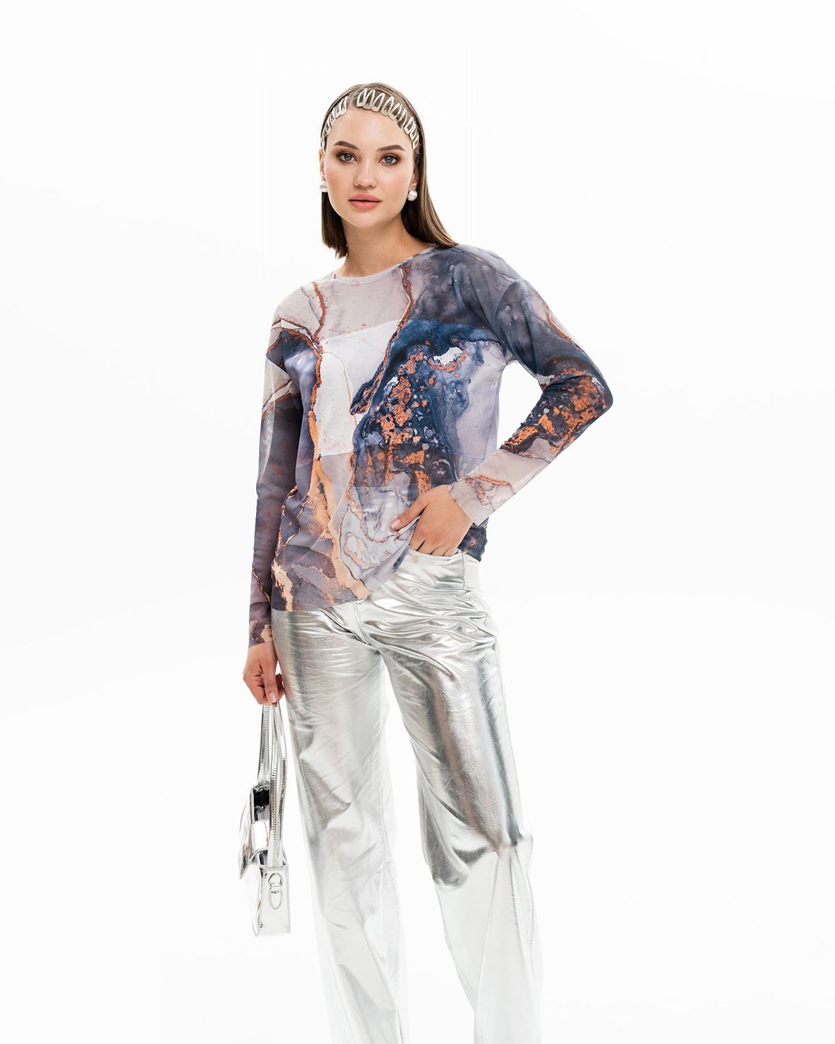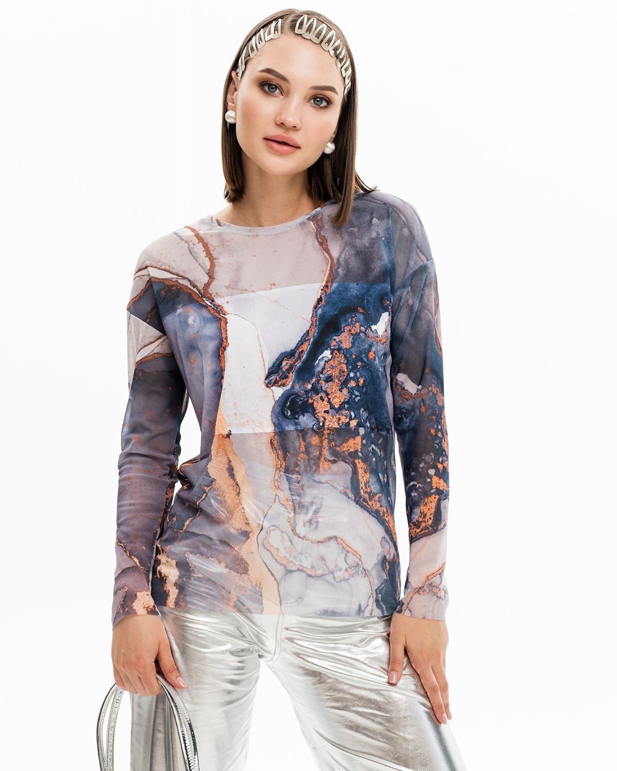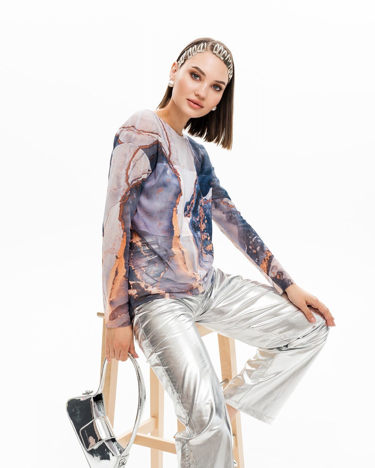 Сеточка с принтом «Мрамор» придаёт ему уникальный и изысканный вид, а тонкая кофточка нежно струится по телу, создавая кокетливый силуэт. Блузка с атласной вставкой добавляет нотку элегантности и шиковости, делая этот лонгслив особенно привлекательным для вечернего выхода.