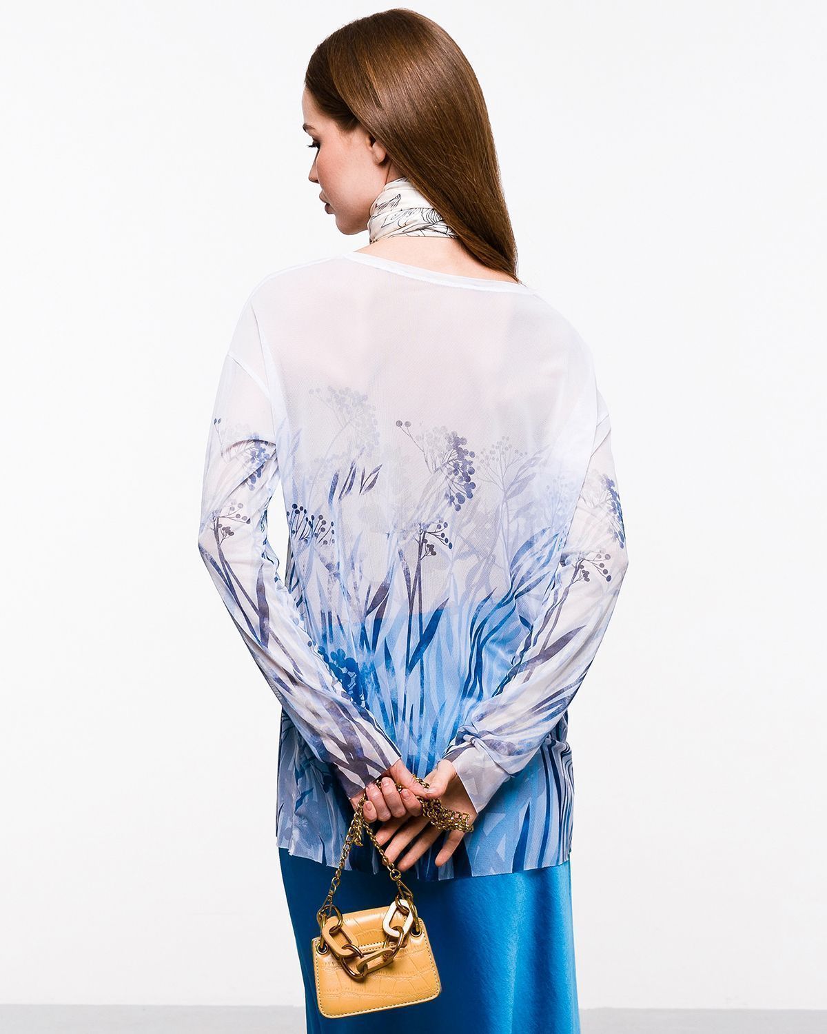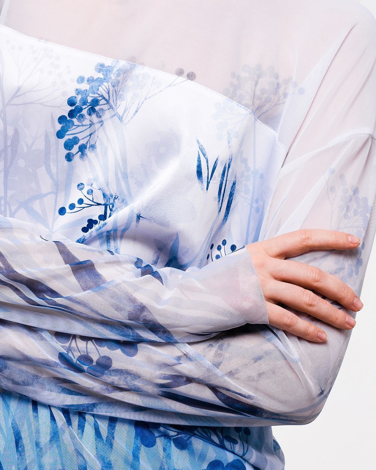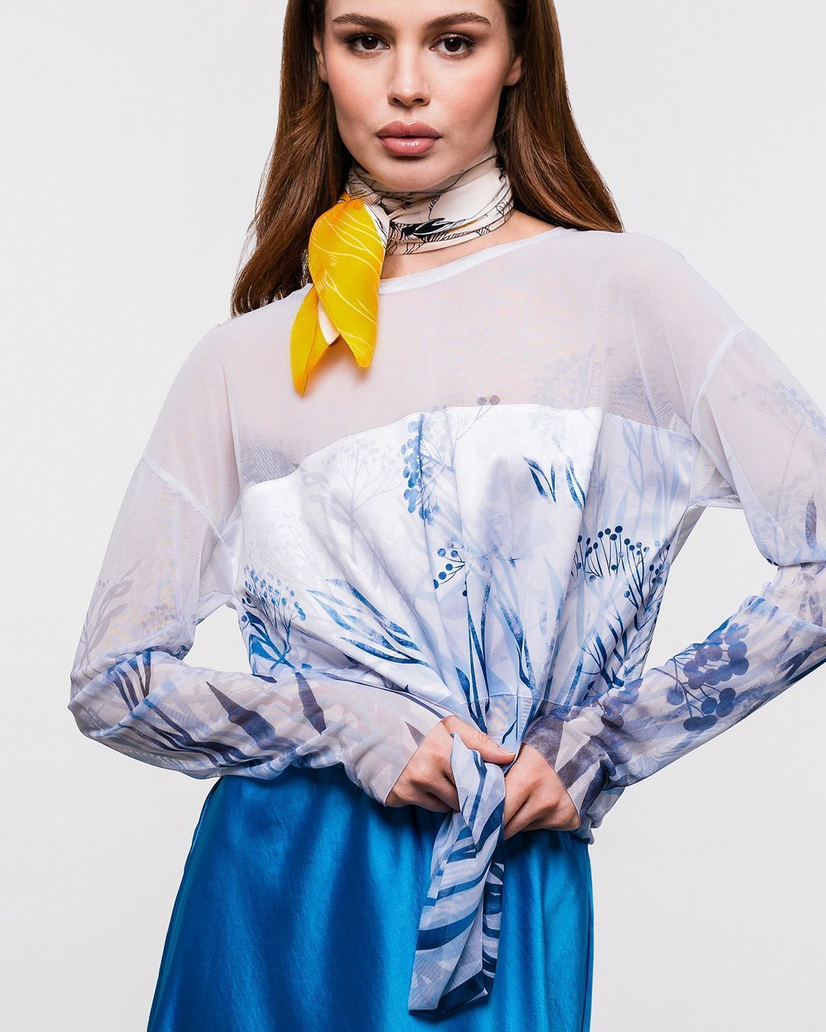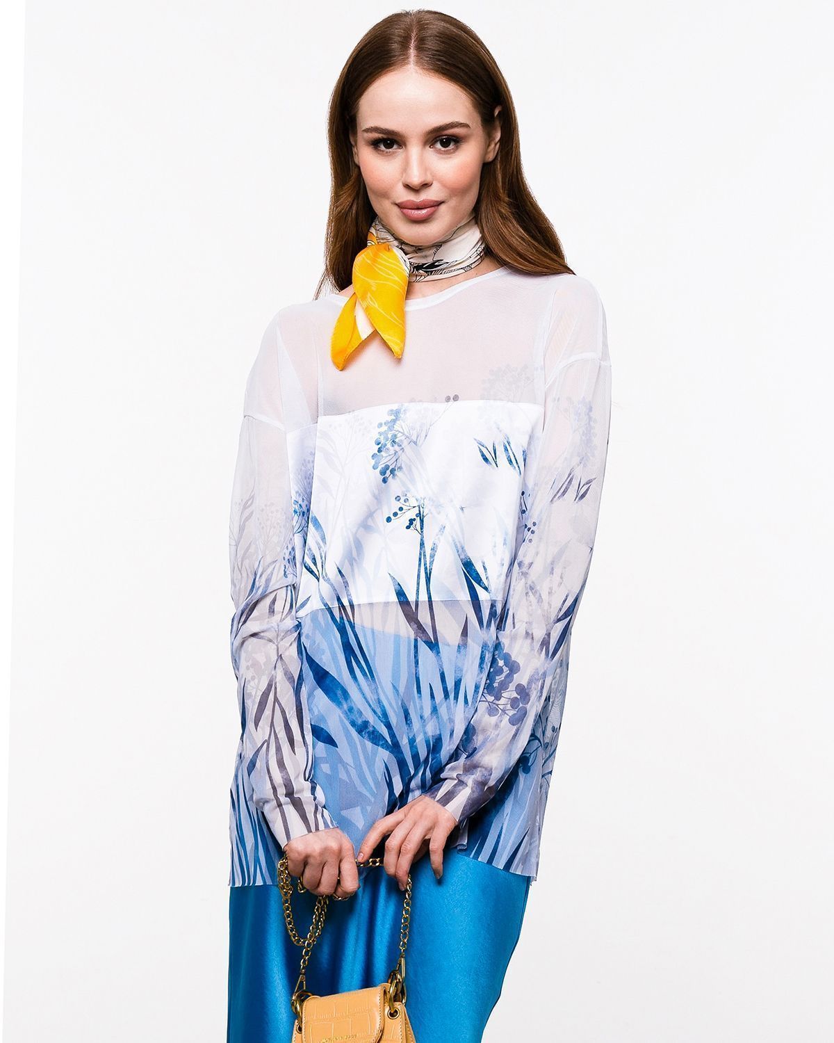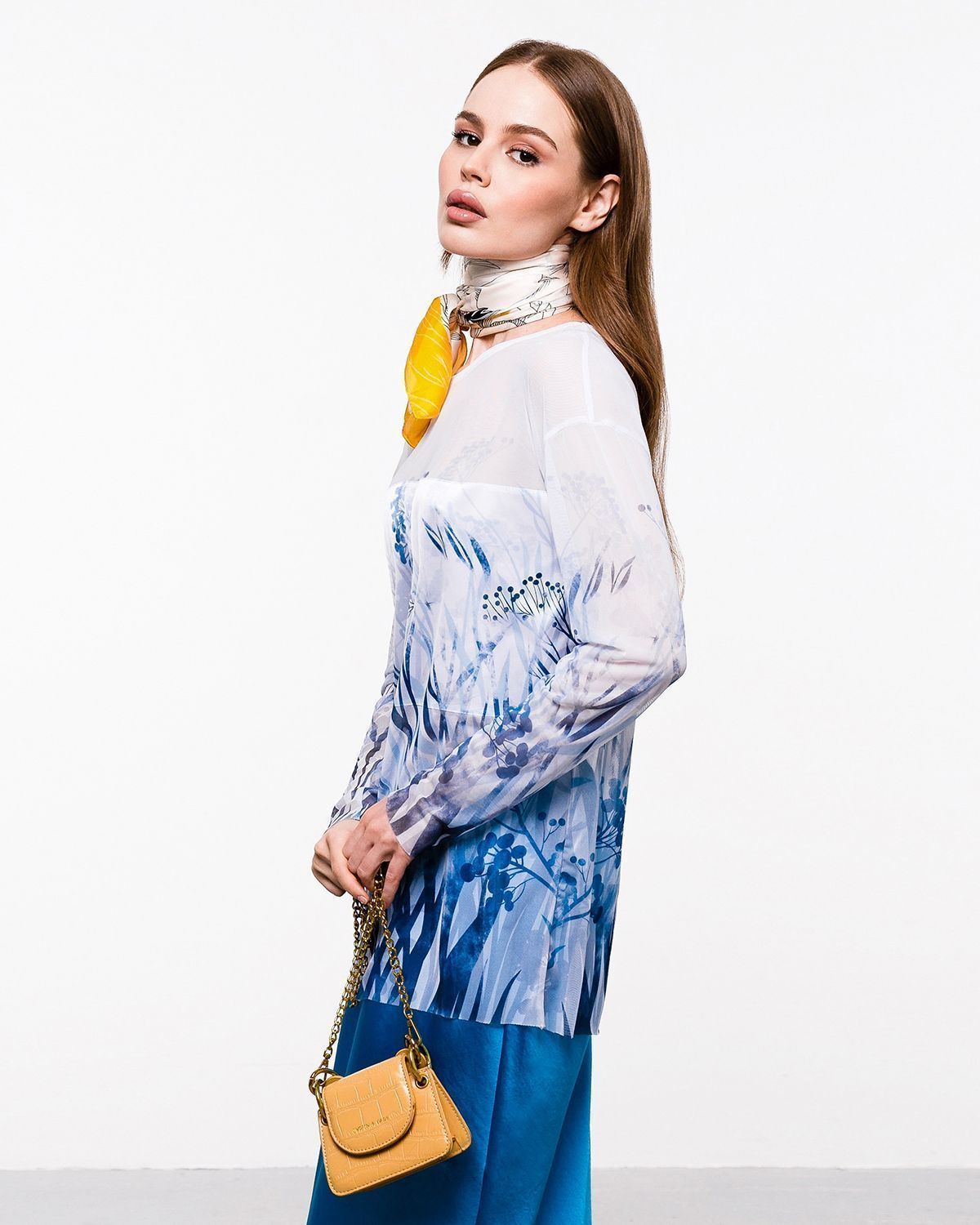Свободный крой позволяет активно двигаться. Обратите внимание, края изделия не обрабатываются швами, чтобы сохранить эффект полупрозрачности, тонкости и нежности лонгслива. Удлинённый рукав добавляет загадочность образу. Вставка на груди, декорированная авторским принтом, становится акцентом, притягивающим взгляды и вызывающим восхищение.