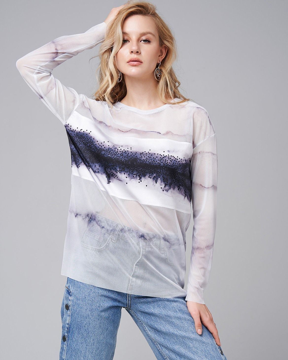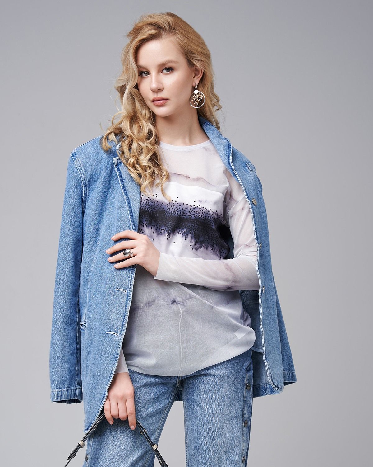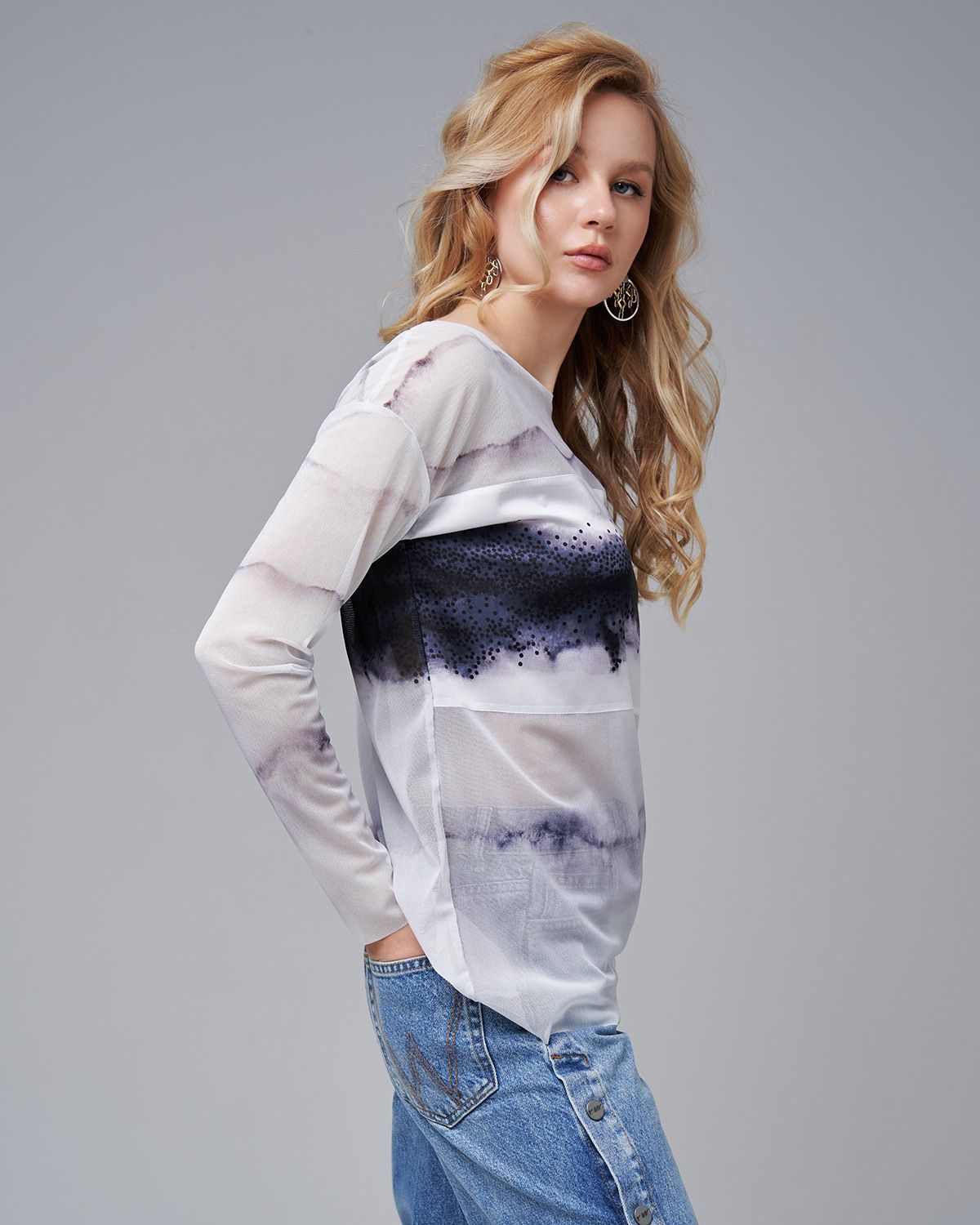 Свободный крой позволяет активно двигаться. Обратите внимание, края изделия не обрабатываются швами, чтобы сохранить эффект полупрозрачности, тонкости и нежности лонгслива. Удлинённый рукав добавляет загадочность образу. Вставка на груди, декорированная авторским принтом, становится акцентом, притягивающим взгляды и вызывающим восхищение.