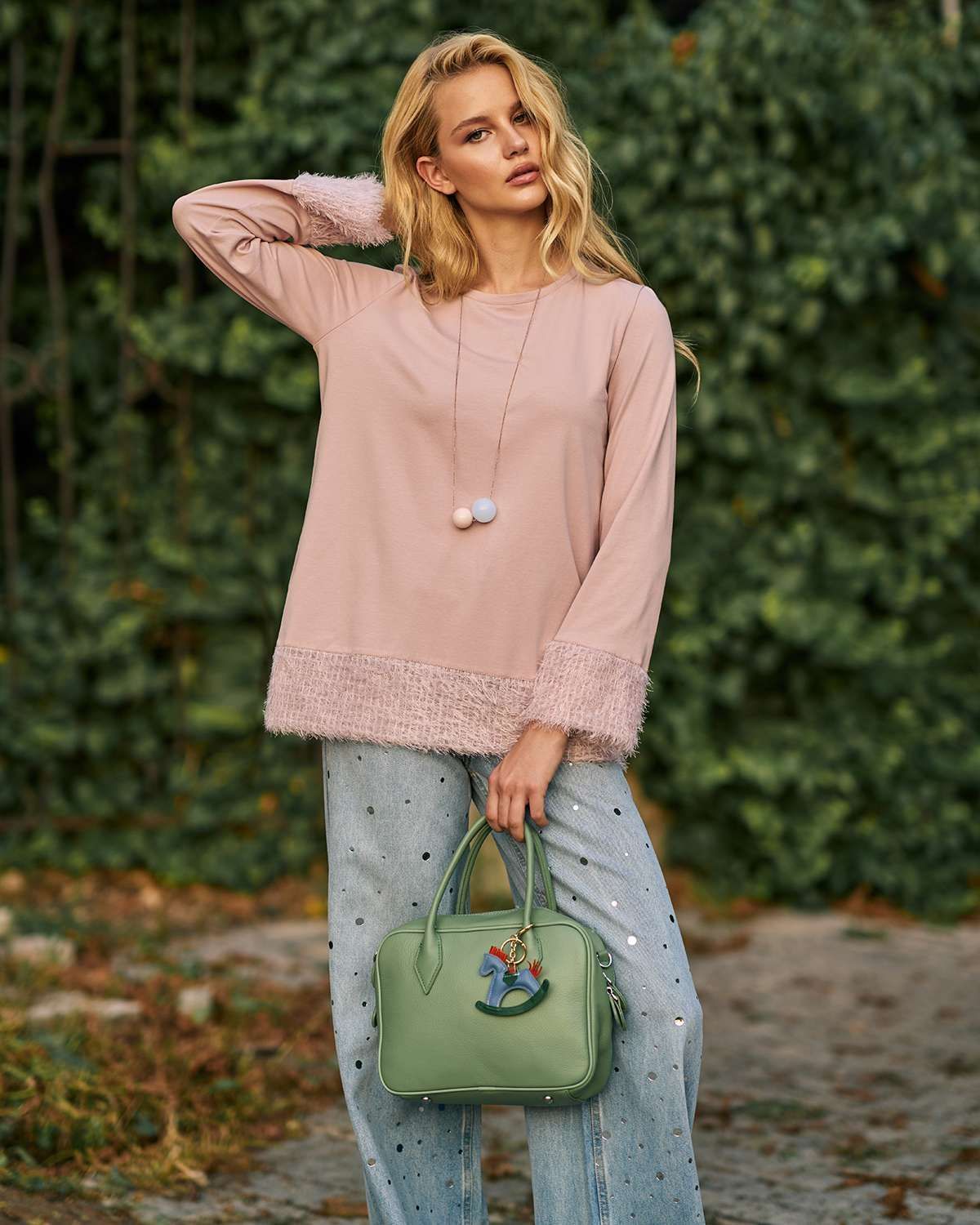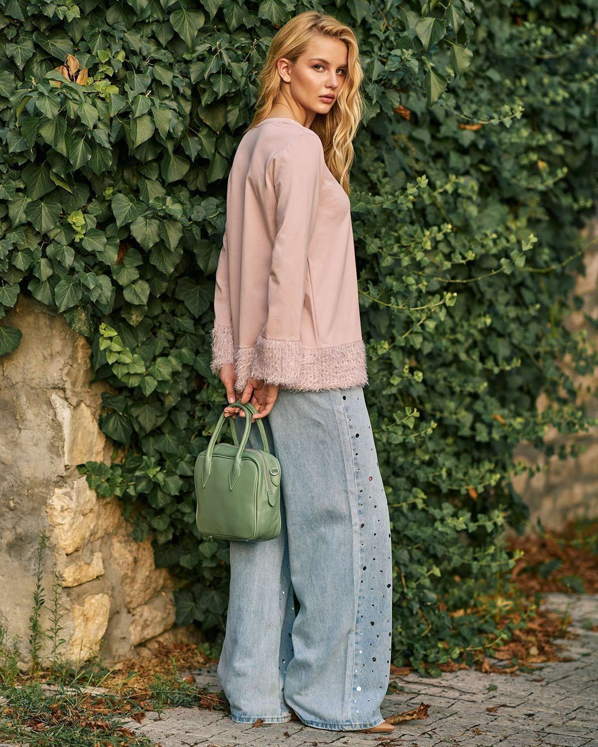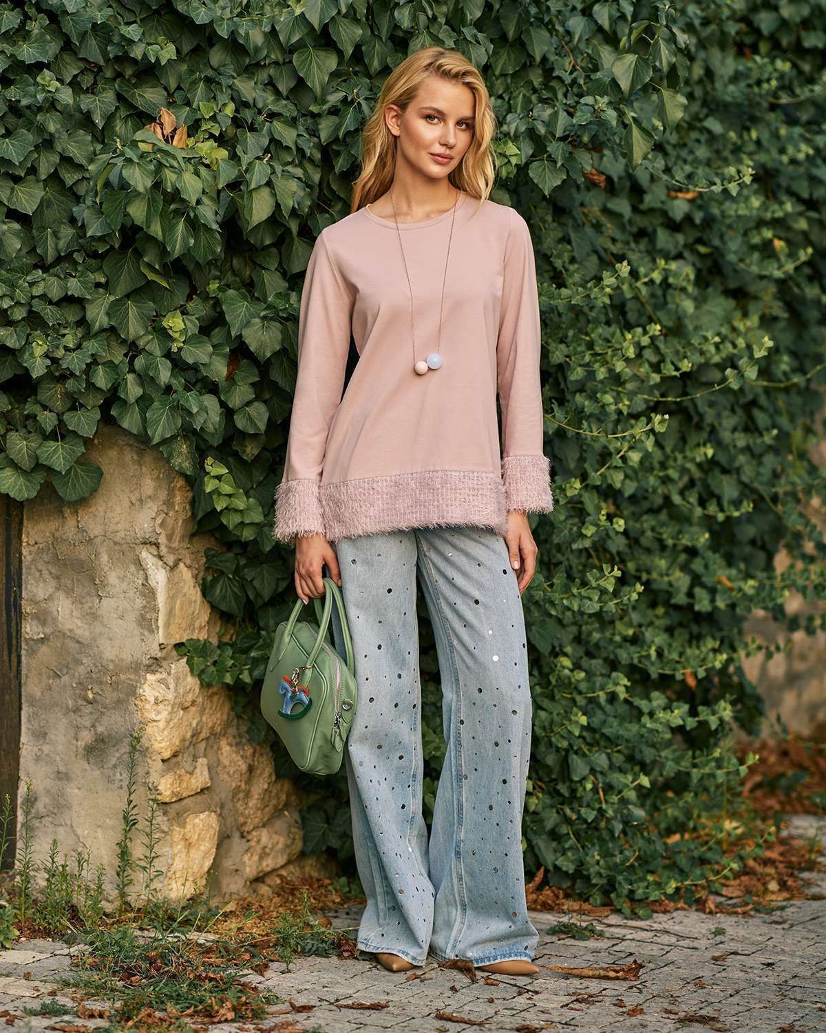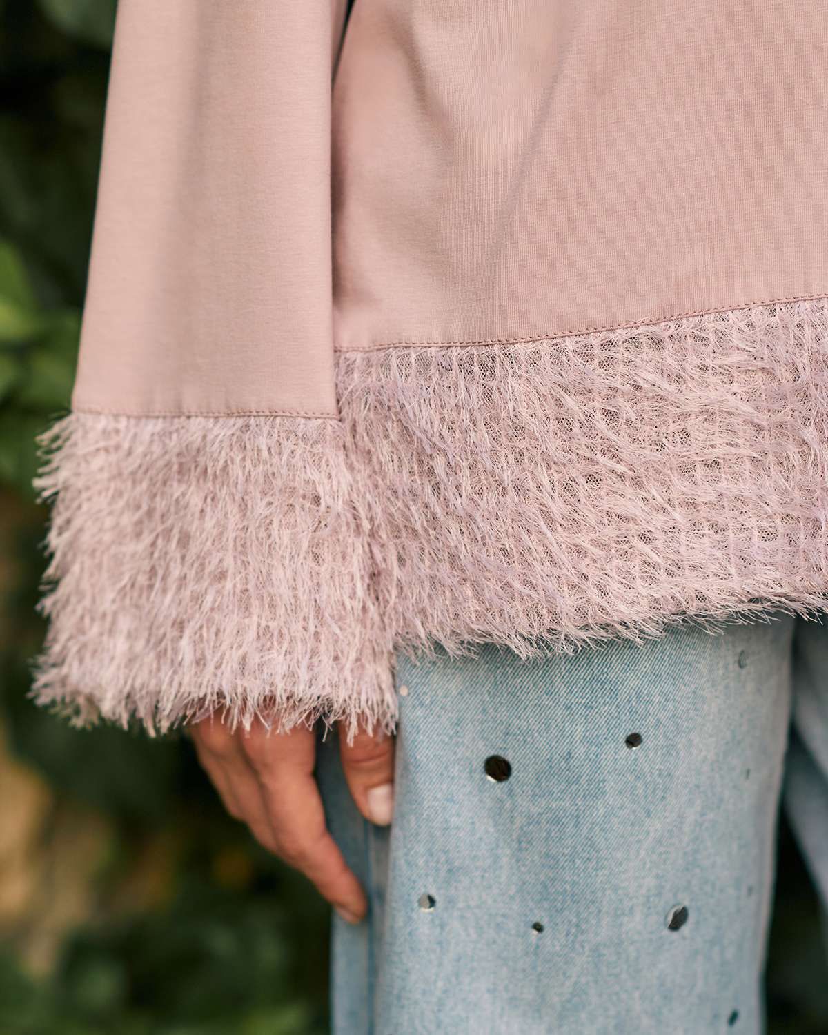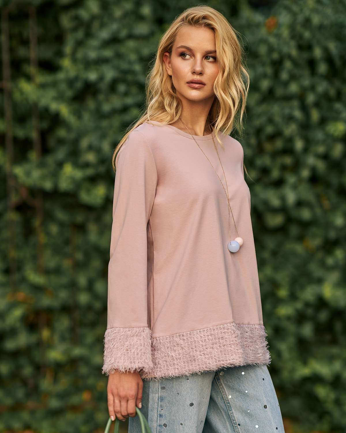 Хлопковый лонгслив свободного кроя с мягкой и приятной отделкой в пудрово-розовом цвете. Особенность модели заключается в отделке края рукавов и низа изделия специальной тканью с ворсом, создающей дополнительный комфорт и уют. Просторный свободный силуэт позволяет свободно двигаться и создает ощущение легкости.