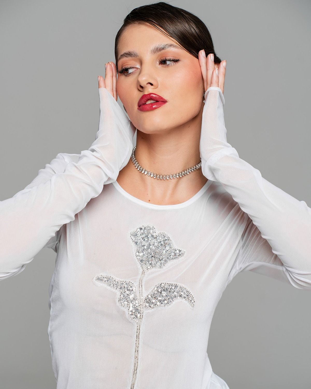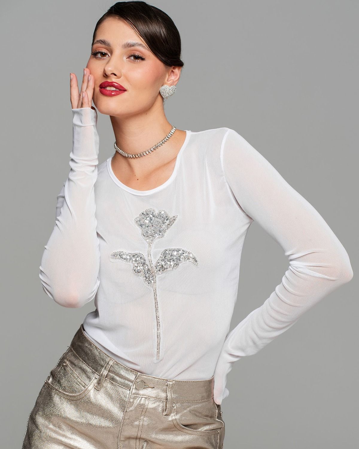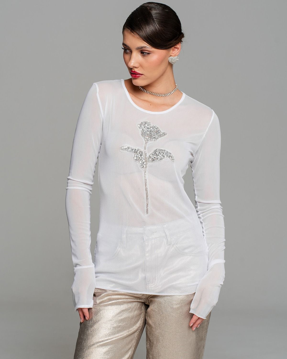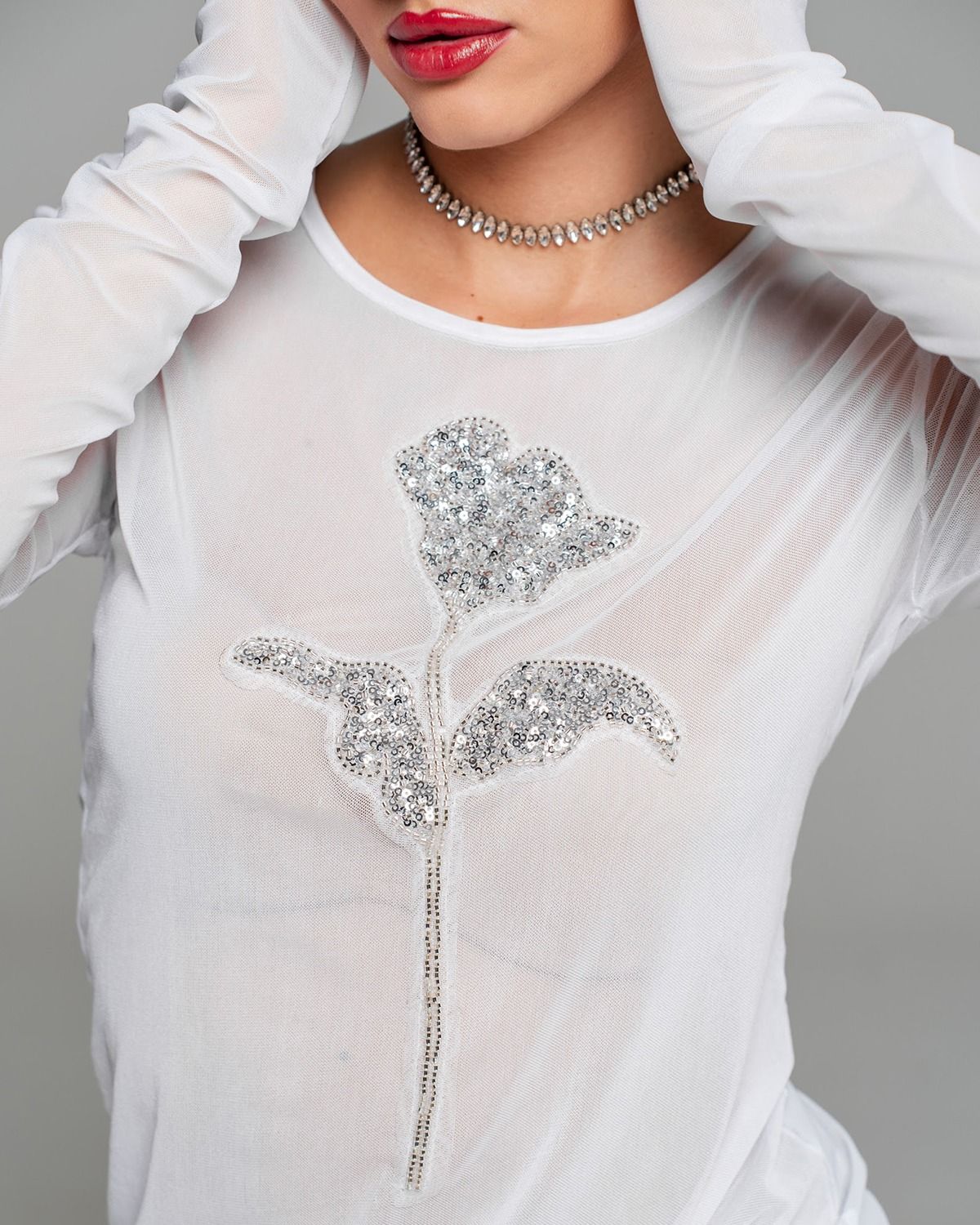 Белый лонгслив из сетки украшен изысканной декоративной нашивкой в форме элегантного цветка. Цветок выполнен с использованием блестящих серебристых бусин и мелких пайеток, придающих изделию особый шарм и утонченность. Гармонично сочетается с легкостью материала, подчеркивая женственность образа. Идеально подходит для создания нежного и привлекательного образа.
