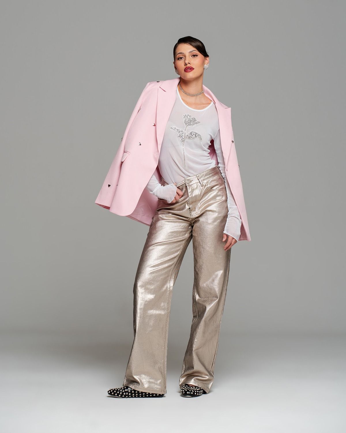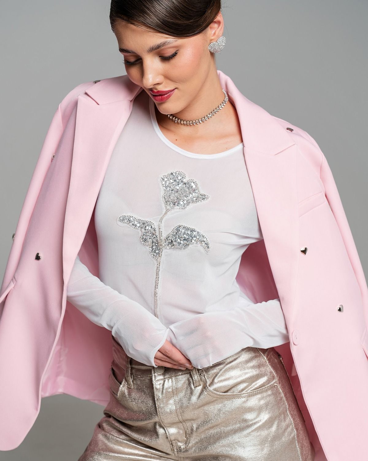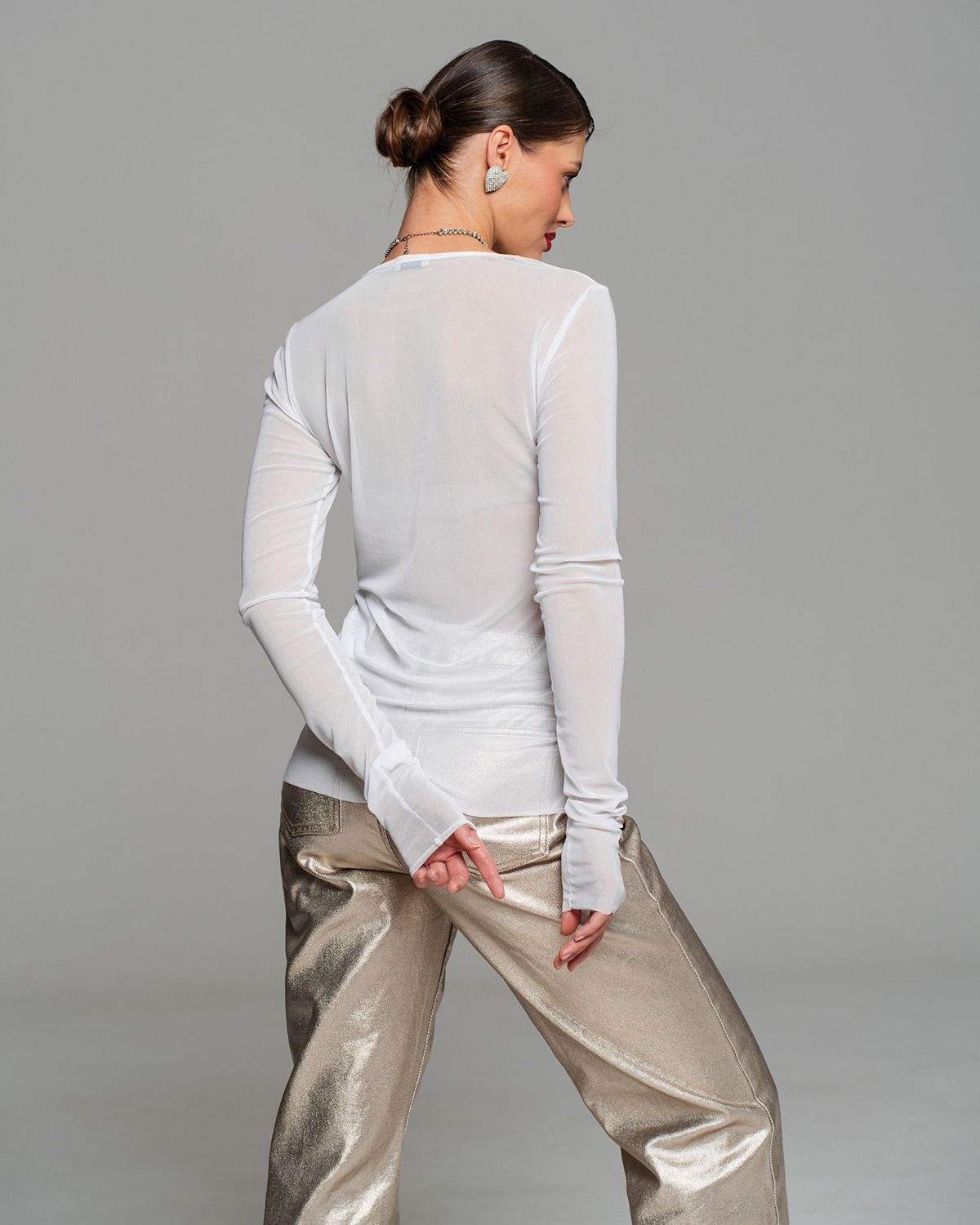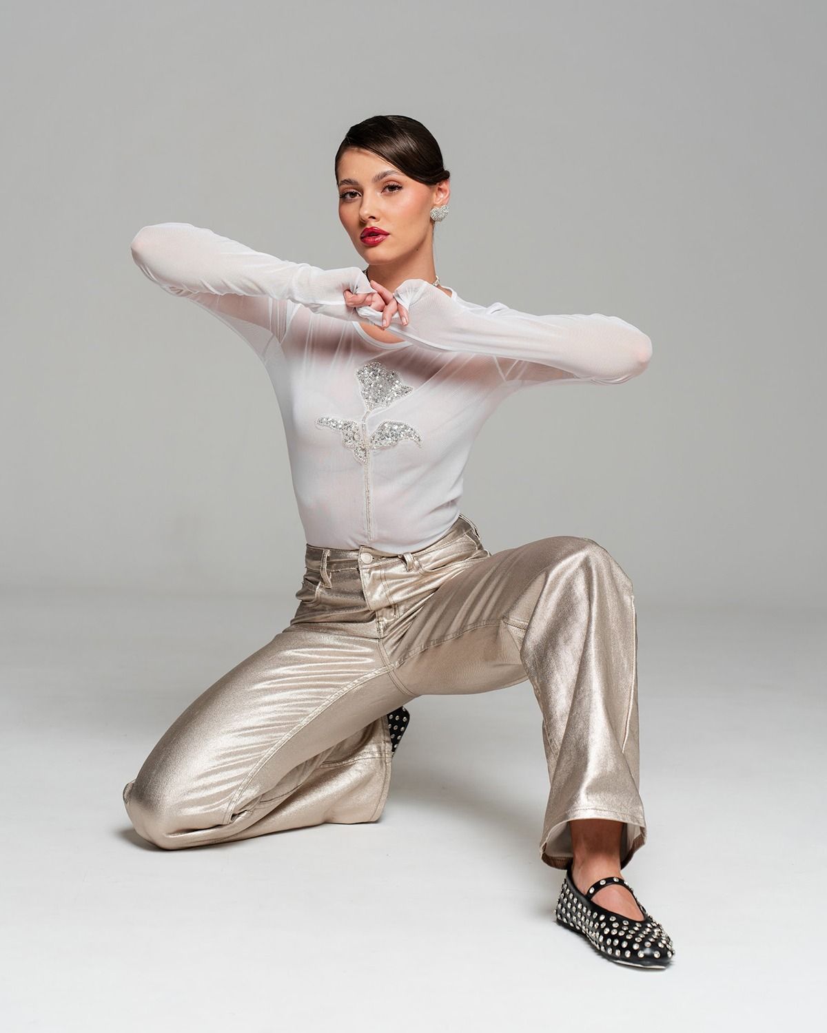 Белый лонгслив из сетки украшен изысканной декоративной нашивкой в форме элегантного цветка. Цветок выполнен с использованием блестящих серебристых бусин и мелких пайеток, придающих изделию особый шарм и утонченность. Гармонично сочетается с легкостью материала, подчеркивая женственность образа. Идеально подходит для создания нежного и привлекательного образа.