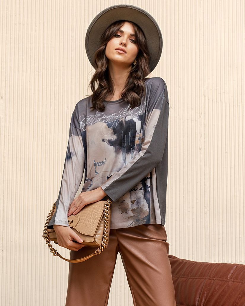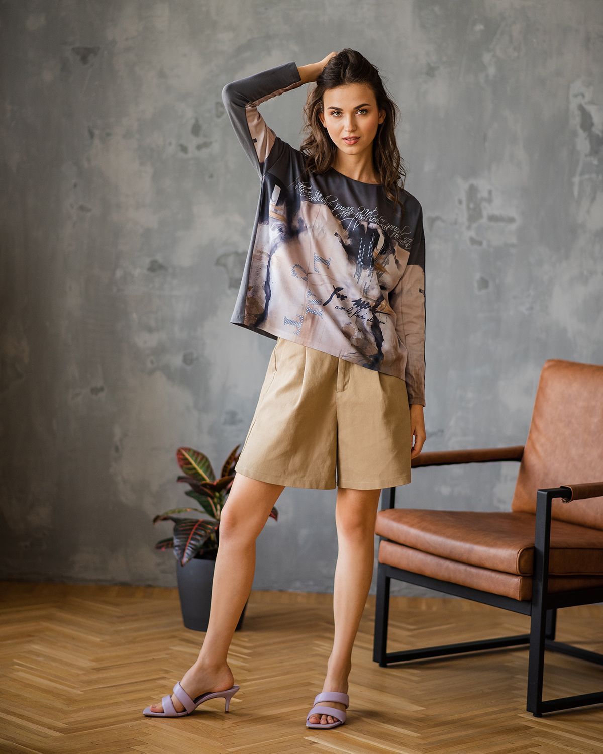 Трикотажная кофта с длинным рукавом сделана из двух видов ткани: спереди вискозное полотно с принтом, а сзади однотонная кулирная гладь.