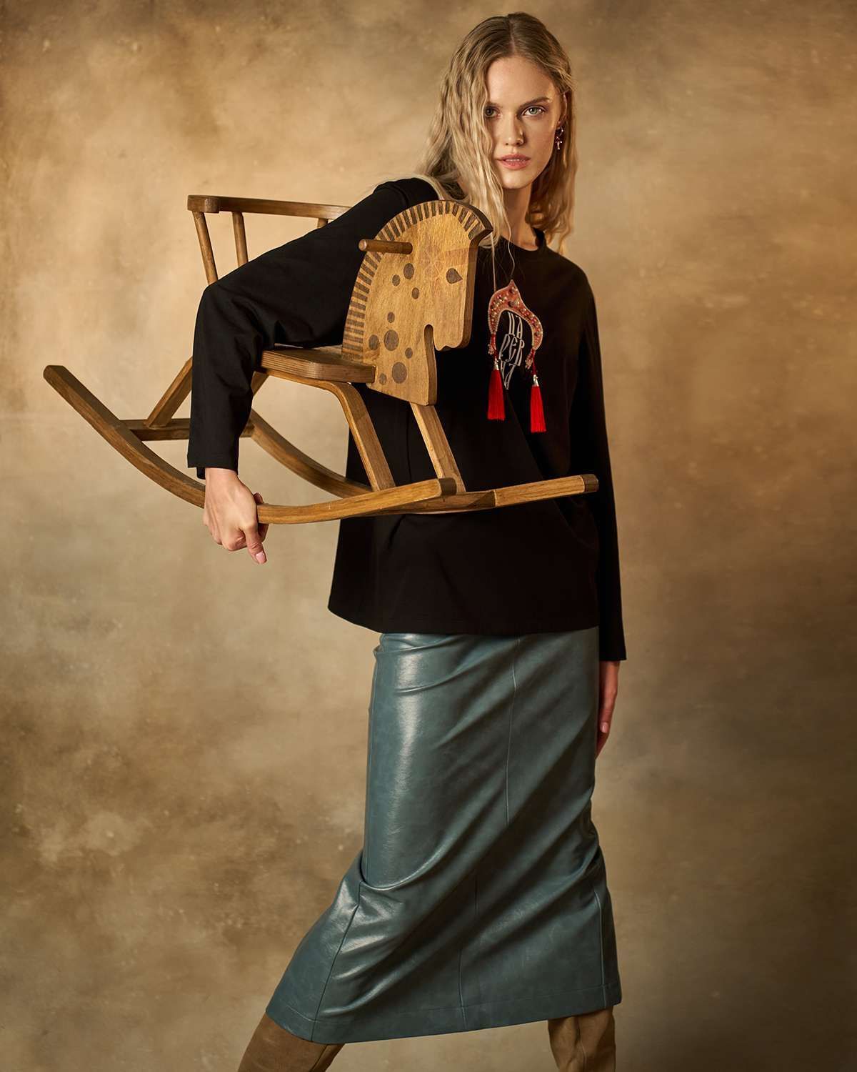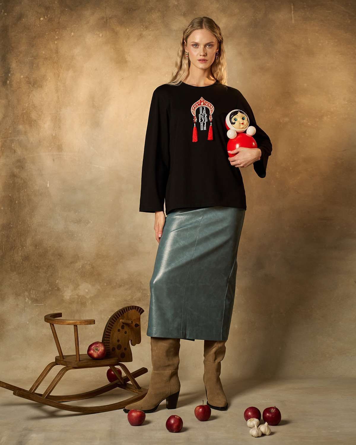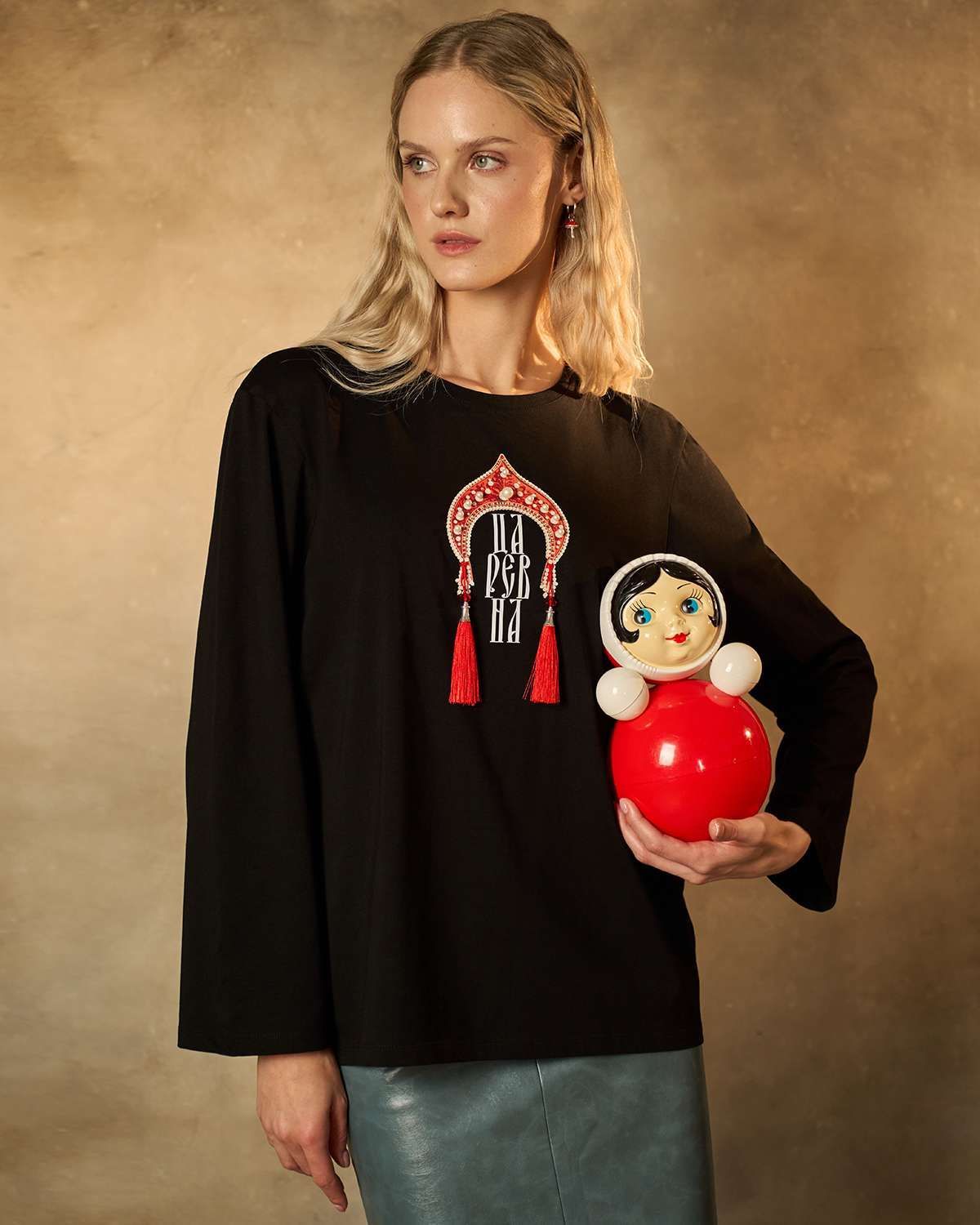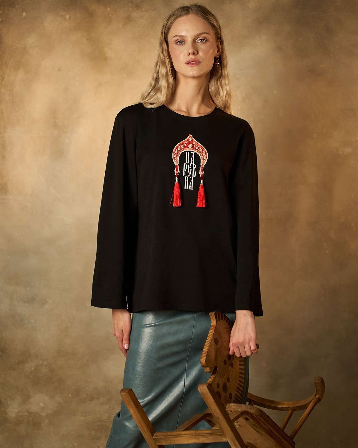 Хлопковый лонгслив классического кроя с прямыми рукавами. Передняя часть изделия украшена оригинальной печатью в форме традиционного русского головного убора — кокошника. Под изображением кокошника расположена надпись "Царевна", гармонично вписанная в общий образ. Кокошник декорирован бусинами жемчужинами и эффектными объемными кисточками с роскошной бахромой, придающими изделию особую изысканность и шарм. Лонгслив идеально подойдет поклонникам этнического стиля и станет ярким акцентом любого образа.