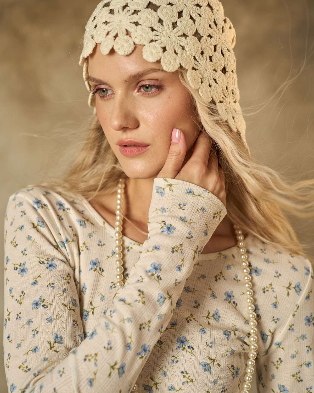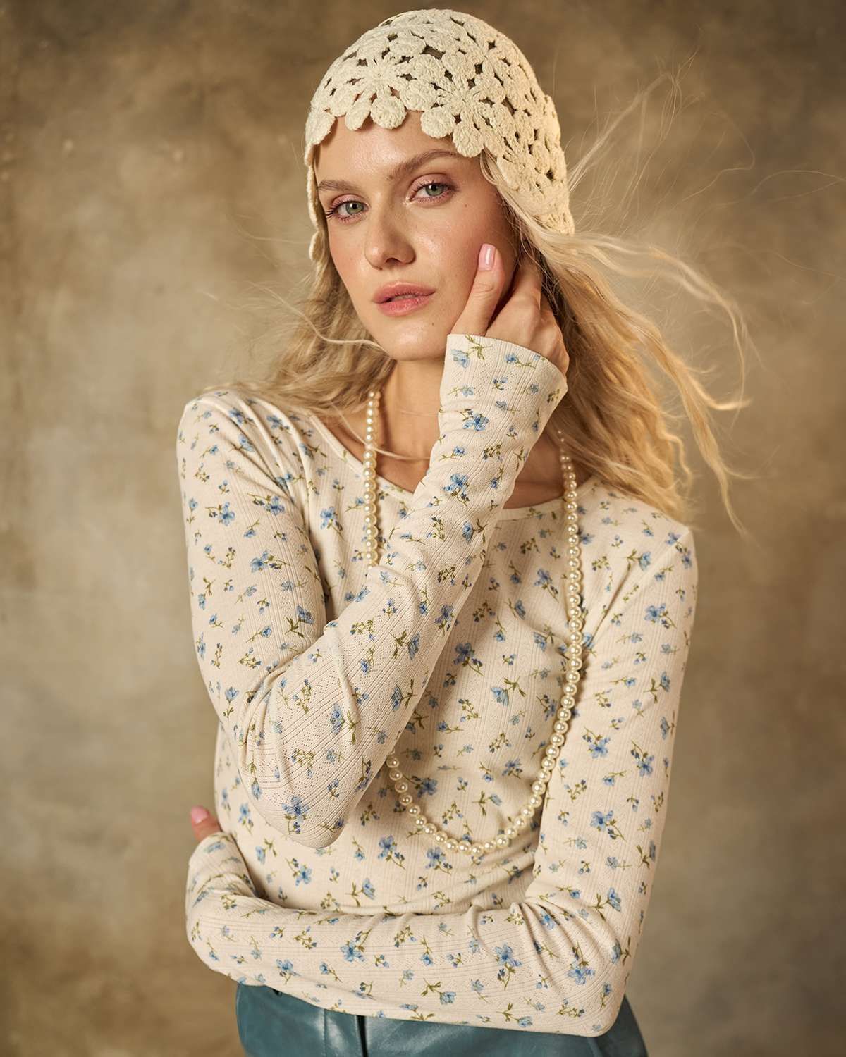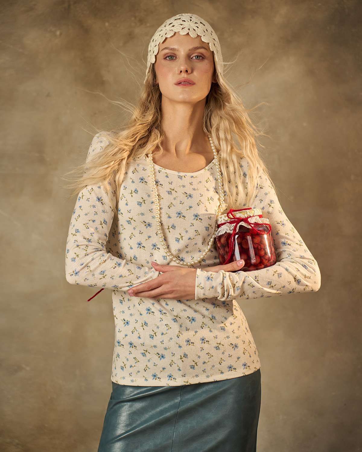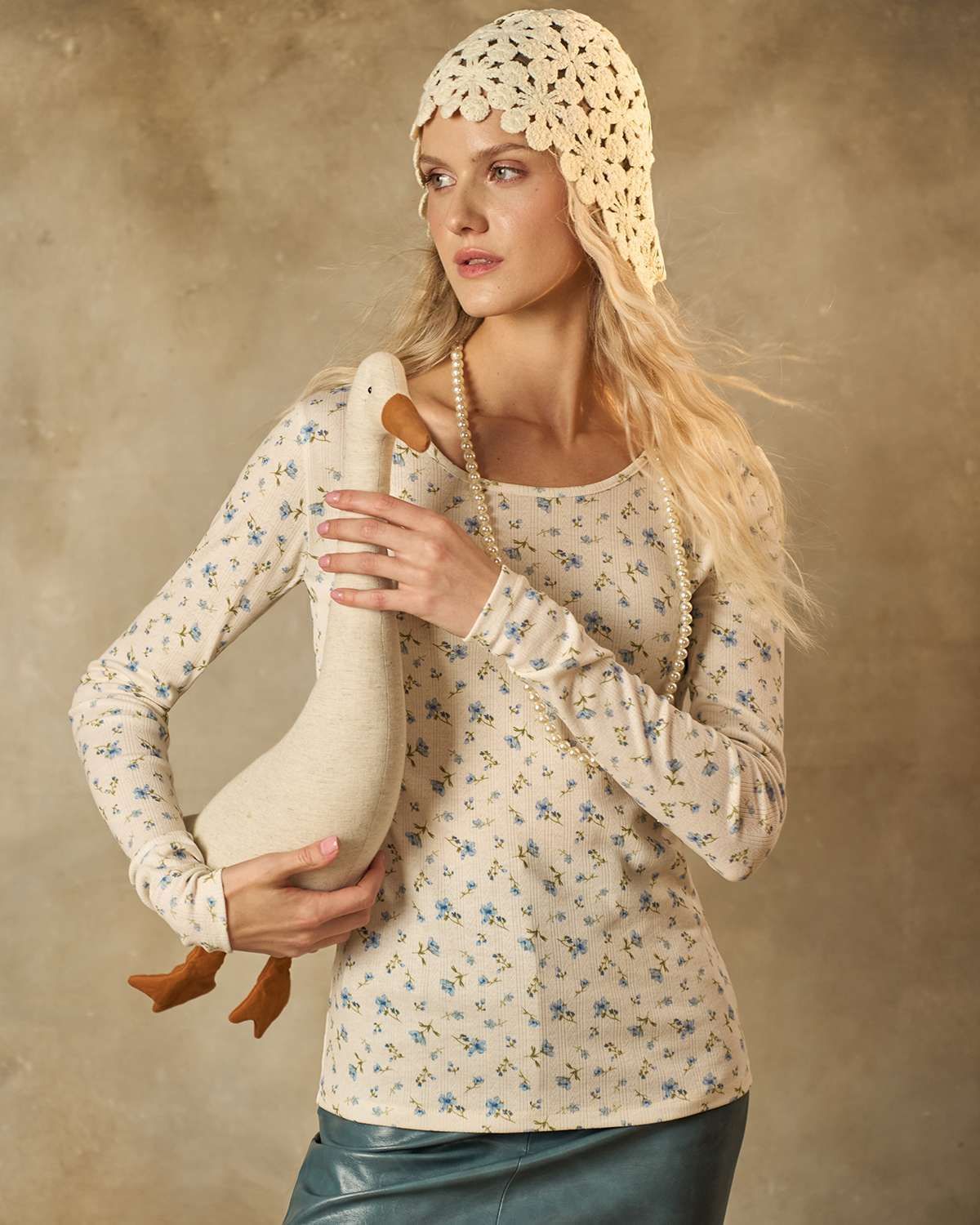 Лонгслив молочного цвета. Облегающая модель из мягкого и приятного трикотажа подчеркивает женственность и нежность образа. Мелкий голубой цветочек придает изделию свежесть и легкость, делая его идеальным выбором для повседневного стиля.