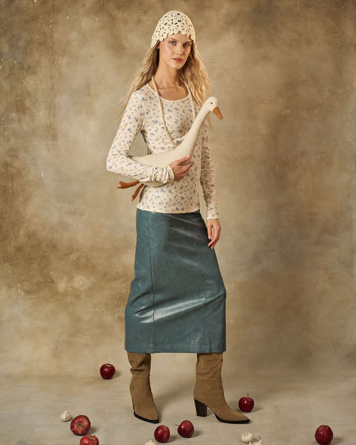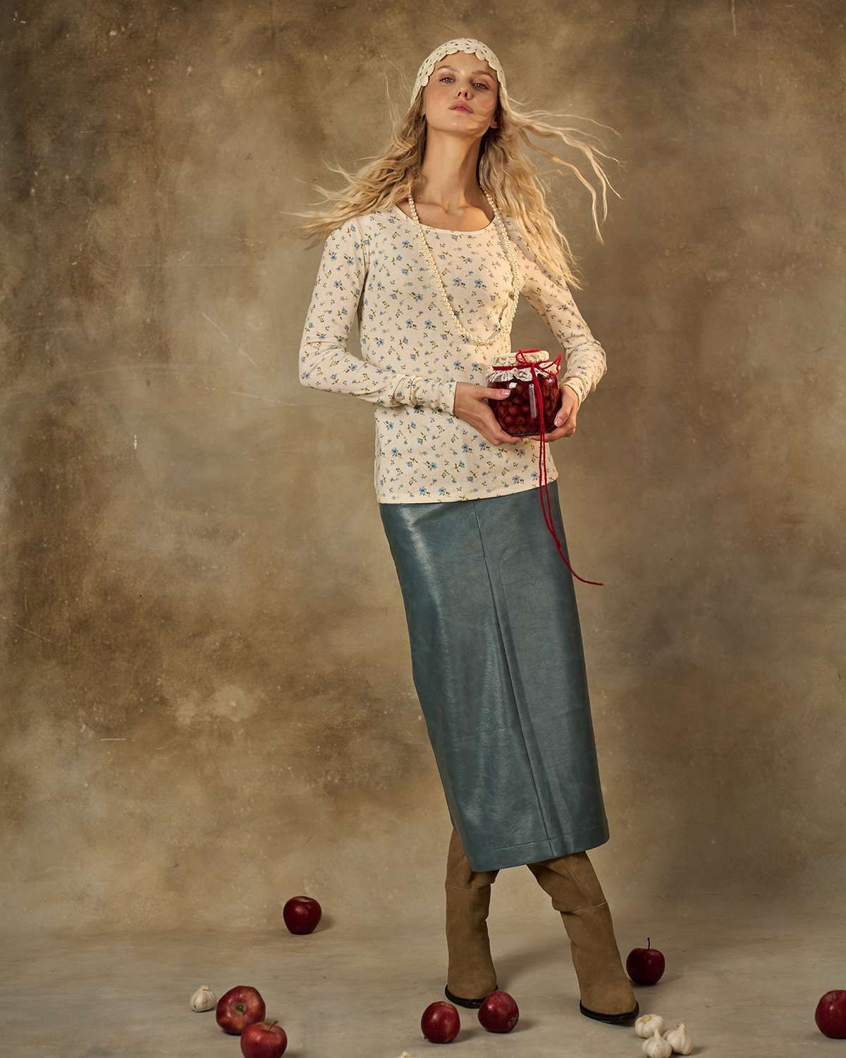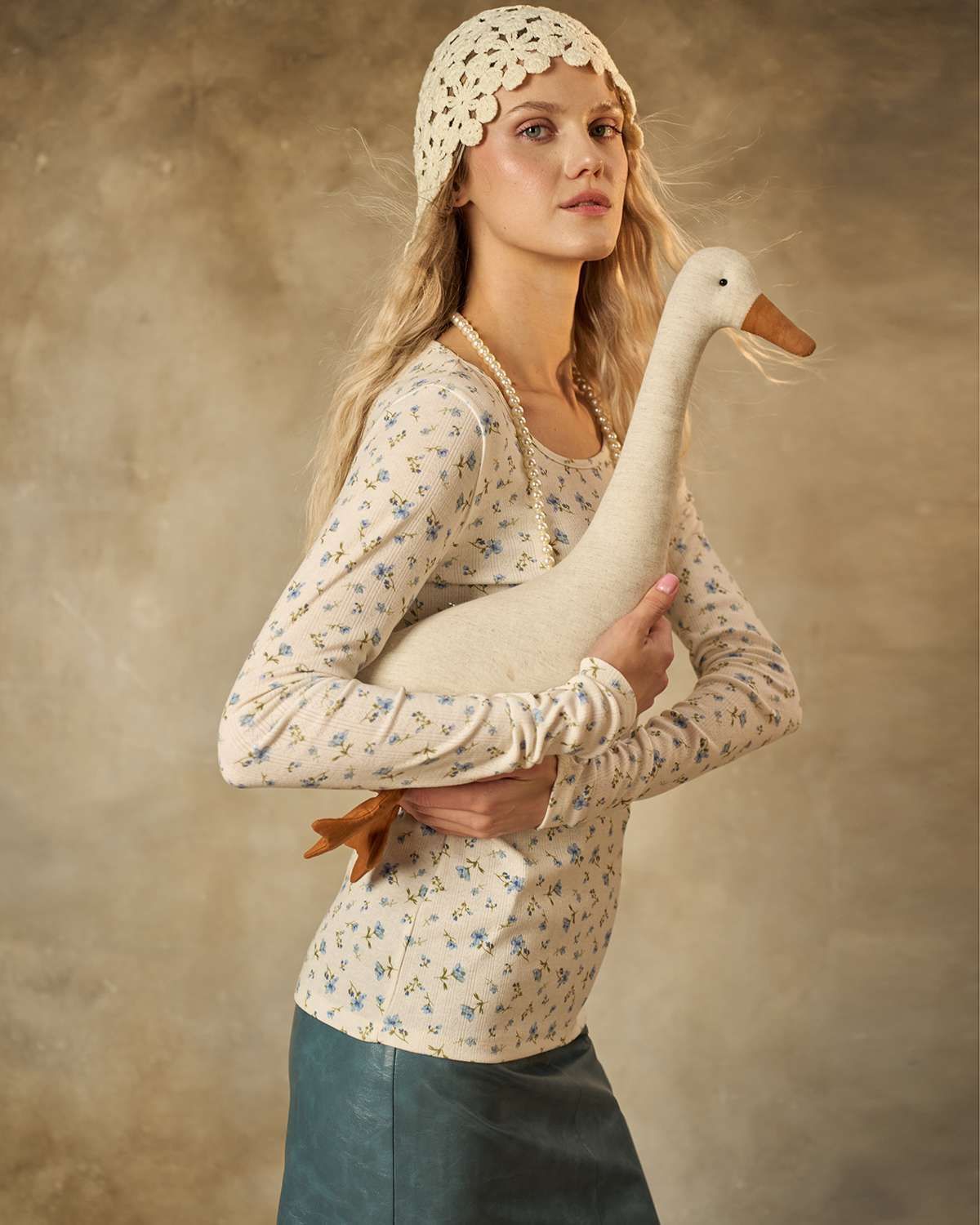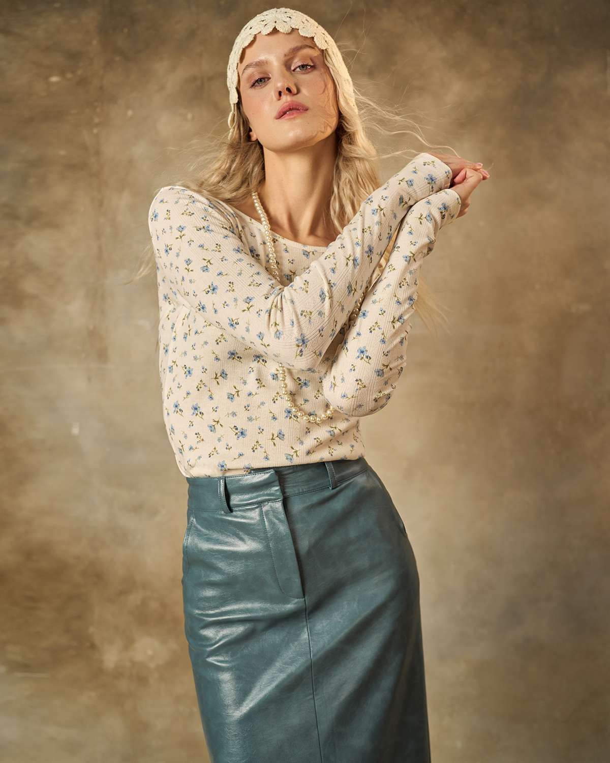 Лонгслив молочного цвета. Облегающая модель из мягкого и приятного трикотажа подчеркивает женственность и нежность образа. Мелкий голубой цветочек придает изделию свежесть и легкость, делая его идеальным выбором для повседневного стиля.