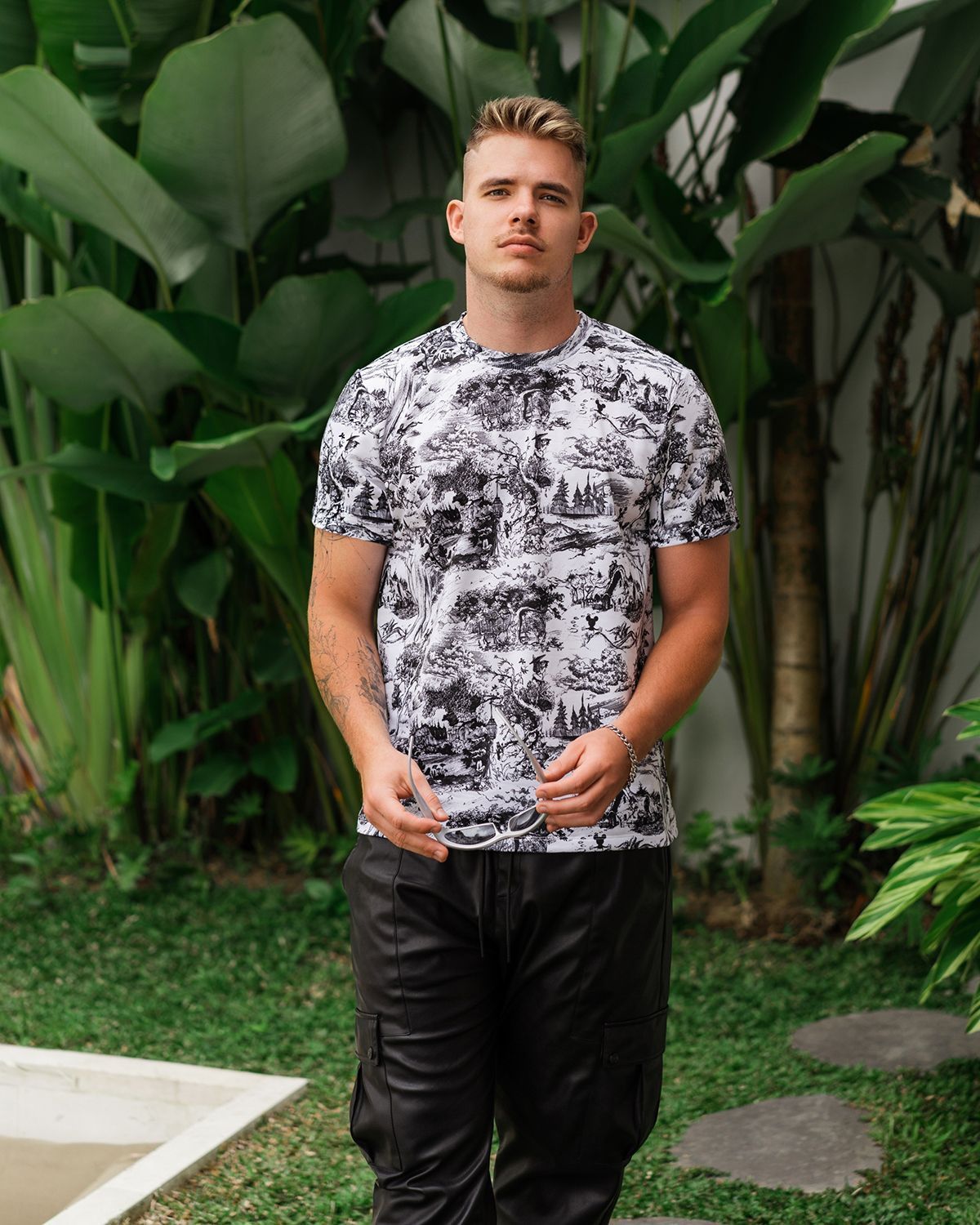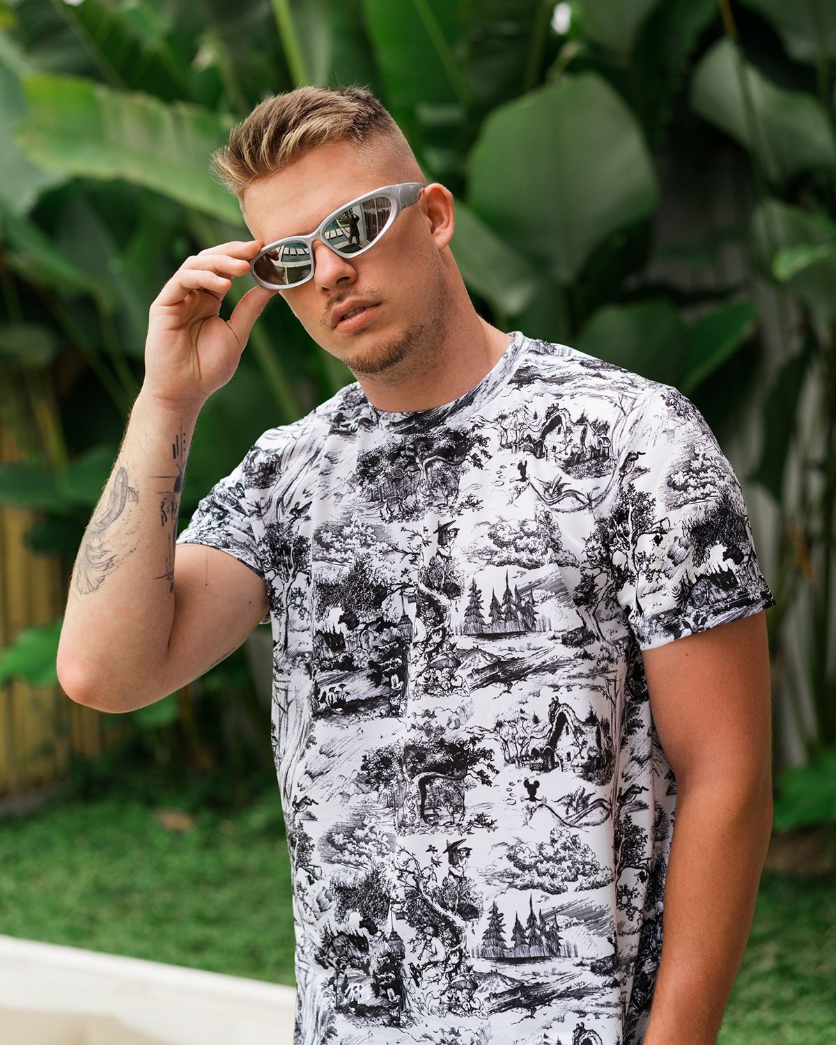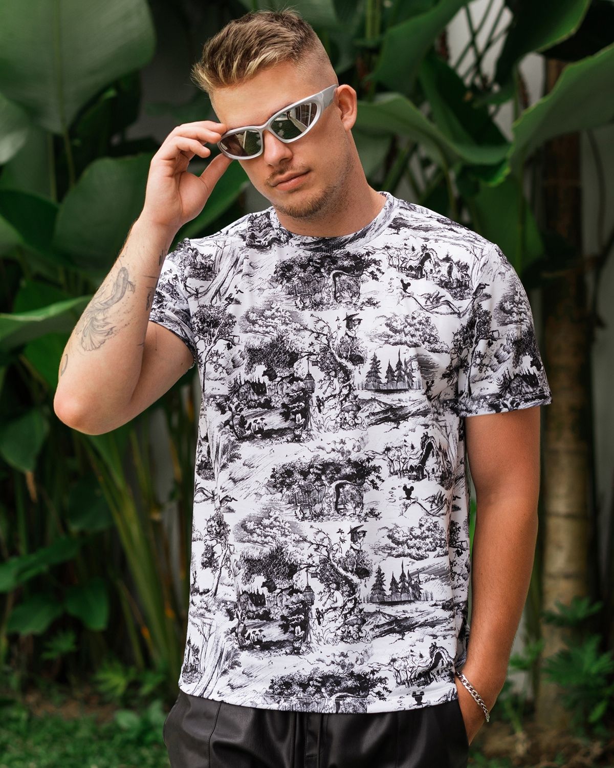 Мужская футболка, целиком покрытая принтом. С центральной части рисунок переходит на рукава и спину. Это картины, созданные художниками творческой лаборатории Sahar Art lab. Мы сами их придумываем и воплощаем в жизнь. А значит, похожих вы не найдёте ни у кого. Наносятся принты методом сублимационной печати. Это специальная техника, которая впечатывает краски в волокна ткани. Получаются износостойкие изделия, которые не боятся частых стирок в стиральной машине. Цвет остаётся свежим и ярким на протяжении нескольких сезонов.