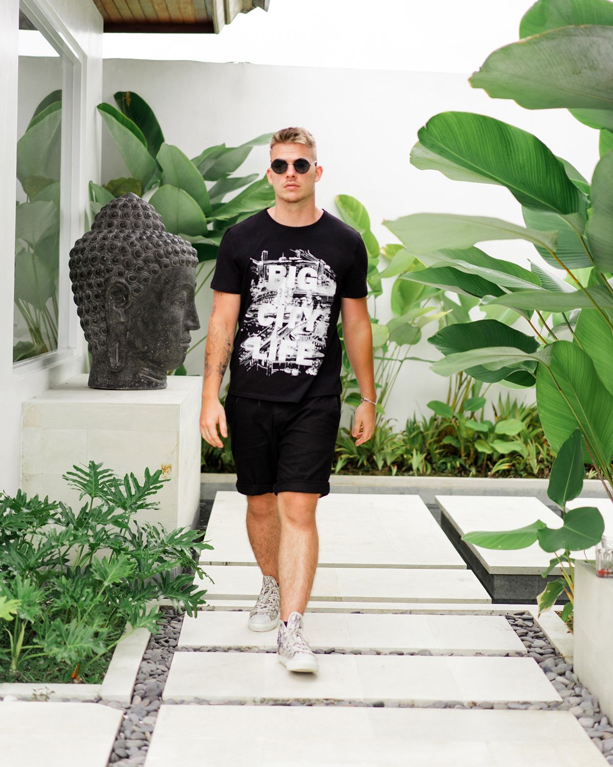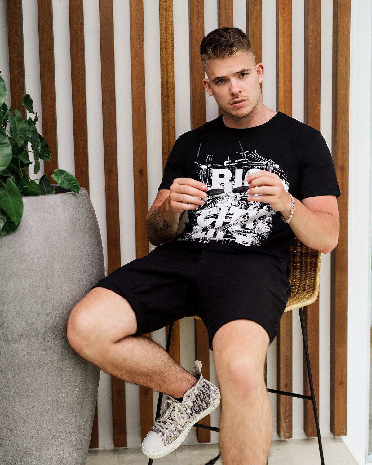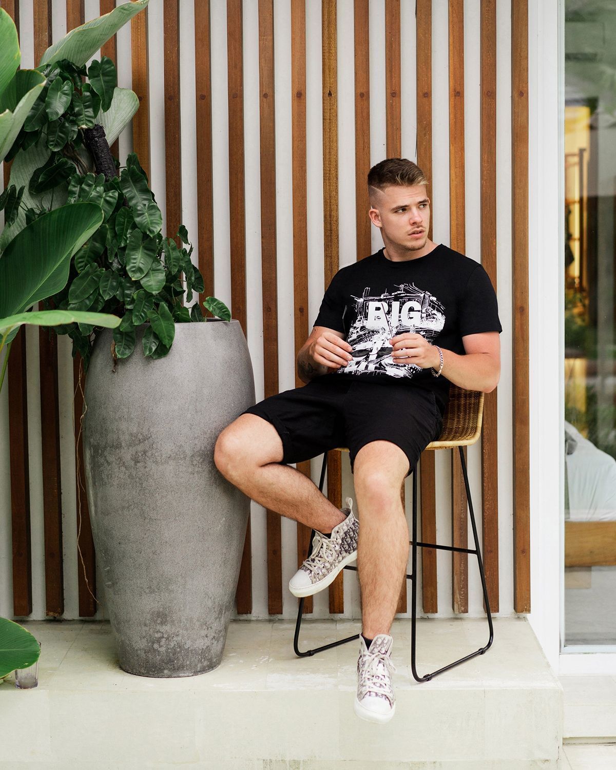Мужская футболка имеет стандартный крой. Если хотите, чтобы она сидела по фигуре, как на фото, берите свой размер, ориентируясь на таблицу. Если хочется эффекта оверсайз или немного свободной посадки, выбирайте на размер или два больше.
