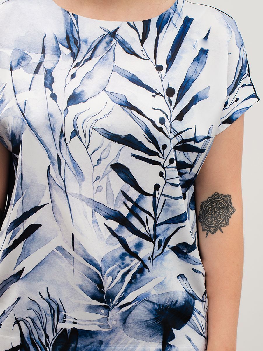 Спереди под принт используется шёлк «Армани». Это ткань, которая по внешнему виду похожа на натуральный шёлк. Но Армани намного проще в уходе, более упругая и плотная по структуре, а также хорошо удерживает краски рисунка в волокнах. Поэтому наши принты износостойкие, не крошатся, не линяют и остаются яркими на протяжении нескольких сезонов.