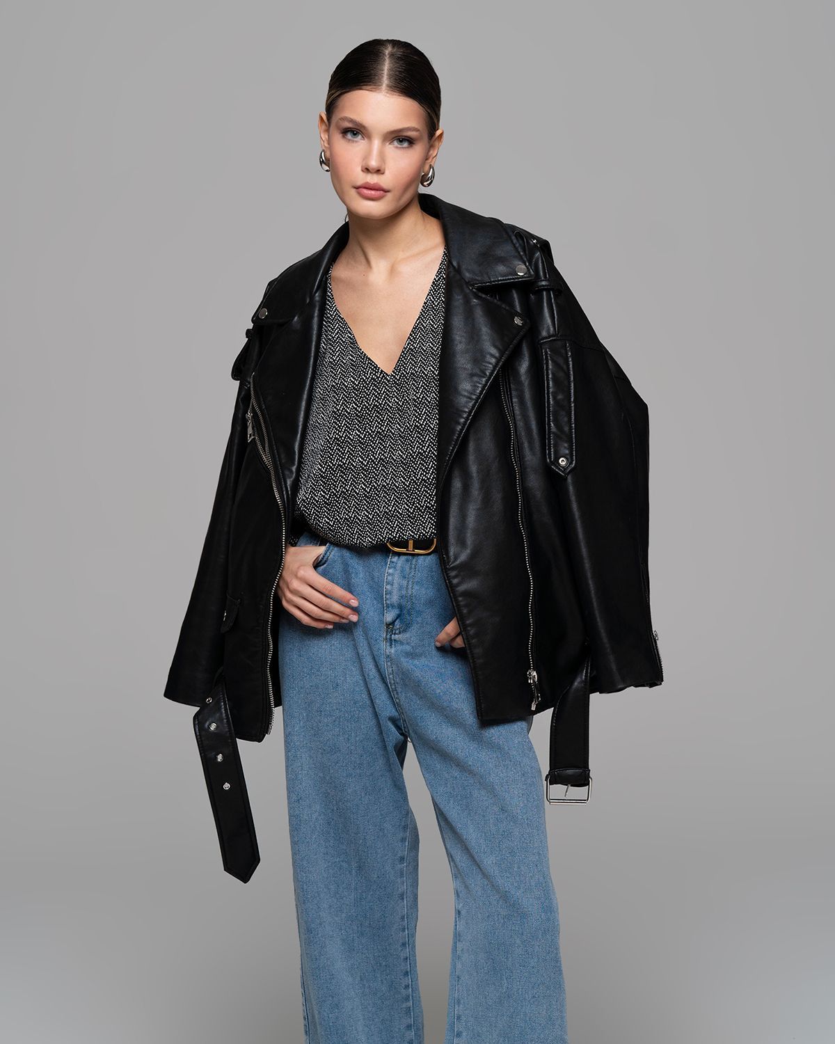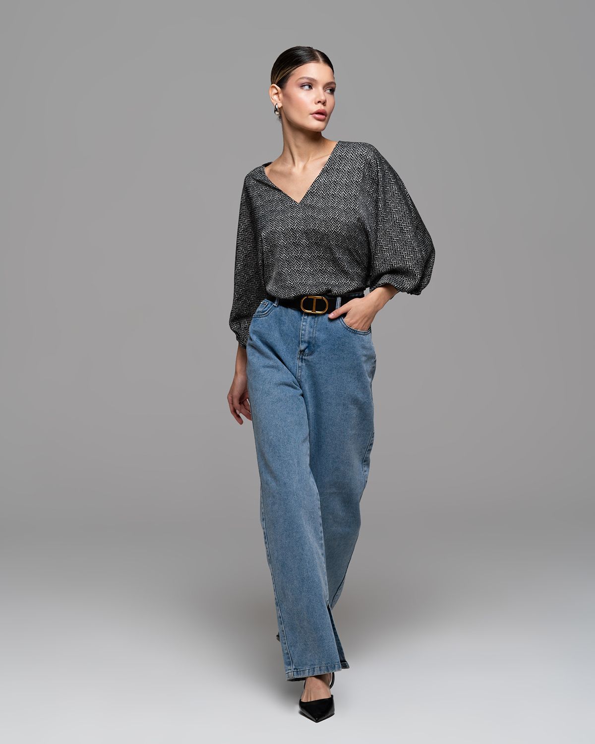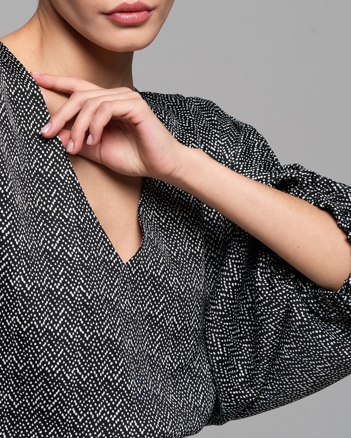 V-образный вырез визуально удлиняет шею. Ткань красиво струится.
