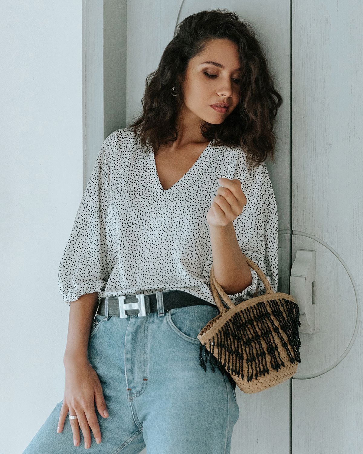V-образный вырез визуально удлиняет шею. Ткань красиво струится.
