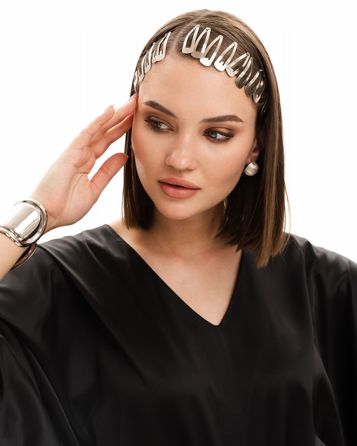 V-образный вырез визуально удлиняет шею. Ткань красиво струится.