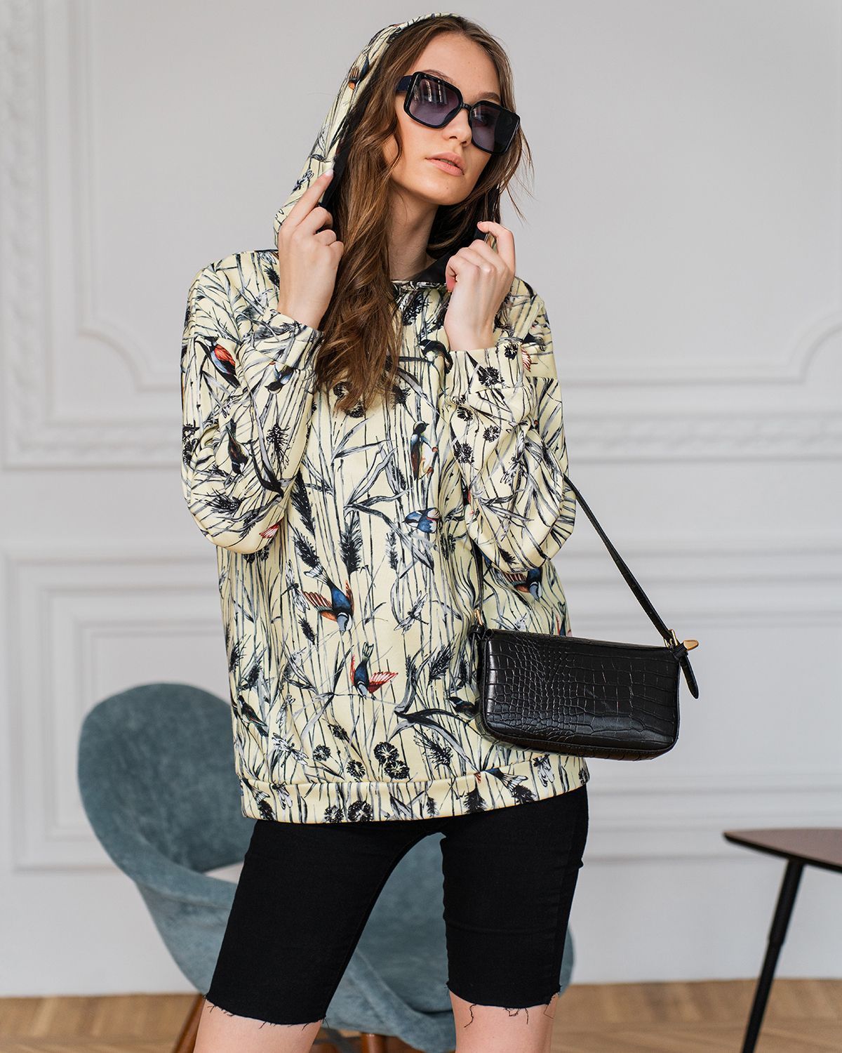 Худи женское оверсайз кроя, полностью покрытое принтом — это цельный холст, которым можно укрыться от всех пасмурных ненастий. Кофта с капюшоном сделана из приятного для тела материала интерлок. Внутри это хлопок, а снаружи специальный слой для печати рисунка. Принт, нанесённый на ткань методом сублимационной печати — гарантия долгожительства красок, их яркости и сочности. Рисунки не выстирываются даже после 50 стирок! Капюшон украшает шелковая подкладка, которая красиво переливается и служит дополнительным декором, привлекающим внимание. Худи женское тёплое имеет свободный крой. Учитывайте, что толстовка женская оверсайз и должна иметь свободную посадку. На модели надет самый маленький размер (42-44).