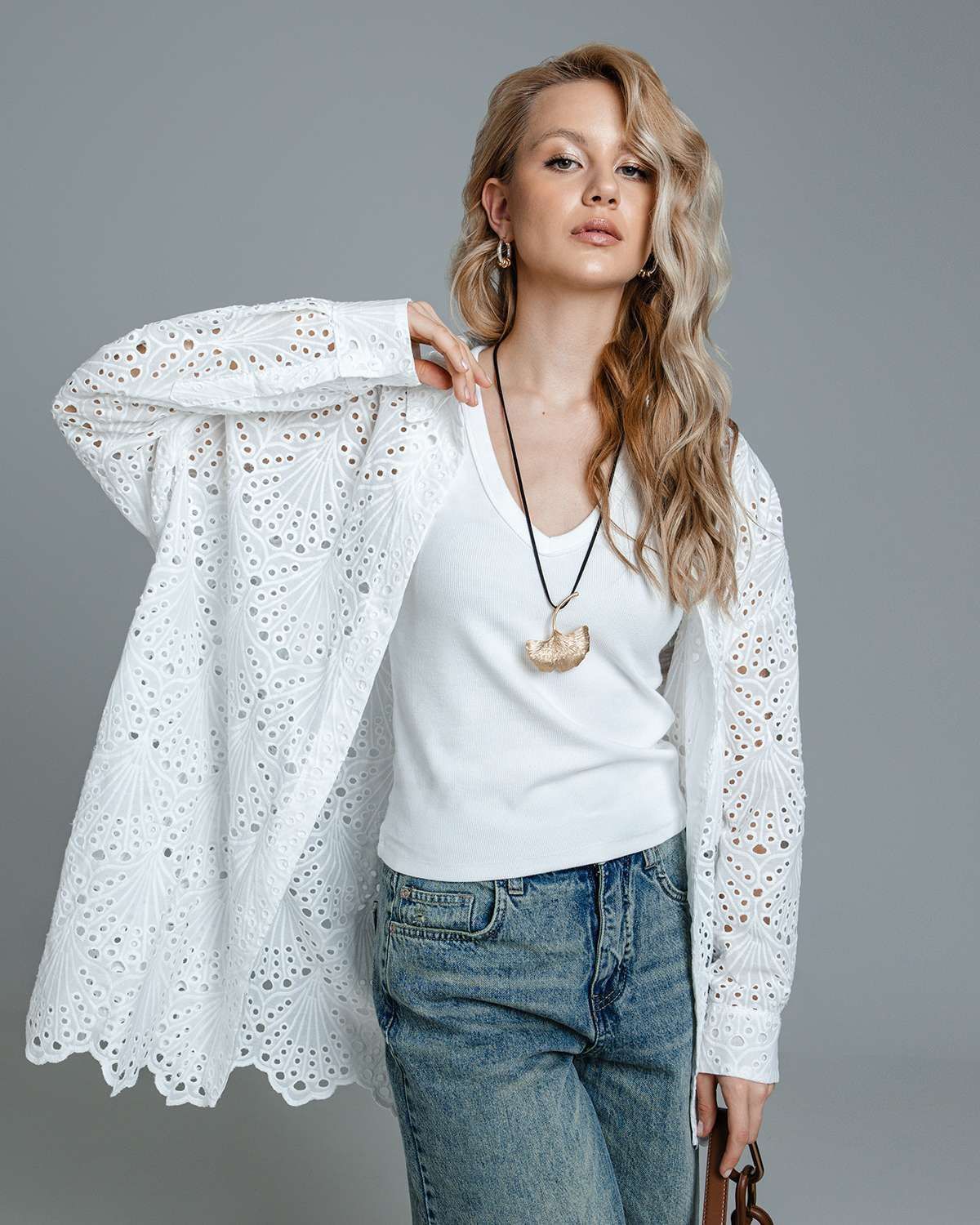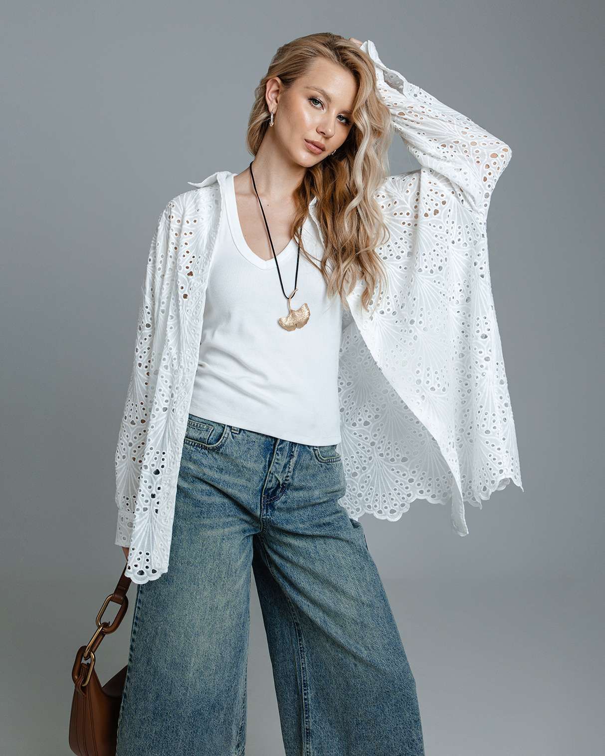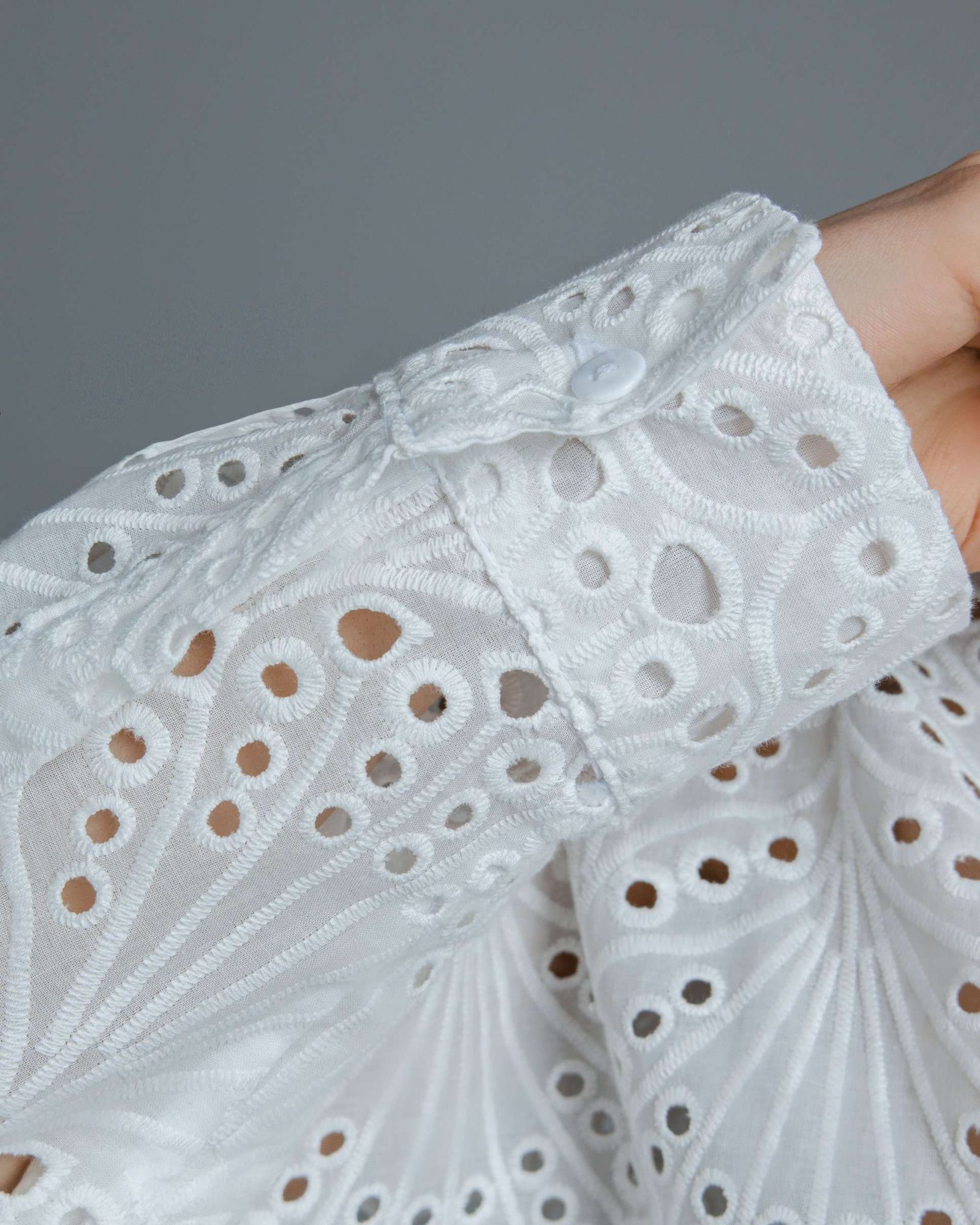 Длинные рукава со спущенной линией плеч для свободы движений и модного акцента.