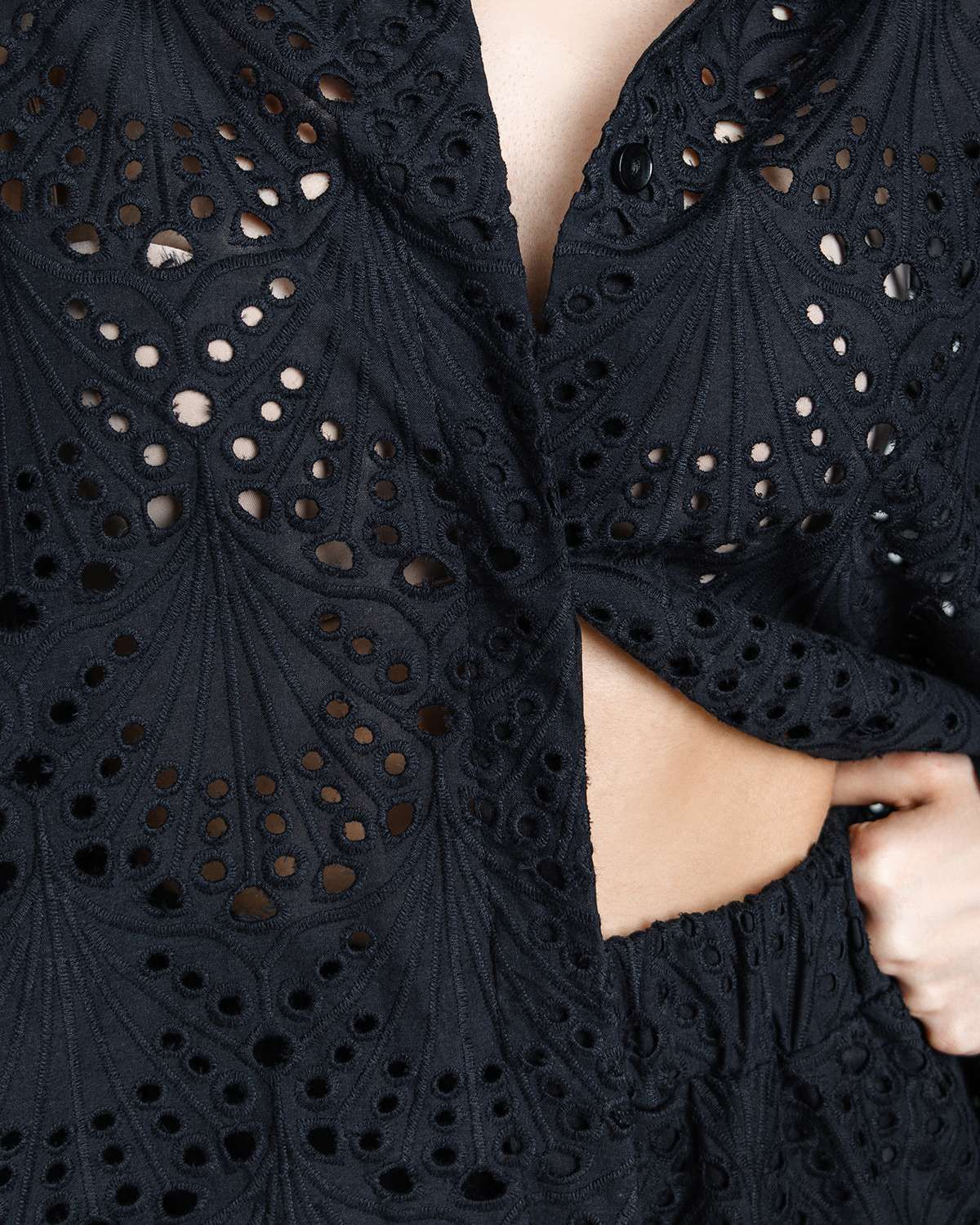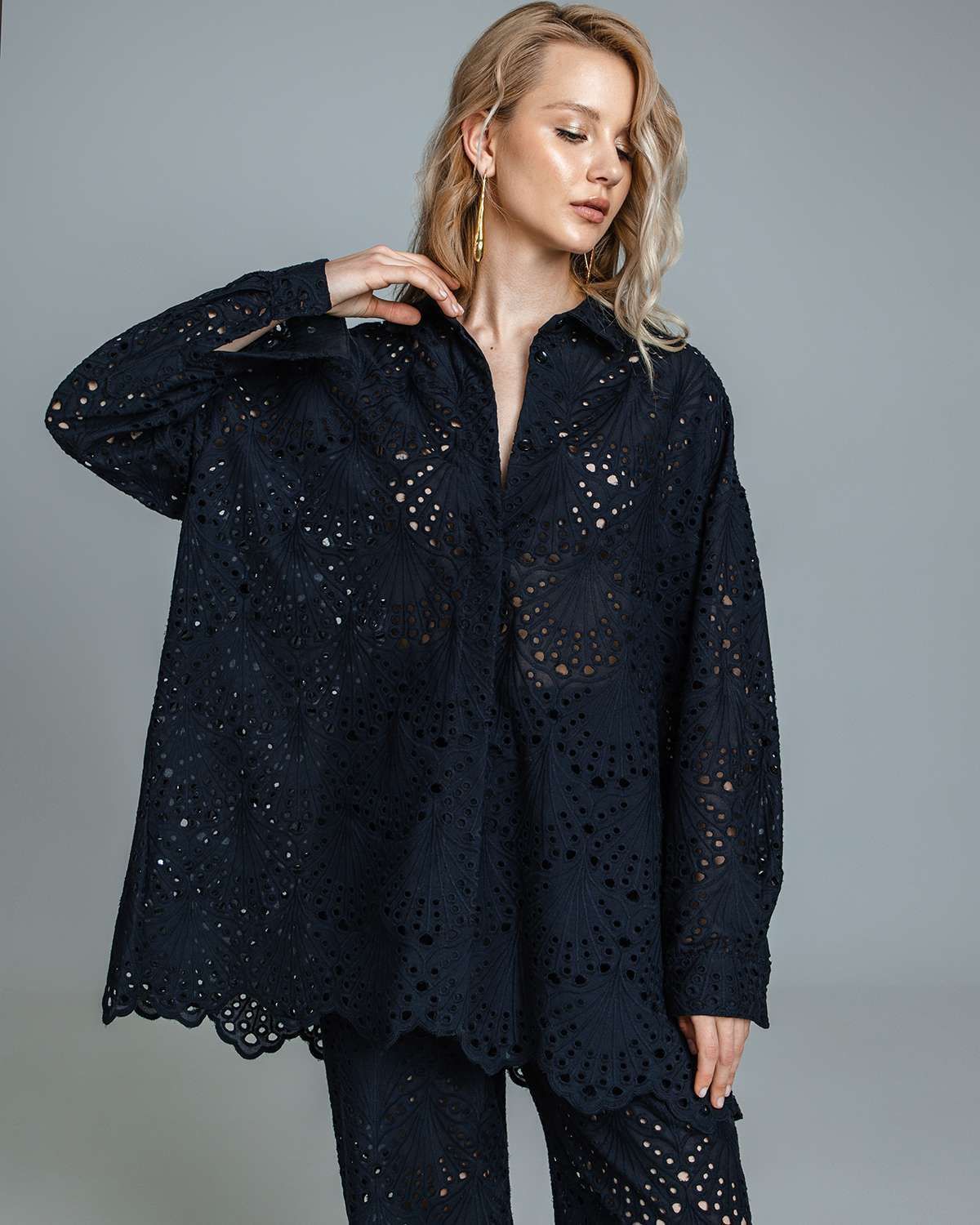 Длинные рукава со спущенной линией плеч для свободы движений и модного акцента.