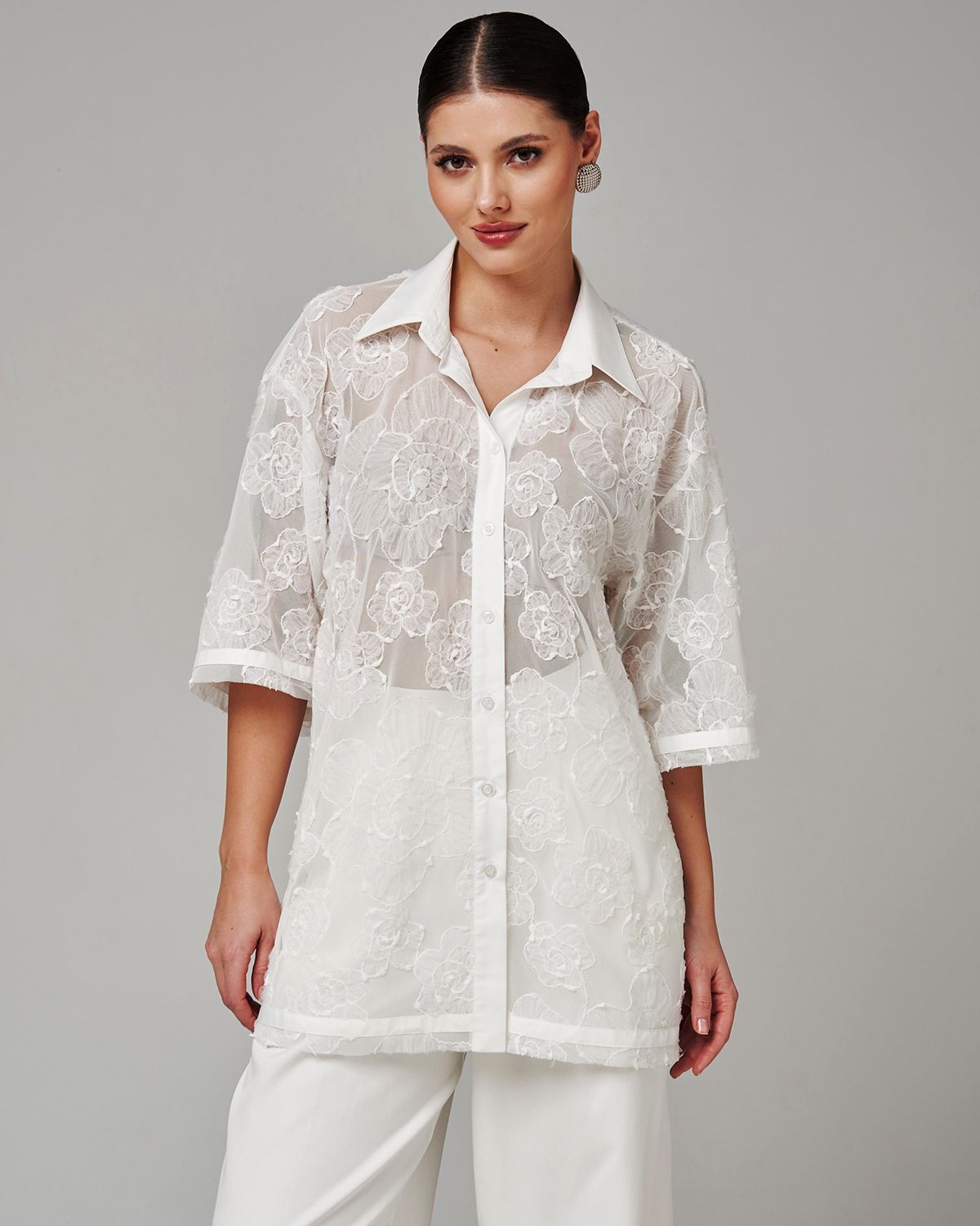 Представляем вам женственную блузку от SAHAR Art lab, которая станет настоящим украшением вашего гардероба! Эта прозрачная рубашка с короткими рукавами из легкой сетки с отложным воротником и спущенным рукавом создана для тех, кто ценит комфорт и стиль. Прозрачная ткань с нежными розочками добавит вашему образу романтичности и воздушности. Свободный крой оверсайз позволит вам чувствовать себя свободно и уверенно в любой ситуации. Рубашка на пуговицах с пуговицами в цвет изделия станет идеальным вариантом как для офиса, так и для повседневных образов. Она прекрасно сочетается как с брюками, так и с юбками, создавая стильные многослойные ансамбли.