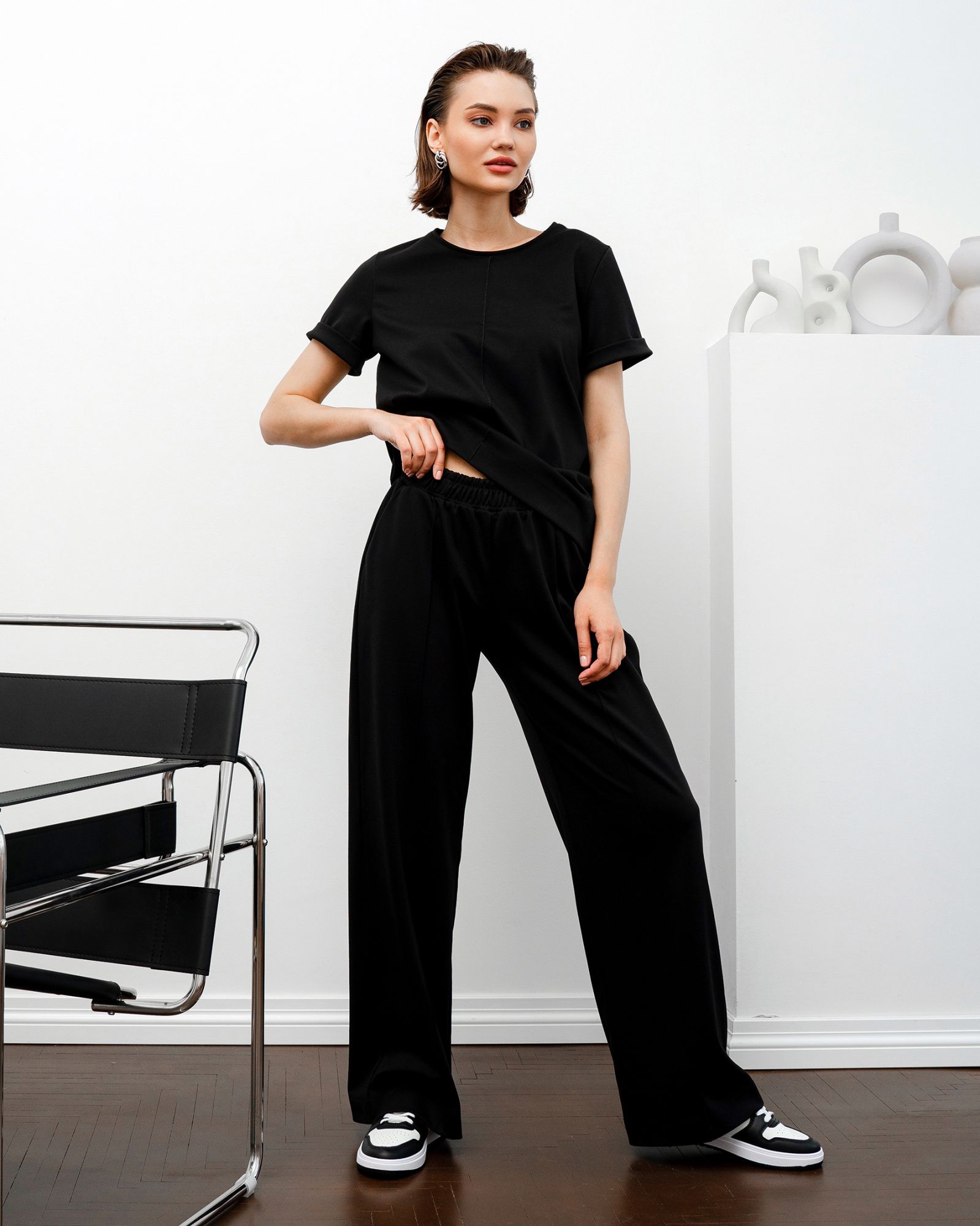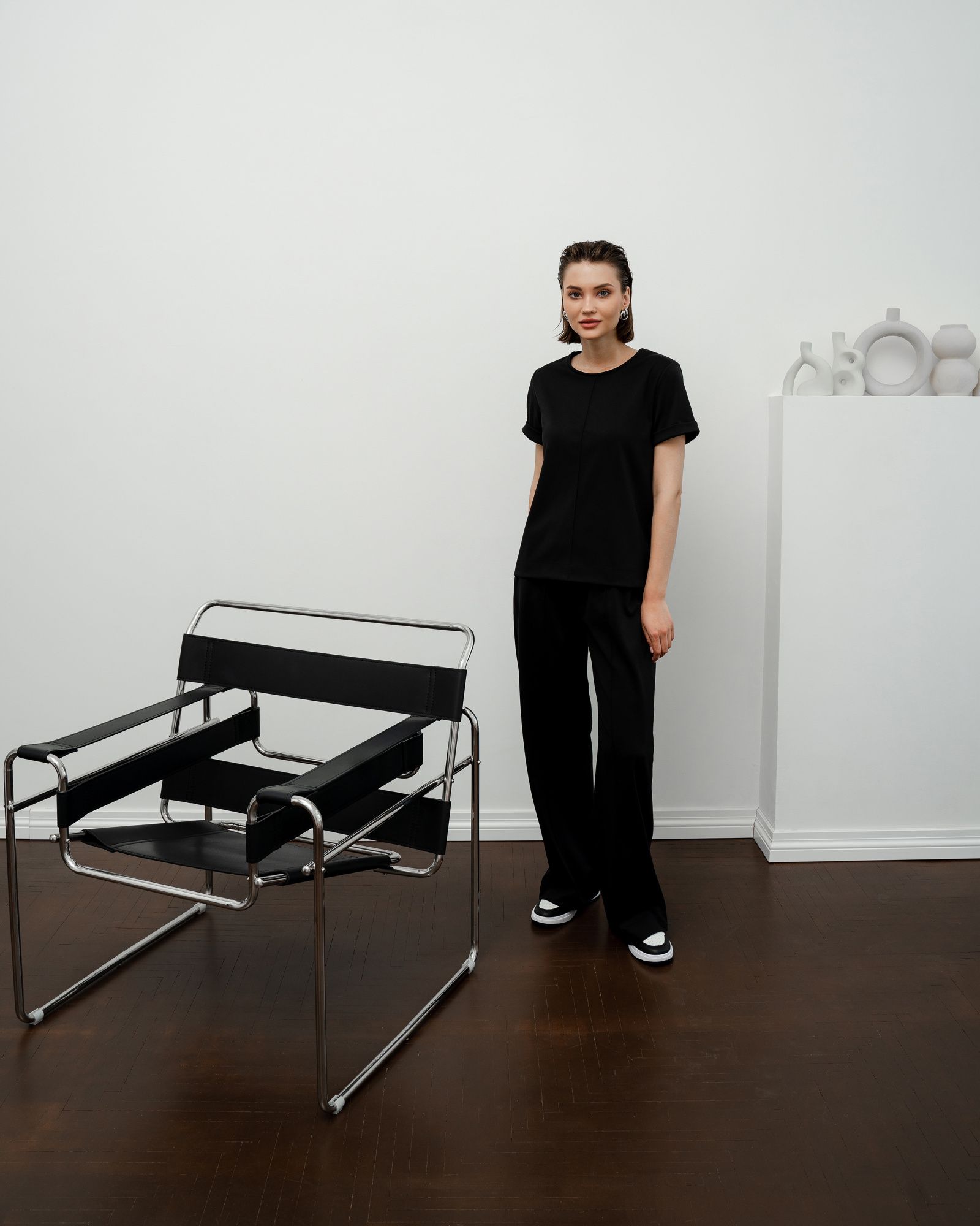 Стильные брюки выполнены из трикотажа Антипилинг. Брюки с карманами, штанины прямые.