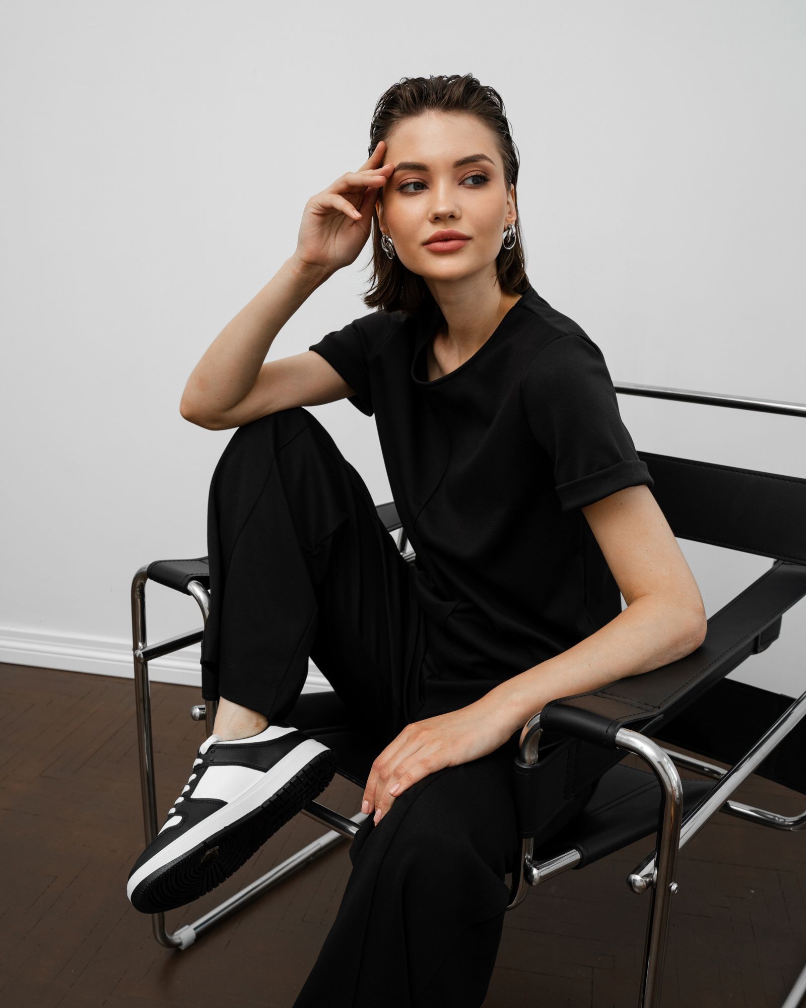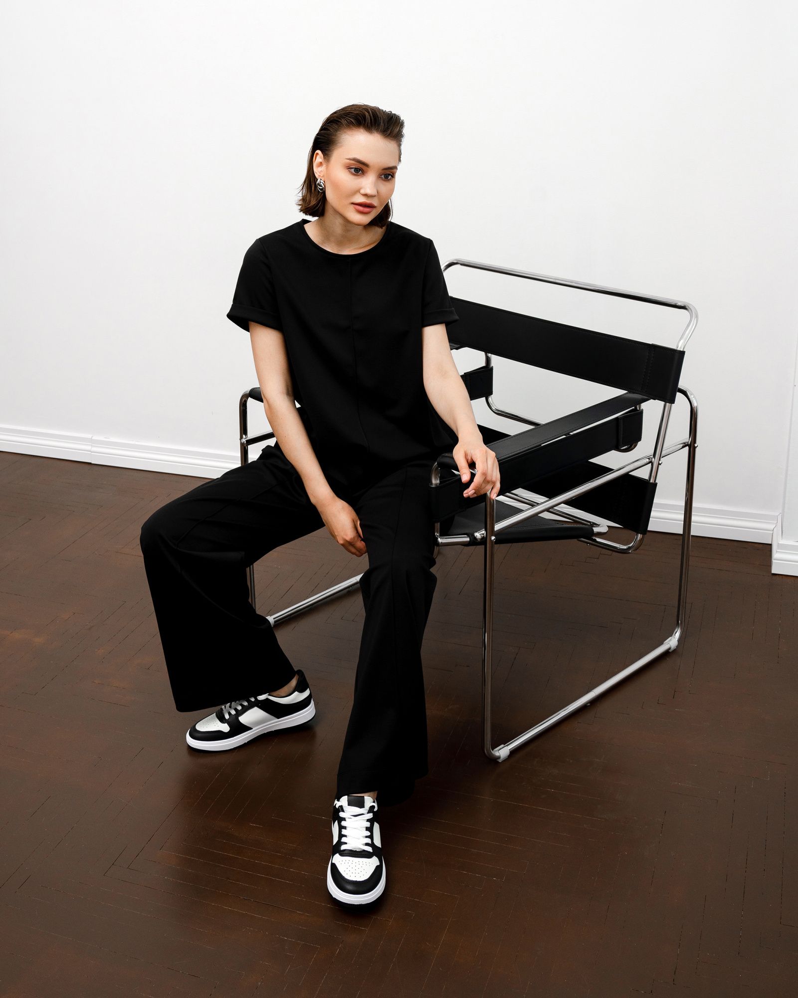 На передней полке выполнен декоративный шов, благодаря которому вытягивается силуэт.
