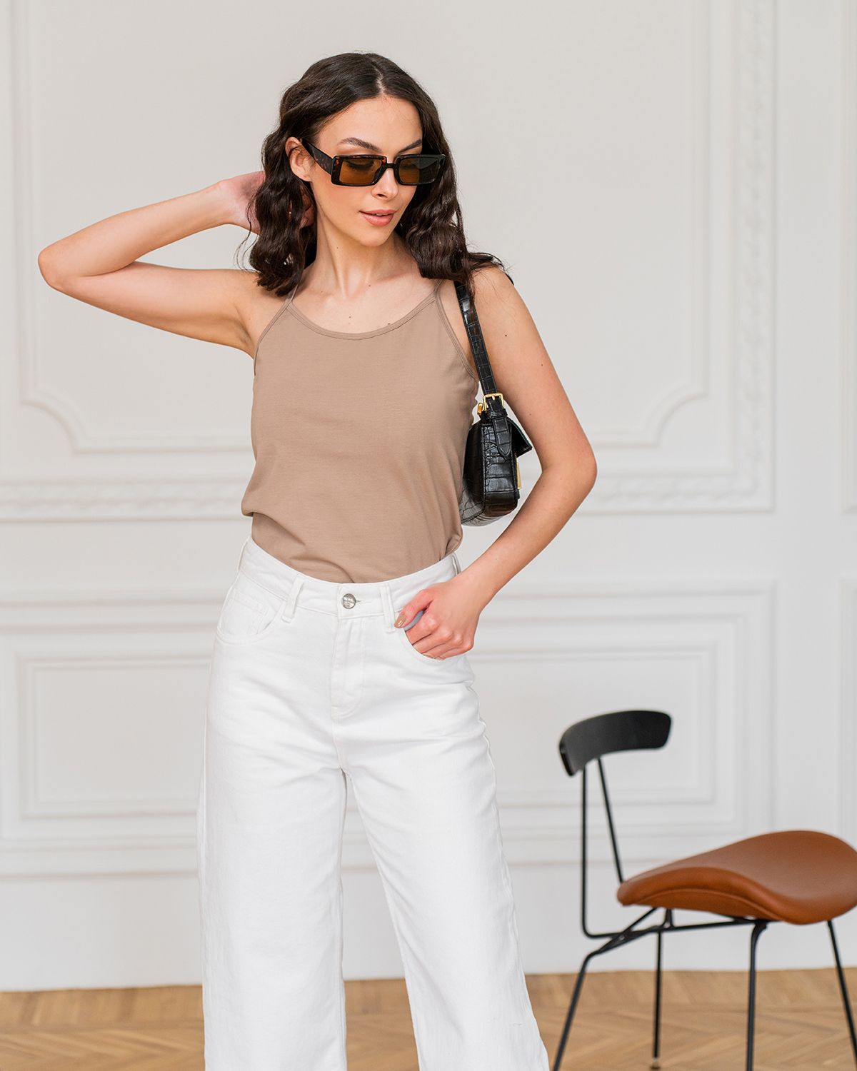 Топ женский в бельевом стиле надолго закрепился как универсальная вещь, которую можно надевать с чем угодно. Он часто становится прекрасной основой для многослойных образов с жакетами, пиджаками, кардиганами, хорошо сочетается с полупрозрачными вещами из сетки, шифона и других легких тканей, позволяет при необходимости сделать более скромным наряд с глубоким декольте и прекрасно справляется с созданием комфортных образов с рубашкой. Топ на тонких бретелях конечно же отлично смотрится и как самостоятельная единица. Майка женская однотонная сделана из премиальной турецкой хлопковой кулирки, которая отличается износостойкостью. Её можно спокойно стирать, она не теряет цвет, не садится и не подвержена образованию катышков.