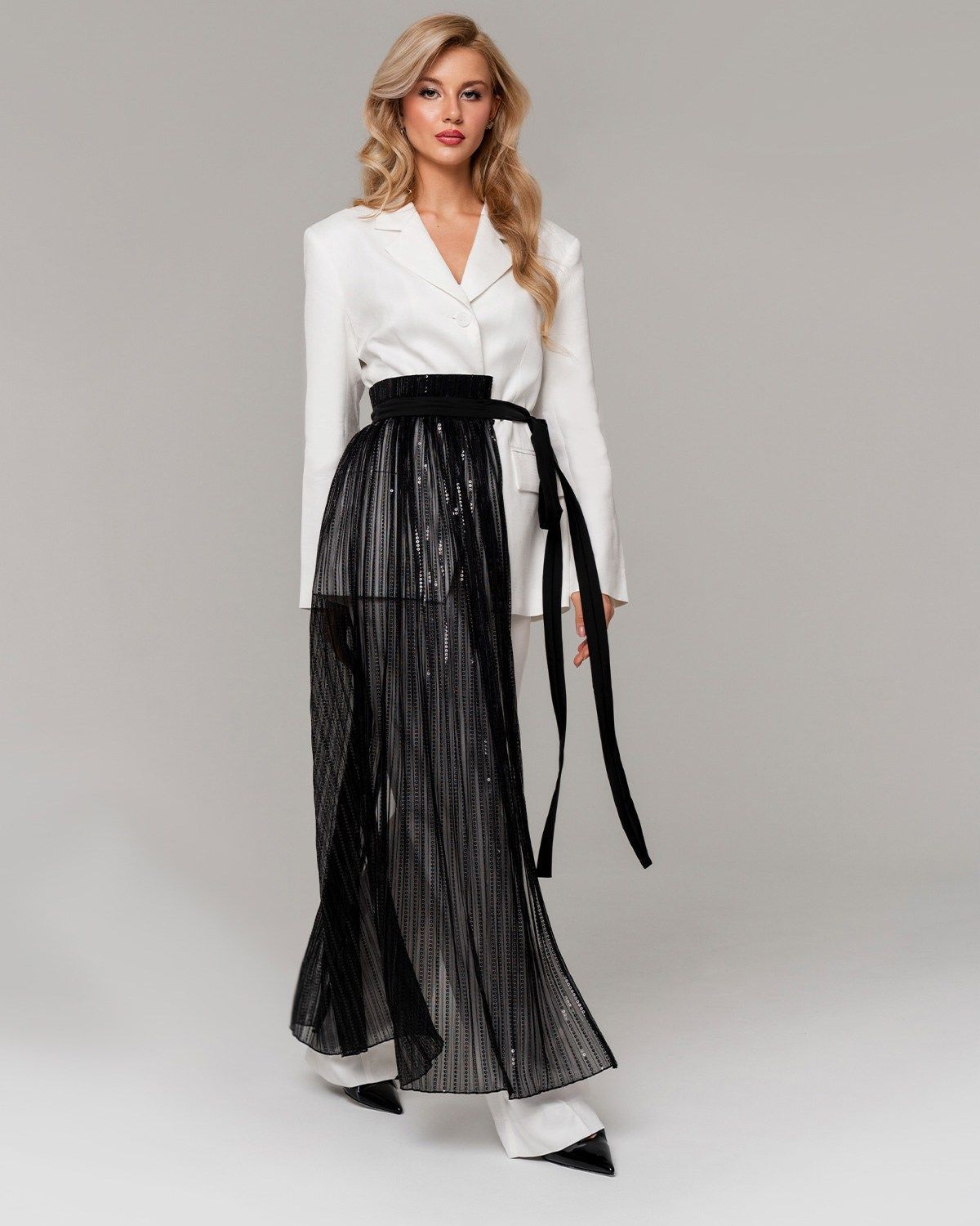 Особое внимание привлекает пояс-юбка прозрачная, добавляя нотку загадочности и дерзости в классический образ. Баска асимметричная и юбка гофре с пайетками вносят элемент драматичности и блеска, делая каждый ваш выход незабываемым. Это не просто аксессуар, а истинное воплощение высокого стиля и модного искусства в вашем гардеробе.