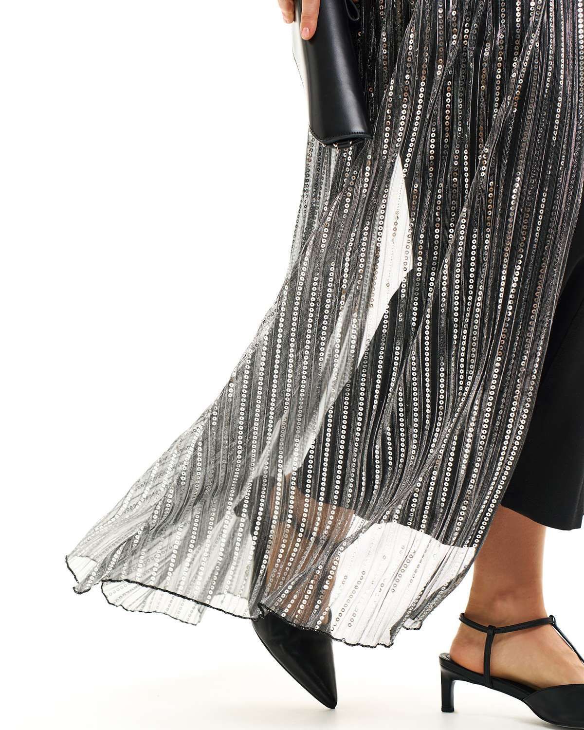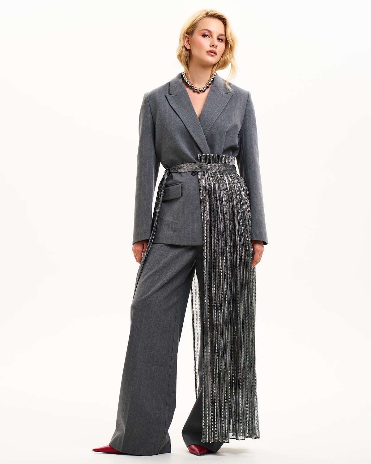 Особое внимание привлекает пояс-юбка прозрачная, добавляя нотку загадочности и дерзости в классический образ. Баска асимметричная и юбка гофре с пайетками вносят элемент драматичности и блеска, делая каждый ваш выход незабываемым. Это не просто аксессуар, а истинное воплощение высокого стиля и модного искусства в вашем гардеробе.