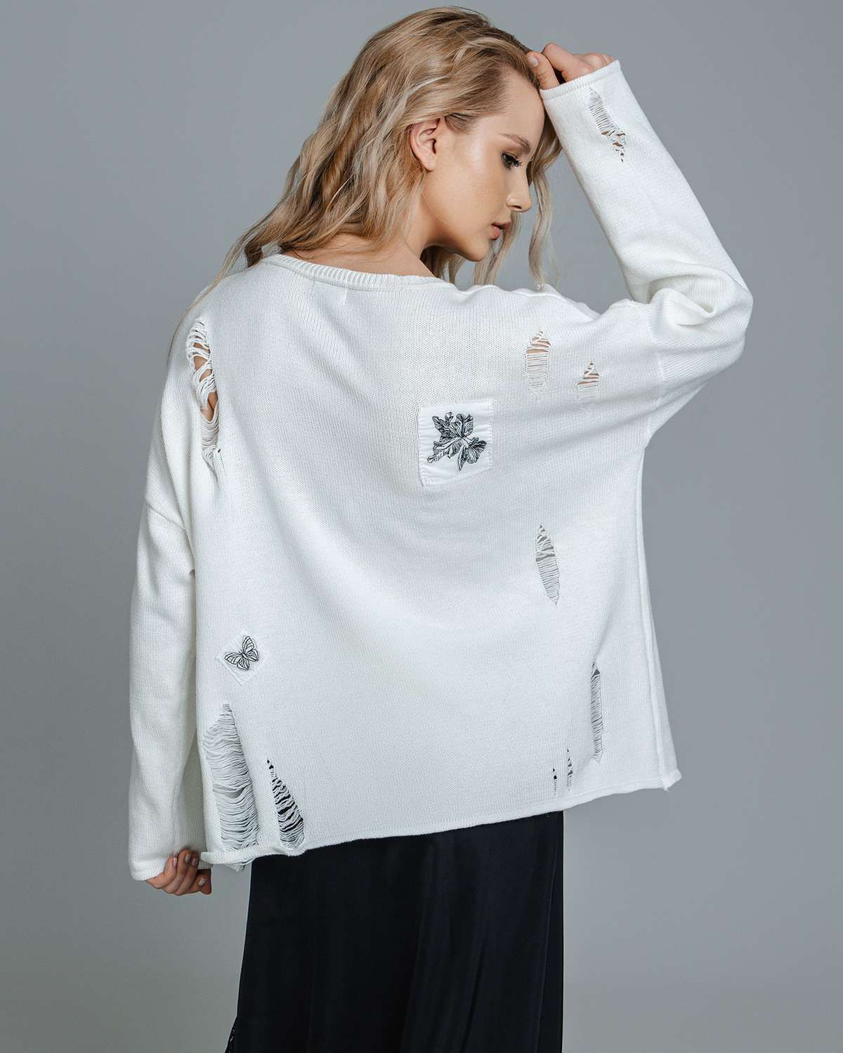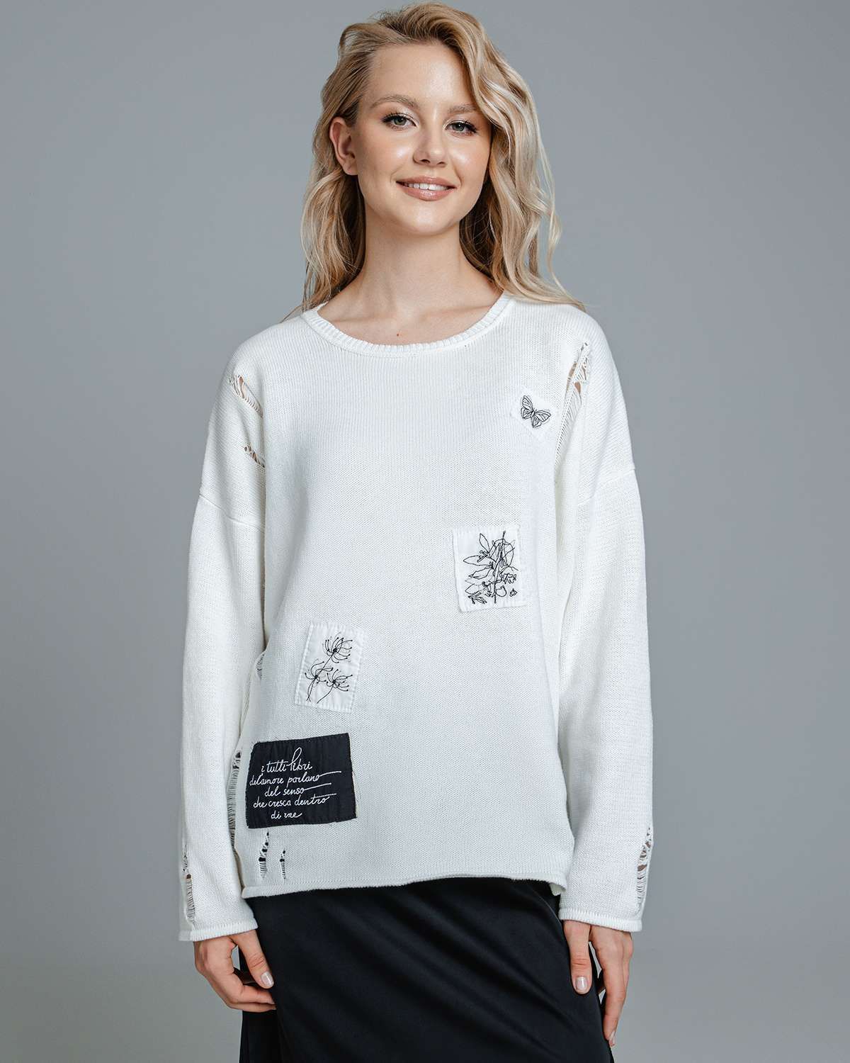 Наш дизайнерский свитер с декоративными распущенными петлями – это не просто одежда, а воплощение стиля. Женский джемпер, выполненный в технике плотной вязки, излучает тепло и комфорт, при этом обладает свободным кроем, что делает его идеальным для создания слоев и подчеркивания индивидуальности. Особенно впечатляют его абстрактные рисунки и уникальный жаккардовый узор разных фактур, которые придают изделию особый характер.