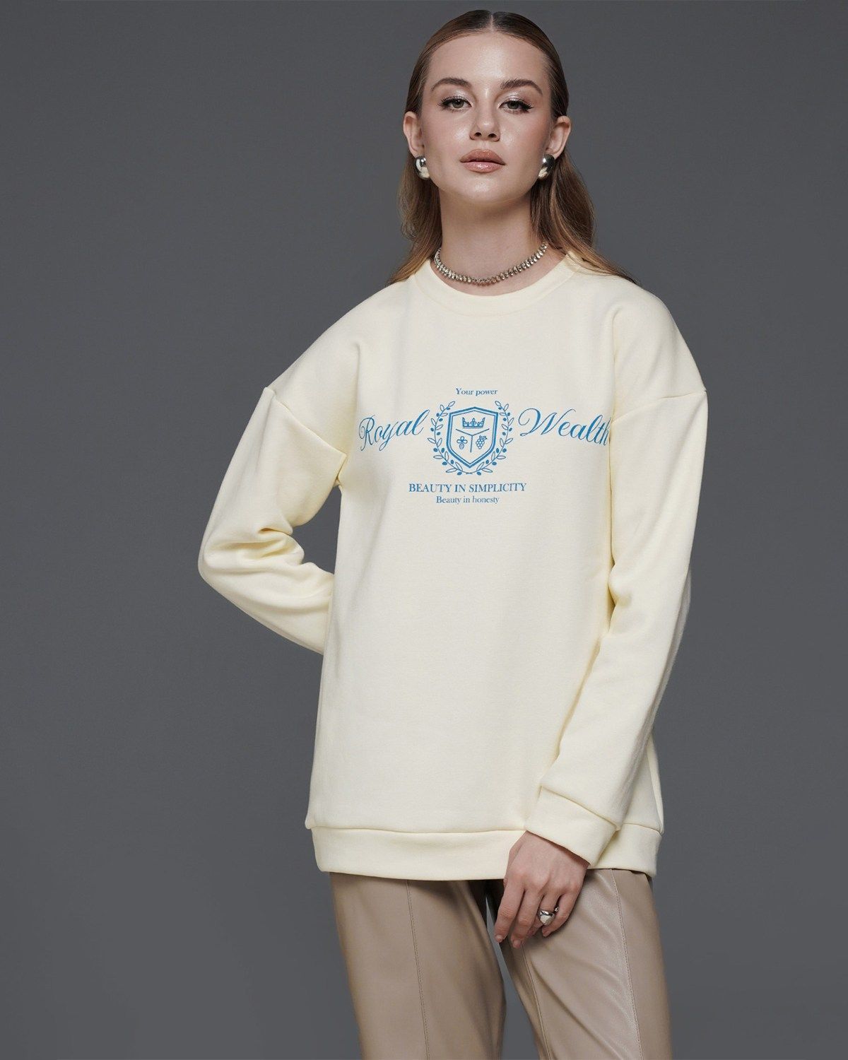 Модель без воротника, с округлым вырезом горловины и длинными рукавами представлена в широком размерном ряде. Наличие больших и маленьких размеров позволяет приобретать изделие женщинам разного возраста, роста и типа фигуры. Свитшот одинаково хорошо будет сидеть на полных и стройных дамах, высокого и невысокого роста. Подходит для беременных женщин.