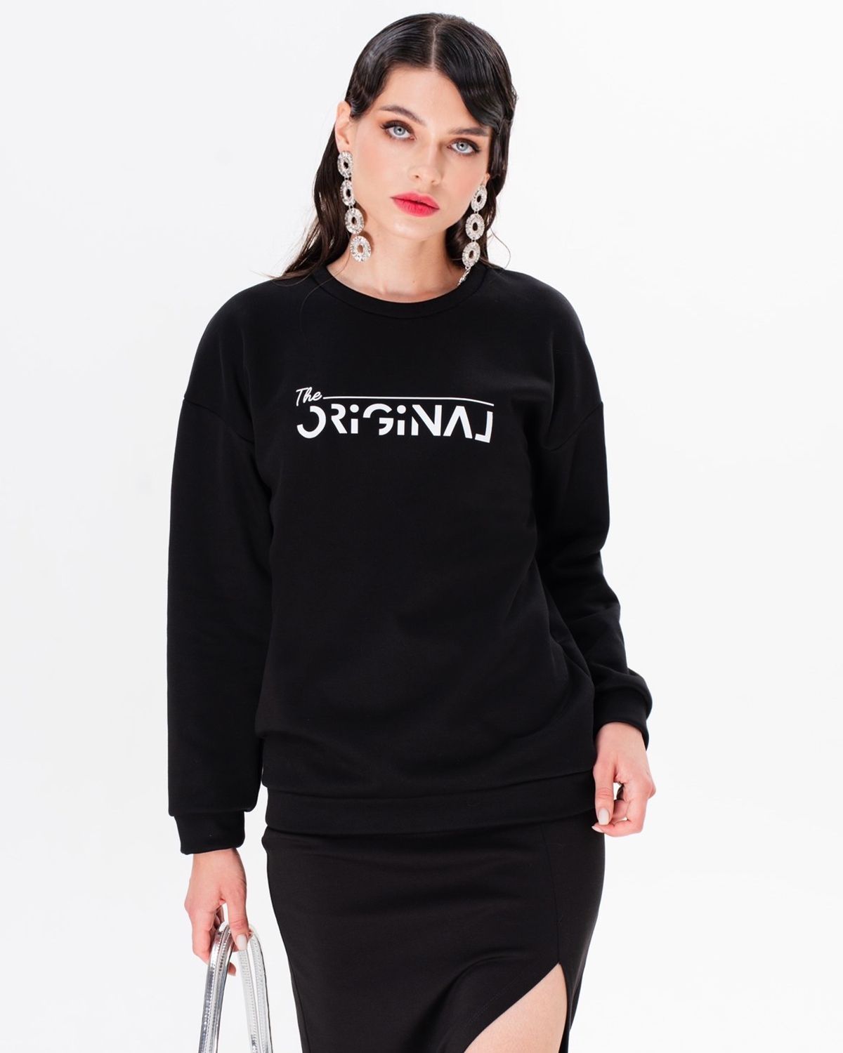 Модель без воротника, с округлым вырезом горловины и длинными рукавами представлена в широком размерном ряде. Наличие больших и маленьких размеров позволяет приобретать изделие женщинам разного возраста, роста и типа фигуры. Свитшот одинаково хорошо будет сидеть на полных и стройных дамах, высокого и невысокого роста. Подходит для беременных женщин.