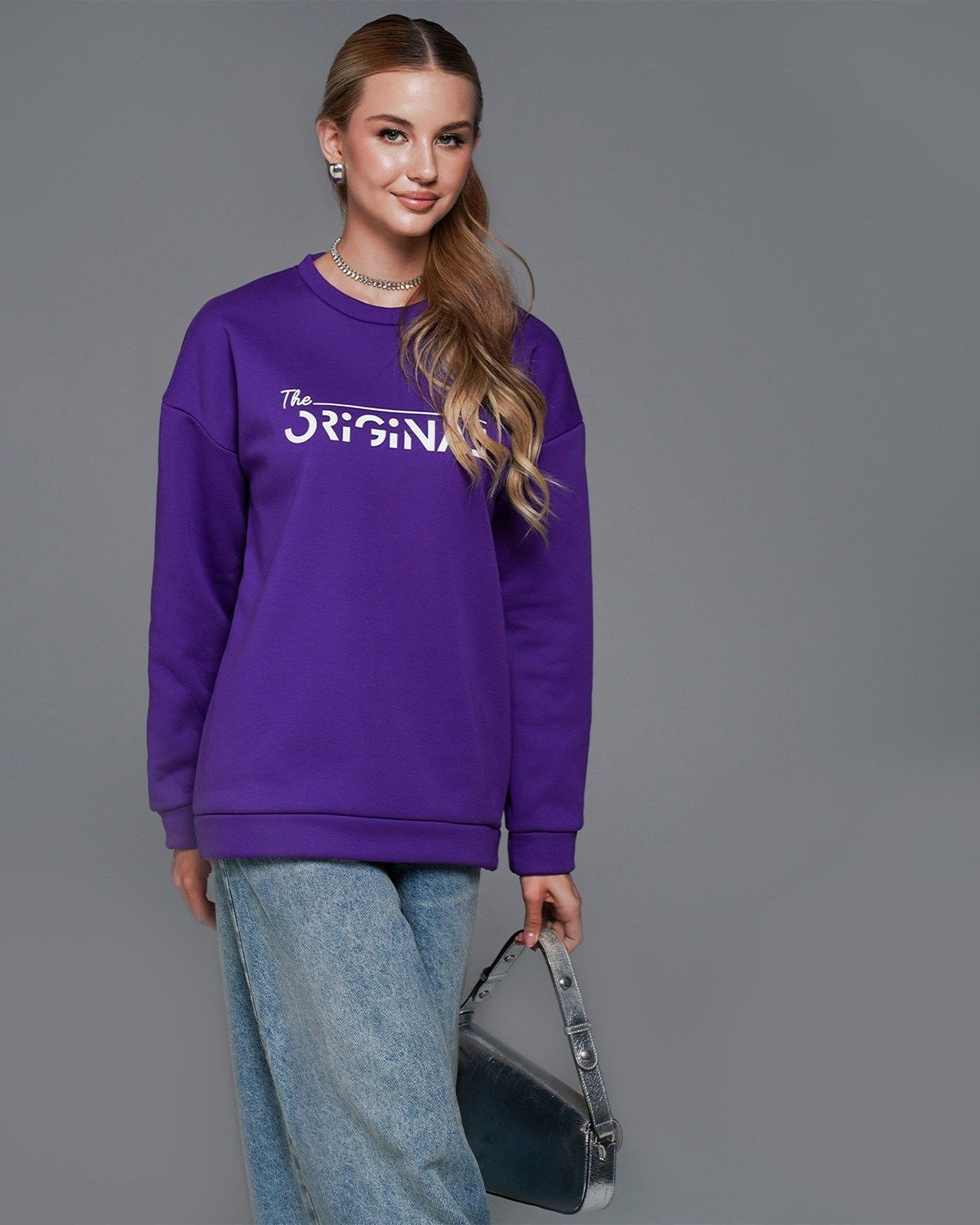 Модель без воротника, с округлым вырезом горловины и длинными рукавами представлена в широком размерном ряде. Наличие больших и маленьких размеров позволяет приобретать изделие женщинам разного возраста, роста и типа фигуры. Свитшот одинаково хорошо будет сидеть на полных и стройных дамах, высокого и невысокого роста. Подходит для беременных женщин.