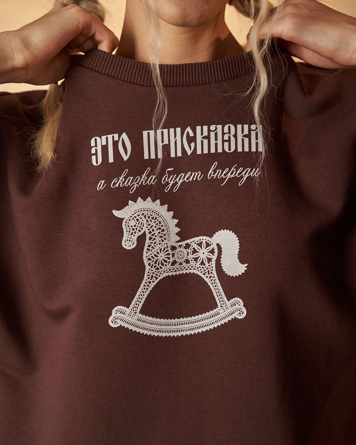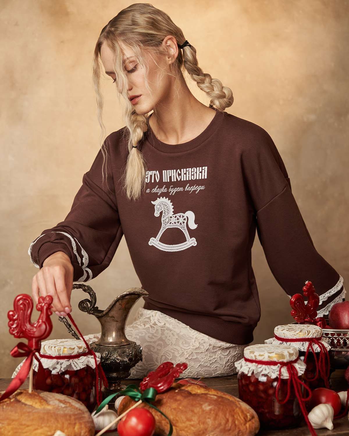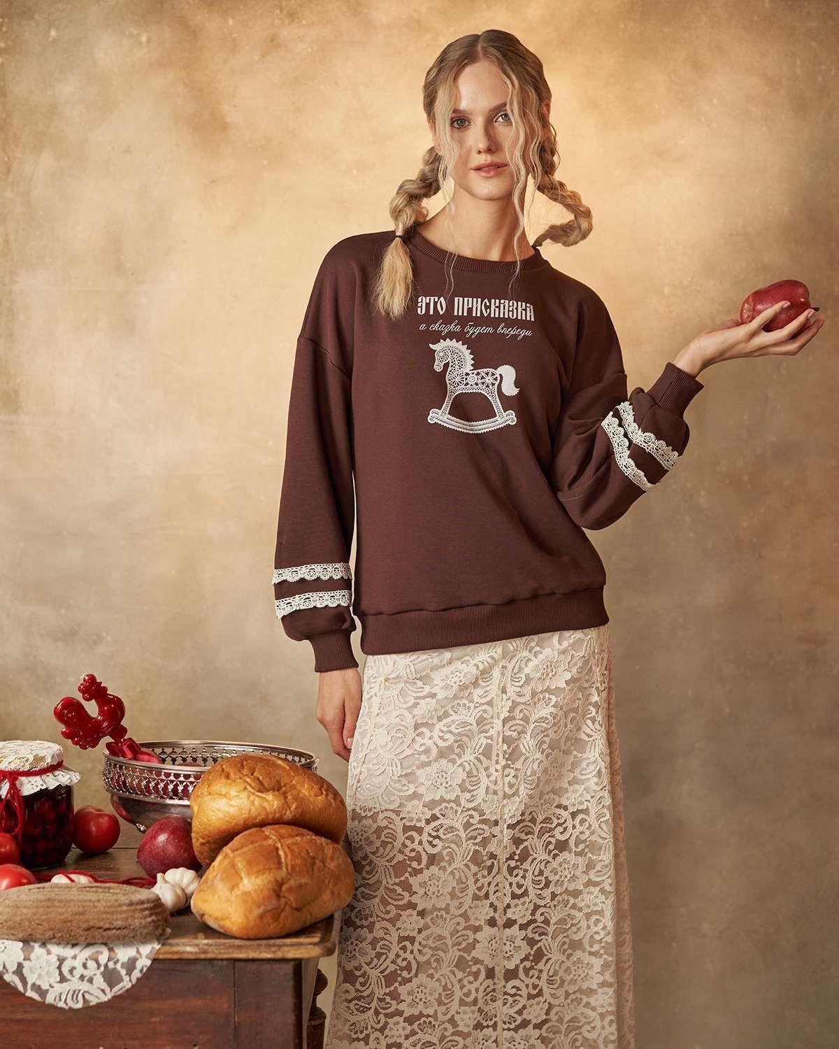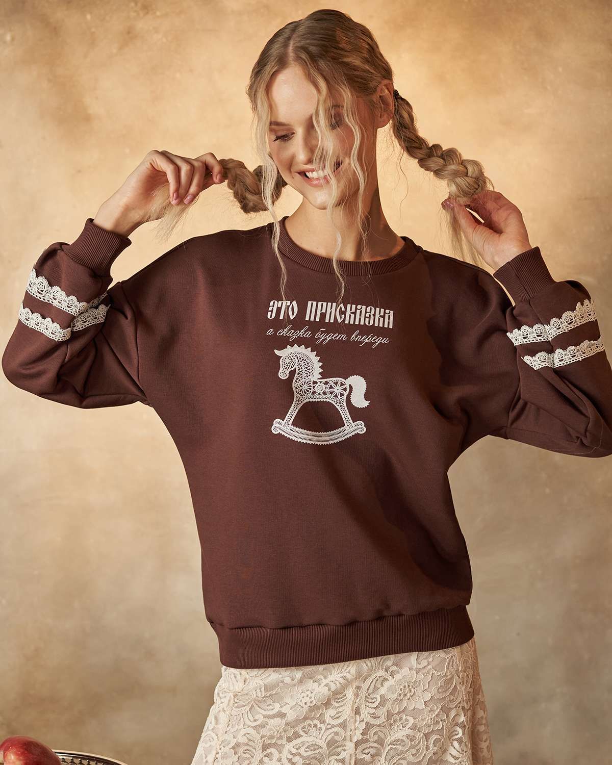 Свитшот выделяется свободным кроем и оригинальностью дизайна. Его особенность — объемные рукава, придающие образу легкость и комфорт. Передняя часть украшена оригинальным принтом в виде детской лошадки-качалки из белого кружева, что добавляет изделию уникальность и напоминает о традициях России, воплощая дух национального стиля. Особое внимание уделено деталям: на рукавах расположены элегантные кружевные белые полоски, гармонично сочетающиеся с цветом изделия.
