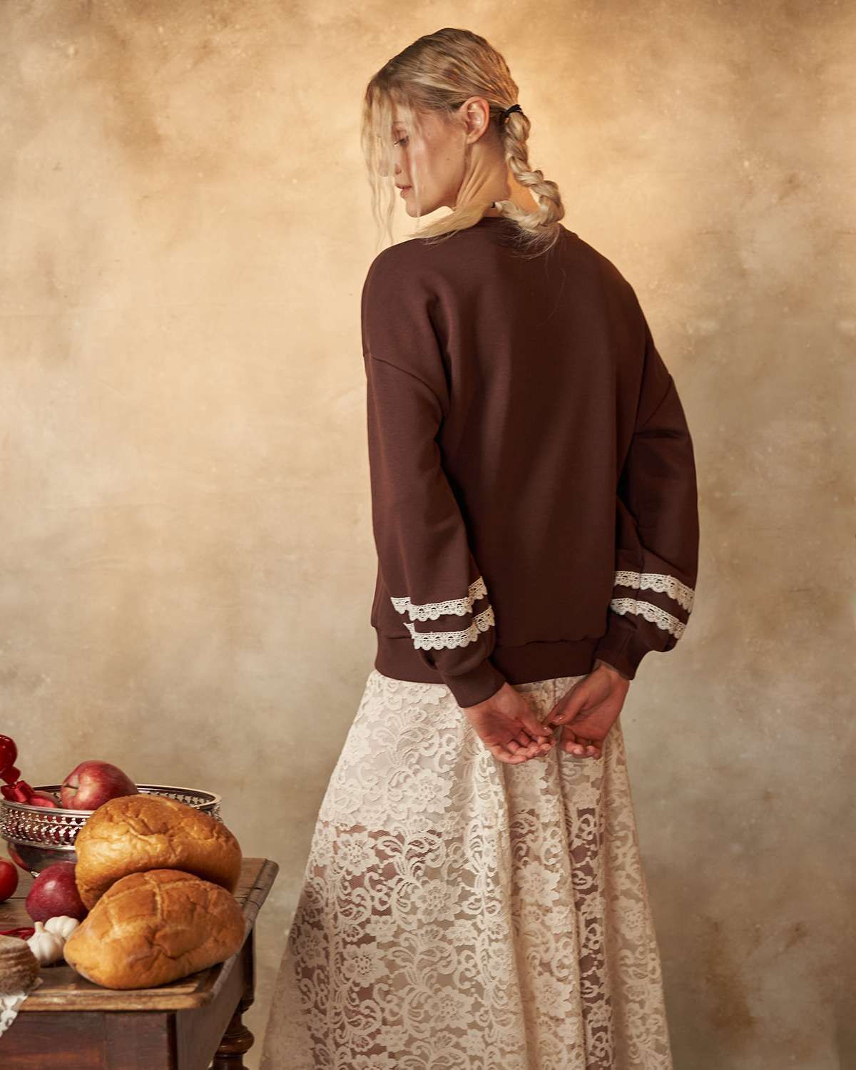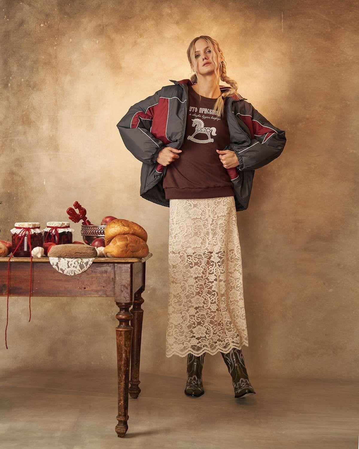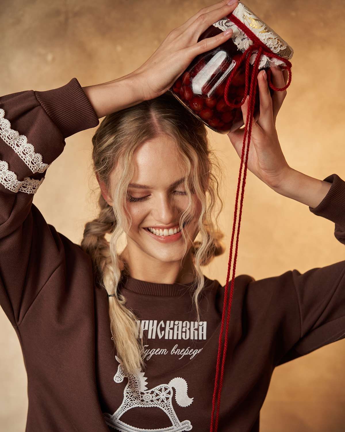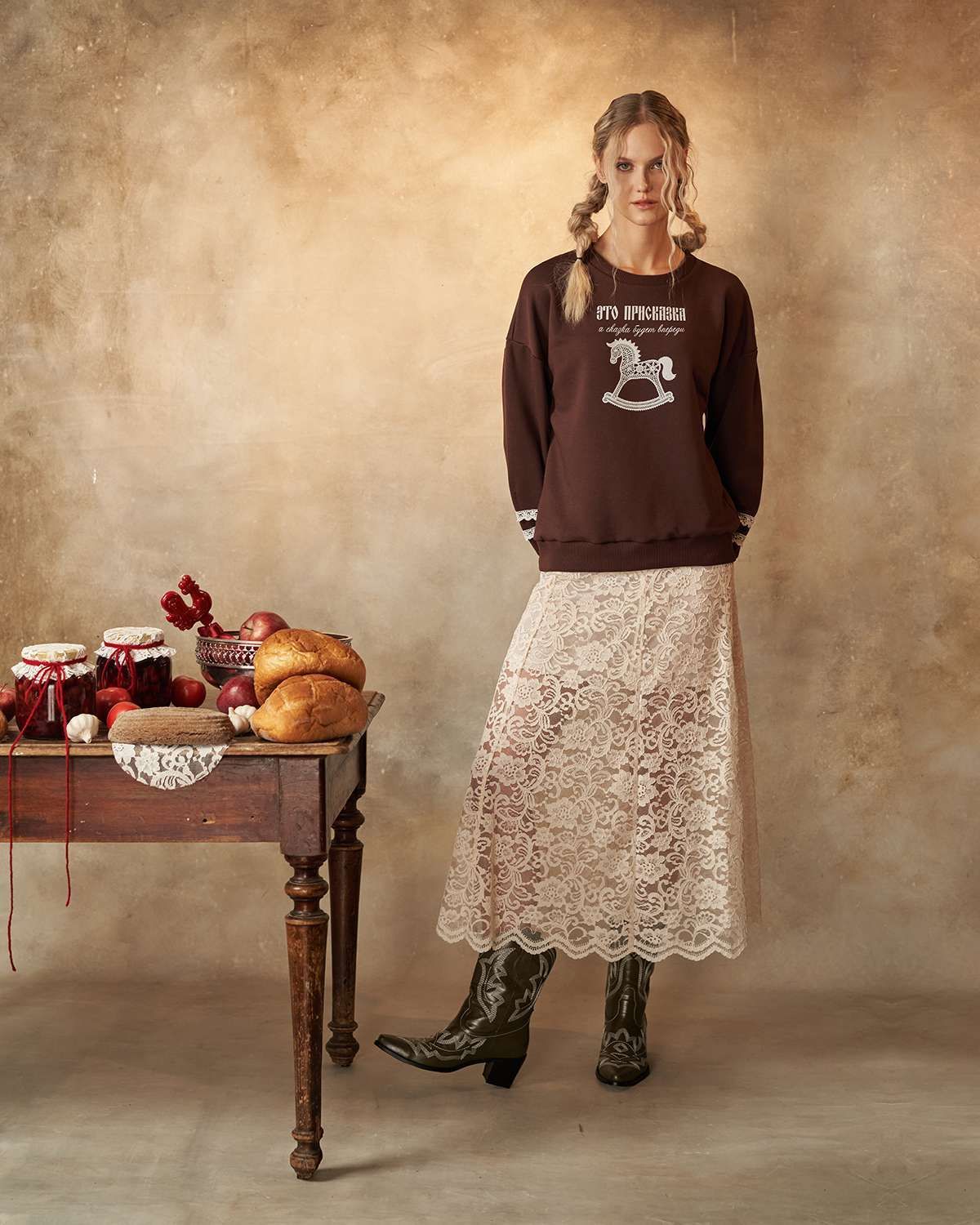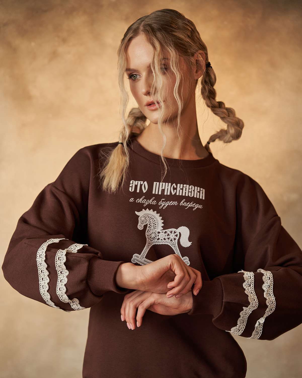 Свитшот выделяется свободным кроем и оригинальностью дизайна. Его особенность — объемные рукава, придающие образу легкость и комфорт. Передняя часть украшена оригинальным принтом в виде детской лошадки-качалки из белого кружева, что добавляет изделию уникальность и напоминает о традициях России, воплощая дух национального стиля. Особое внимание уделено деталям: на рукавах расположены элегантные кружевные белые полоски, гармонично сочетающиеся с цветом изделия.