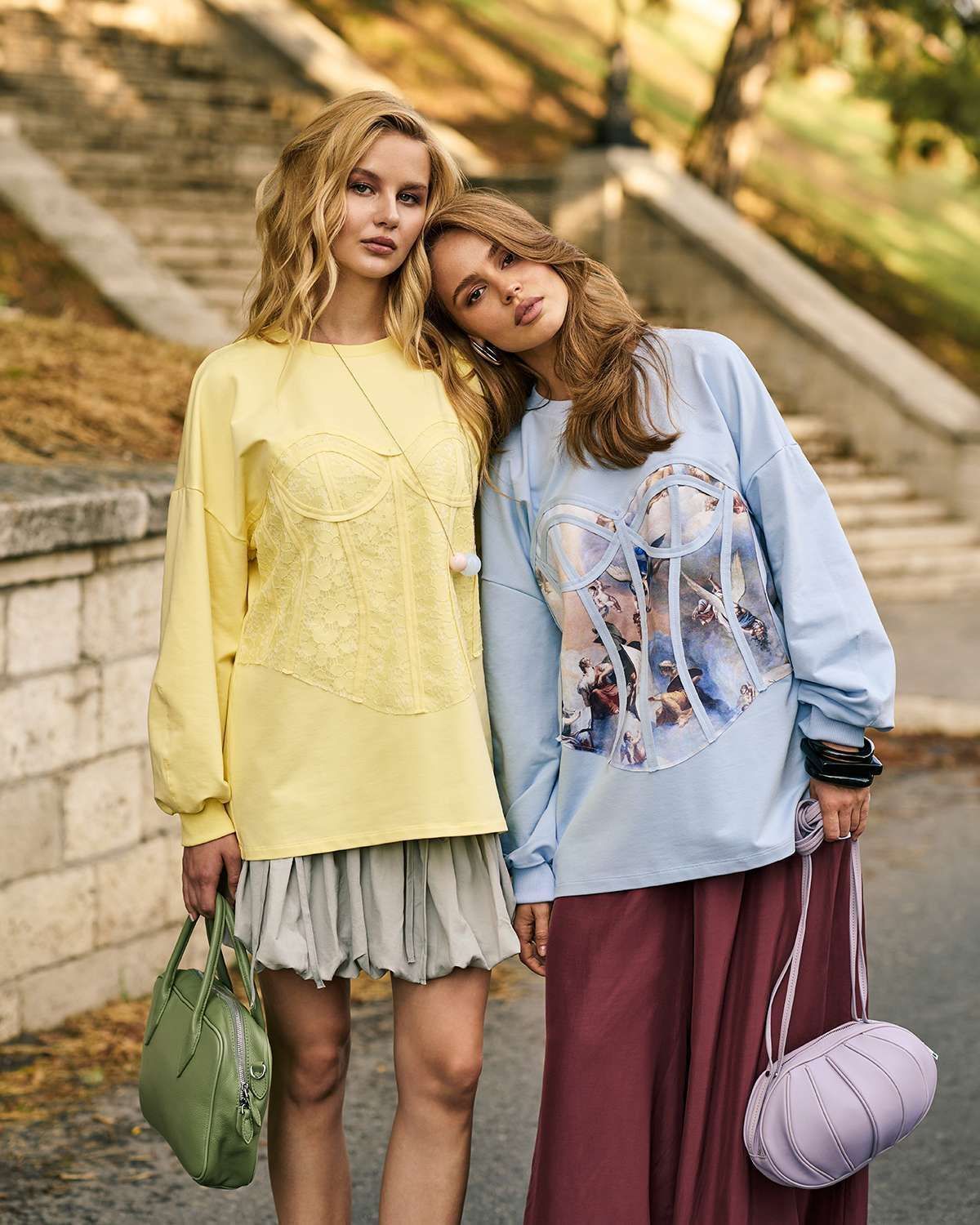 Cвитшот с имитацией корсета. Свитшот имеет свободный крой, что делает его комфортным и универсальным для различных образов. Длинные рукава с манжетами придают аккуратный и завершенный вид. Декоративные элементы на груди и талии подчеркивают фигуру, добавляя элегантности.